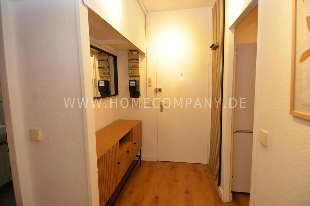 The newly renovated bathroom features a walk-in shower and a washing machine. The separate, fully equipped kitchen comes with a dishwasher, large fridge-freezer, ceramic hob, oven, microwave, and complete kitchen inventory, leaving nothing to be desired. The light-flooded living and sleeping area is tastefully furnished with a comfortable double bed (1.40 x 2.00 m), a spacious sofa corner, and generous storage options.