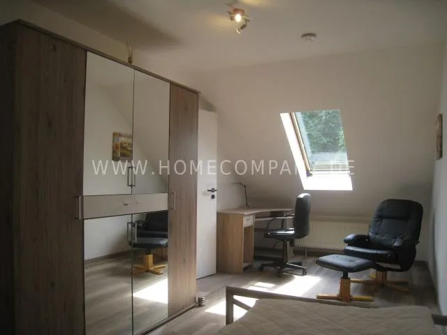 Bedroom with bed 100x200 cm (on request also larger bed), bedside table, wardrobe, desk with chair, reclining chair.
