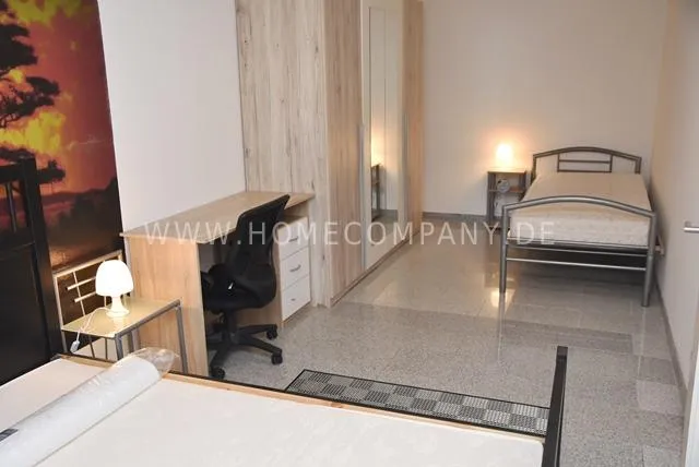 Bedroom with bed 180x200cm and 100x200 cm, bedside table, wardrobe, desk with chair, reclining chair.