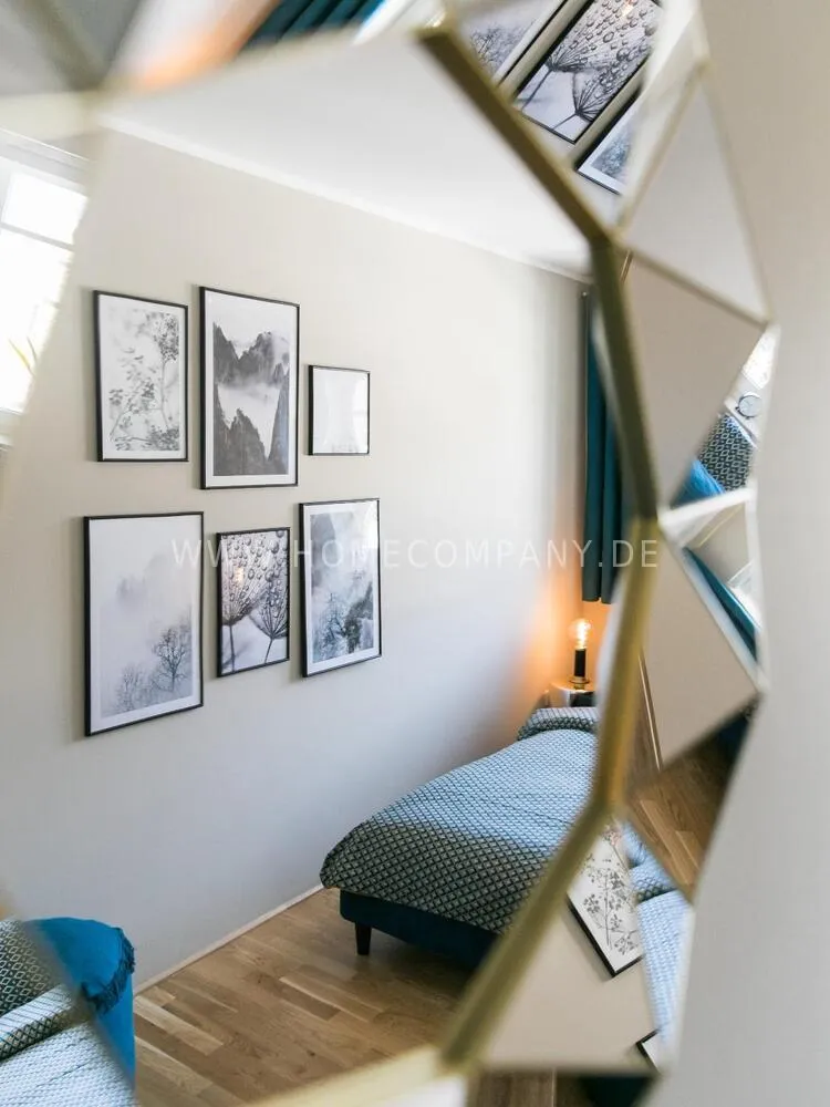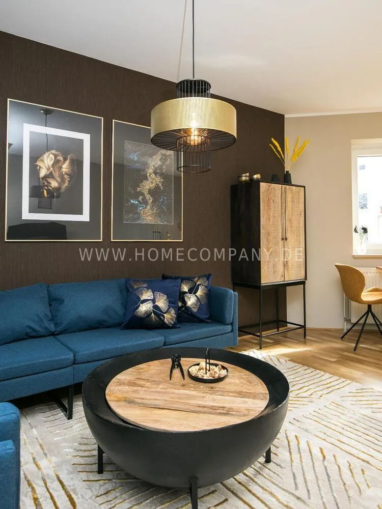In the heart of Hamburg Ottensen and within walking distance of the river Elbe - best location for this stylish business flat with a quiet balcony. The walls are in elegant beige-gray "Drop Cloth" from Farrow & Ball. The beautiful oak parquet and warm gold tones combined with elegant blue and black complete the ambience. The heart of the living room is the large sofa and the special 90 cm coffee table made of iron and mango wood. The black and gold hanging lamp is another real eye-catcher. The highboard made of fine mango wood is an extraordinary model for high living demands. The spacious interior with five compartments also offers plenty of space. The casual console sideboard in a cool look is made of steel, has a glass top and impresses with its unusual design.
