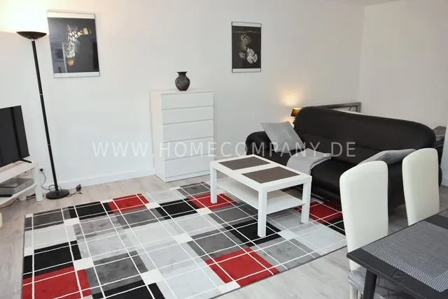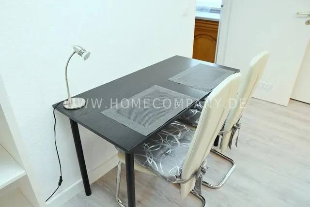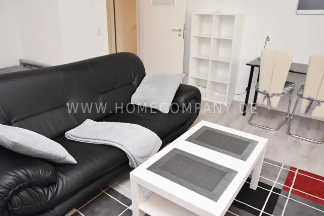 Living / bedroom with sitting room cupboard, 3er leather sofa (black), bed 140x200 cm, wardrobe, chest of drawers, coffee table, desk with 2 chairs, TV, shelves.