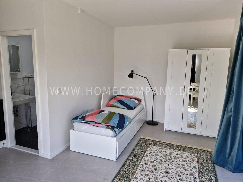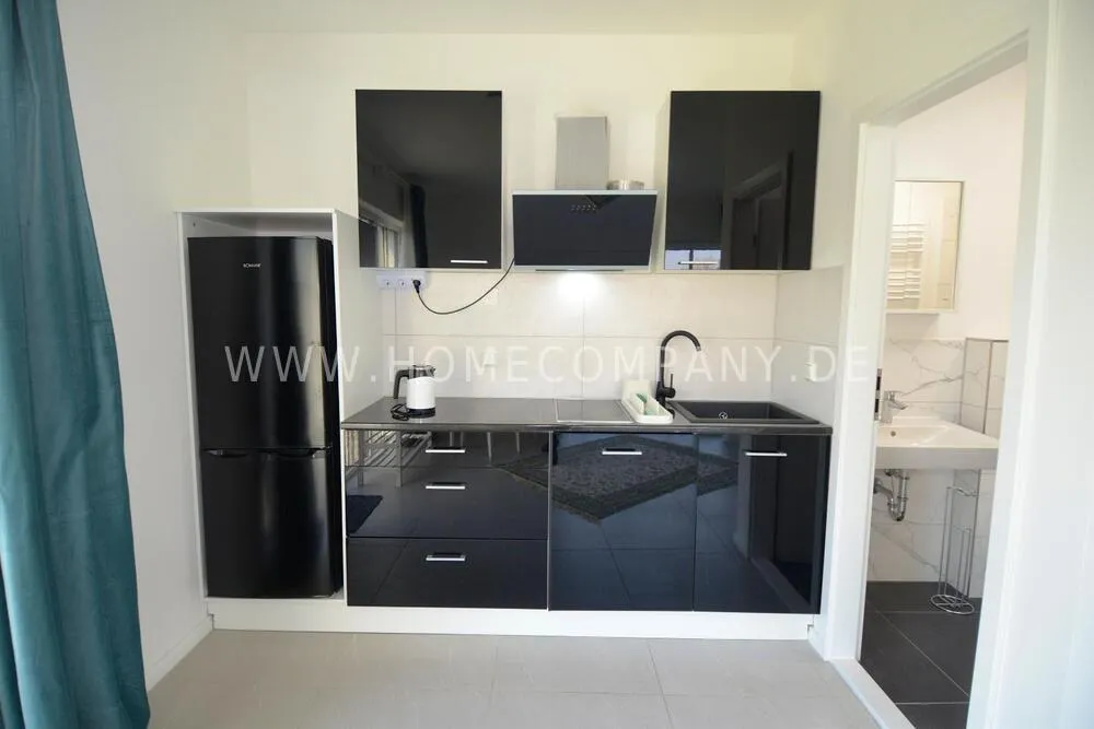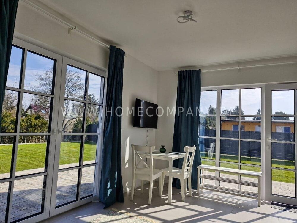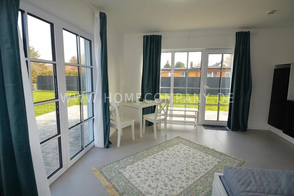 Living room with bed, table, closet, open kitchen. Very bright because two walls have floor-to-ceiling windows.