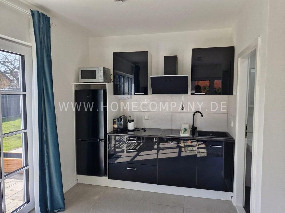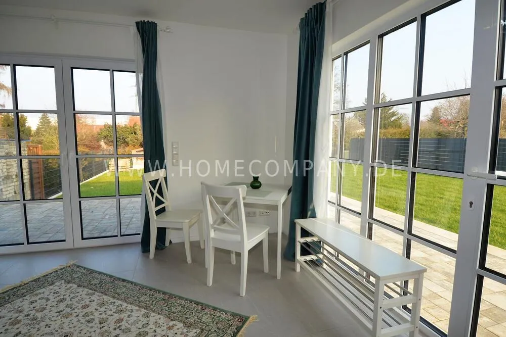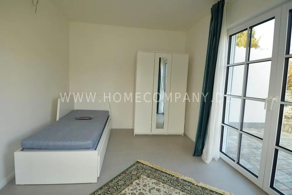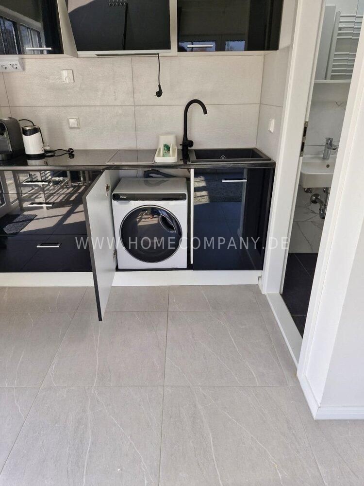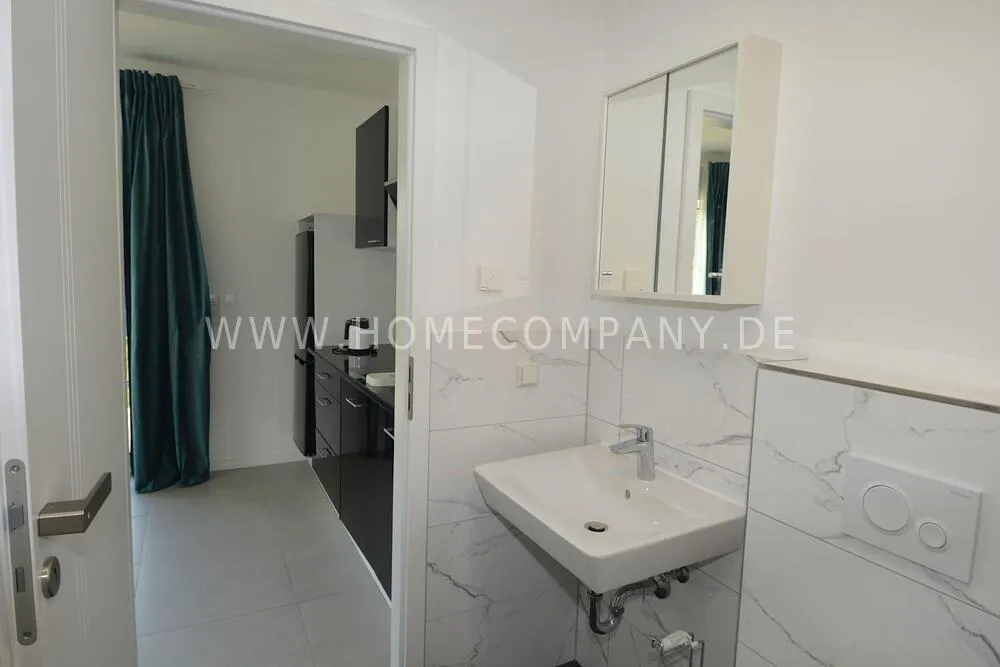 Living room with bed, table, closet, open kitchen. Very bright because two walls have floor-to-ceiling windows.