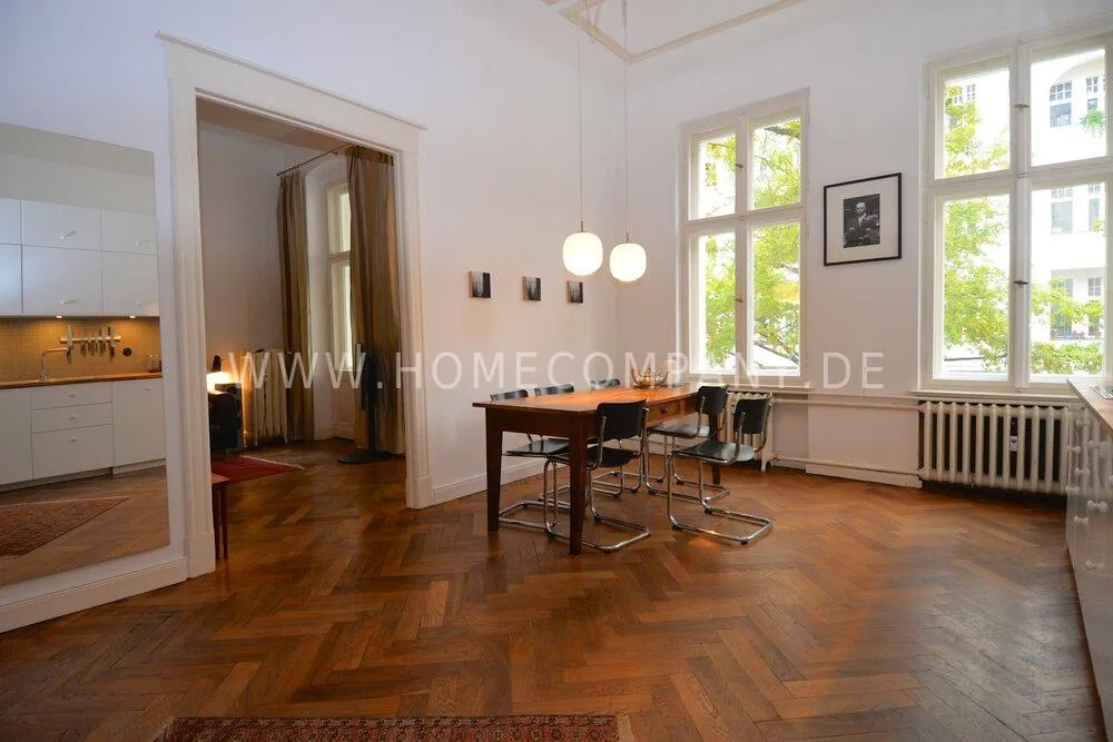 This tasteful and spacious period apartment is located in a quiet part of Schöneberg, just a short walk from Volkspark Wilmersdorf. Fully furnished, it features high ceilings, an open layout, and a bright, welcoming atmosphere. The heart of the home is the large living and dining area with a modern open kitchen and access to the balcony. In addition to the bedroom with a walk-in closet, there is a study with a sofa bed and a guest WC. Situated in an elegant and friendly building community, this apartment is perfect for anyone who values stylish living in a peaceful, green neighborhood.
