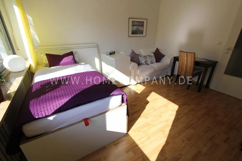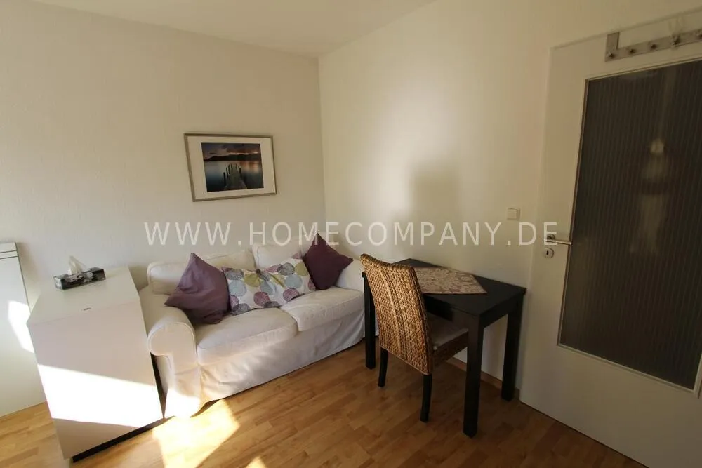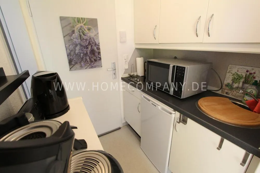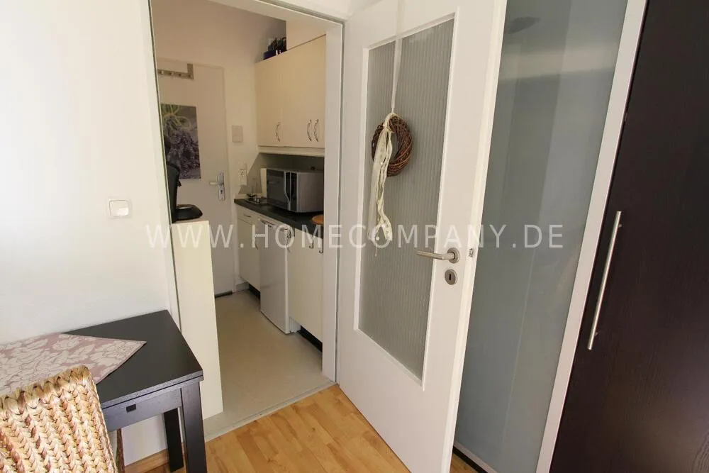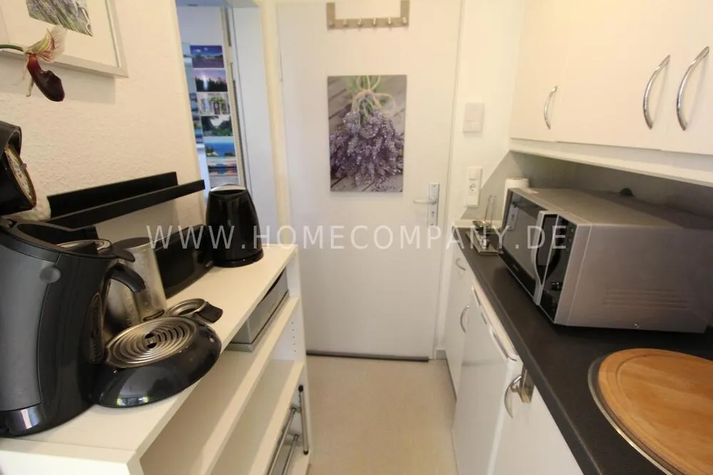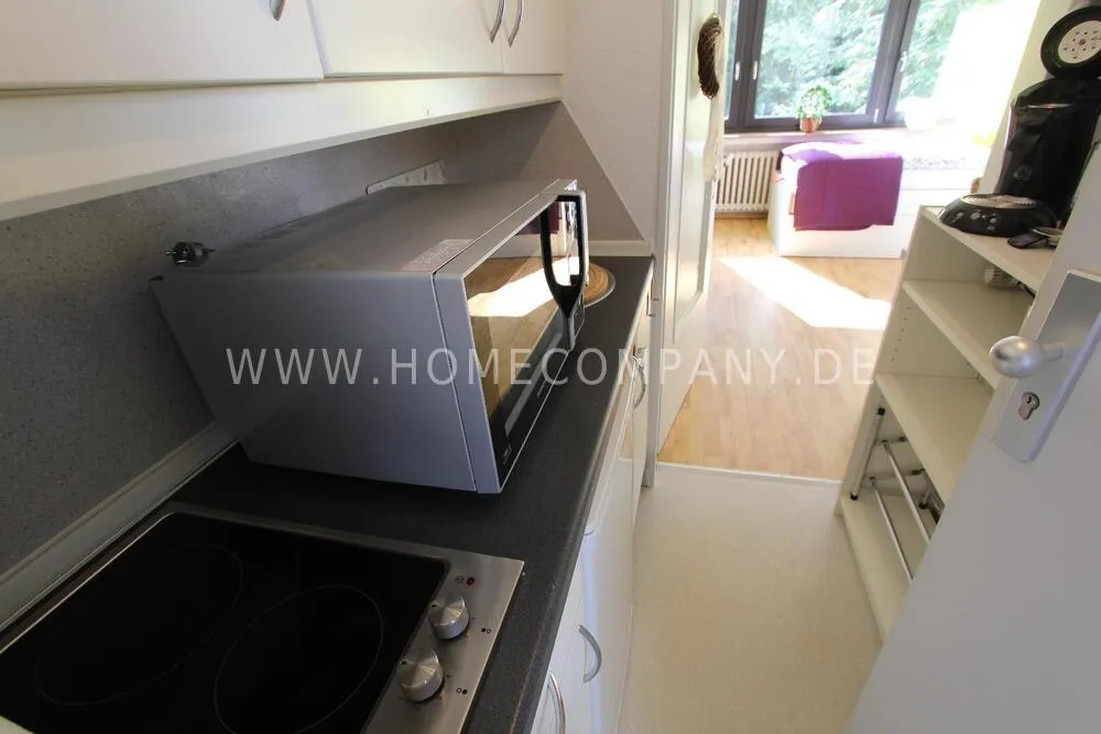 Newly renovated small apartment located in an apartment, living room with garden views, timeless furnishings, small kitchenette in the entrance