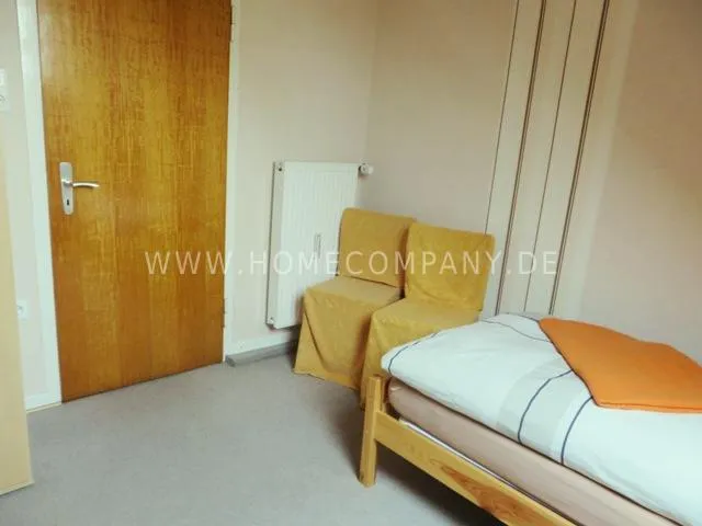 Bedroom with single bed, wardrobe, bedside locker, small table, chair, linoleum, 2 small carpets.