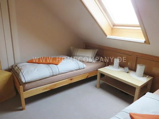Bedroom with 2 single beds, wardrobe, table, to 2 chairs, carpeted floor.