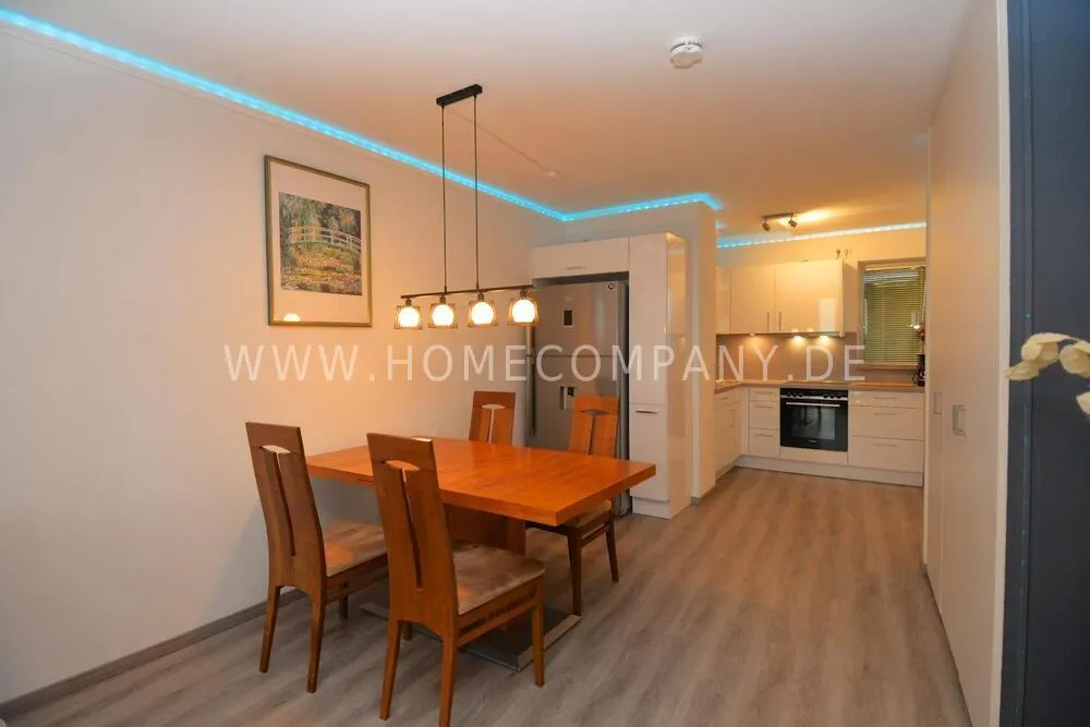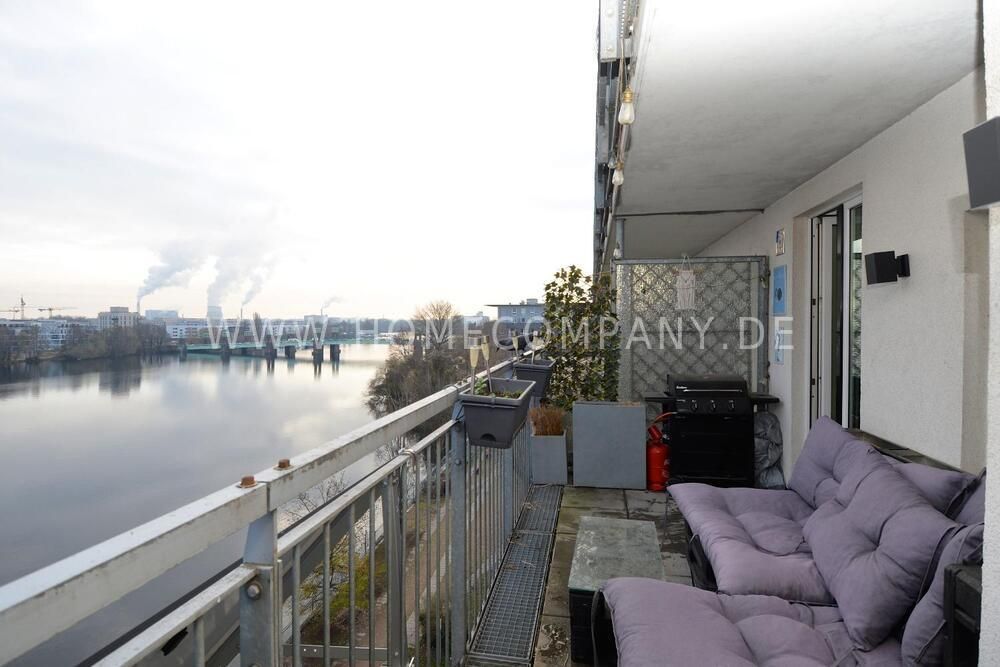 A true highlight is the spacious terrace with a stunning view of the Havel River, creating a wonderful atmosphere at any time of day. The open-plan kitchen, designed in elegant white, is fully equipped, including a large refrigerator with an ice-crush function. The living area features a cozy sofa and a smart TV, perfect for relaxing.