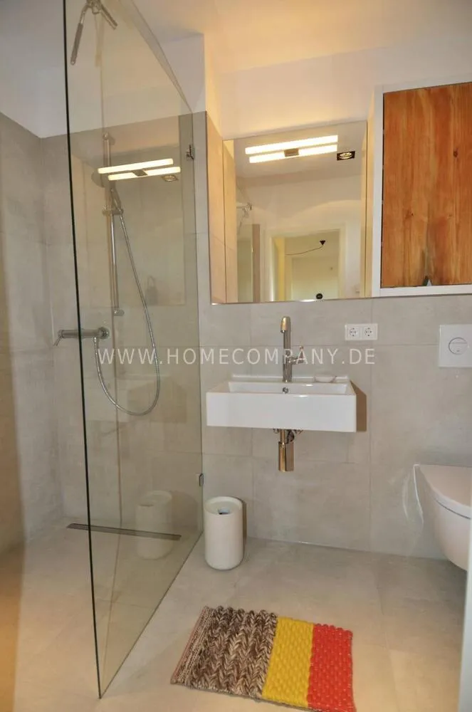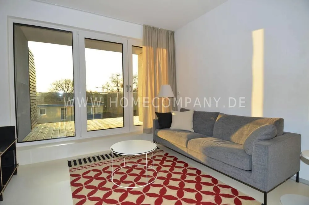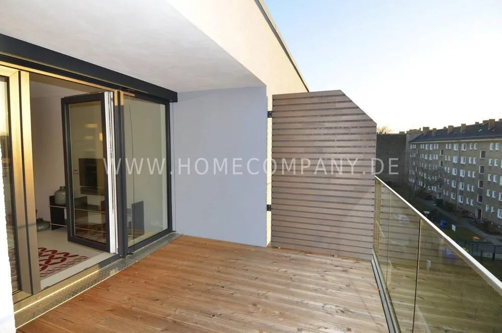 Gorgeous, top floor 1-bedroom apartment in Pankow, right next to Prenzlauerberg. This freshly renovated, modern property comes with design furniture and comprises a beautiful bedroom with a doublebed and a large fitted wardrobe, a sunny open plan kitchen-living room with flatscreen TV, fold-out sofa bed and dining table. The apartment highly benefits from a large 17m2 partially covered terrace with awesome views, Internet and washing machine. Bedlinen, towels, cutlery and crockery are available and there is also a storage room with a dryer. An underground parking space, just 100 m away from the apartment can be rented out on request.