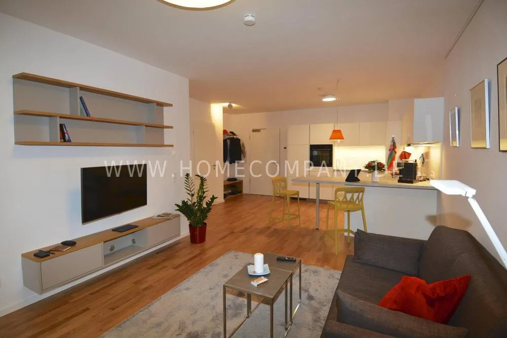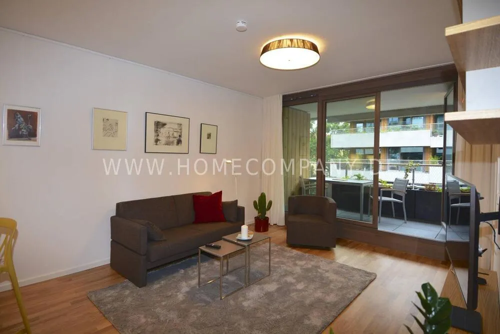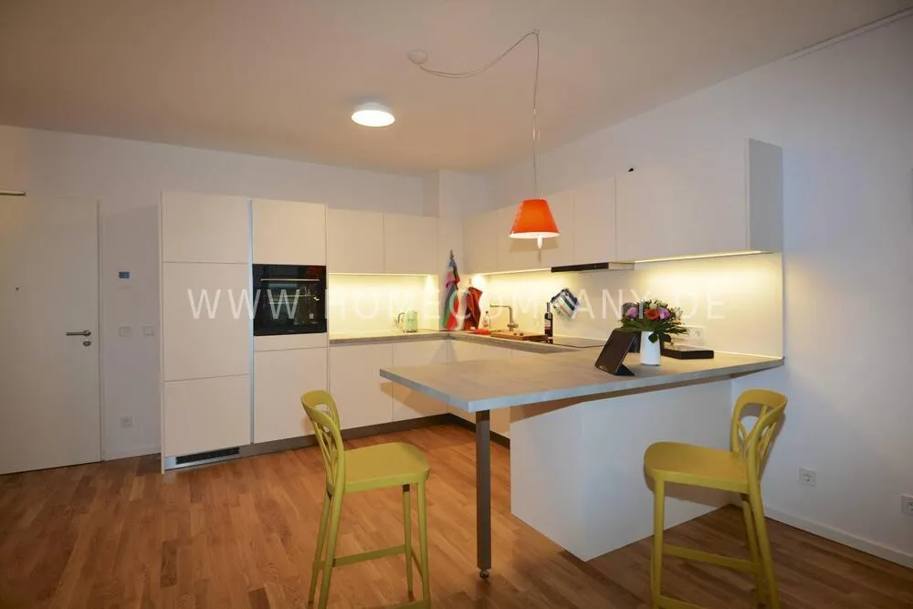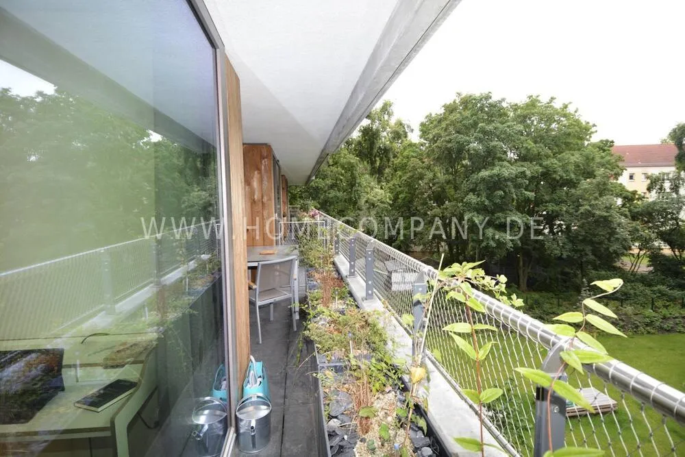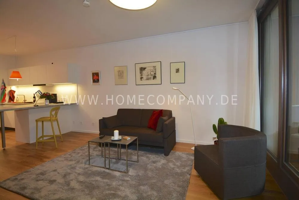 Comfortable, modern furnished 2-room apartment in Pankow. Fully equipped. Spacious living room with open fitted kitchen with dishwasher. Cozy living room with sofa and flat screen TV and access to the balcony. Modern tiled bathroom with walk-in shower cubicle and modern fittings. Bedroom with floor-to-ceiling windows and access to the balcony. The wardrobe offers plenty of storage space for clothes. Large balcony with seating.