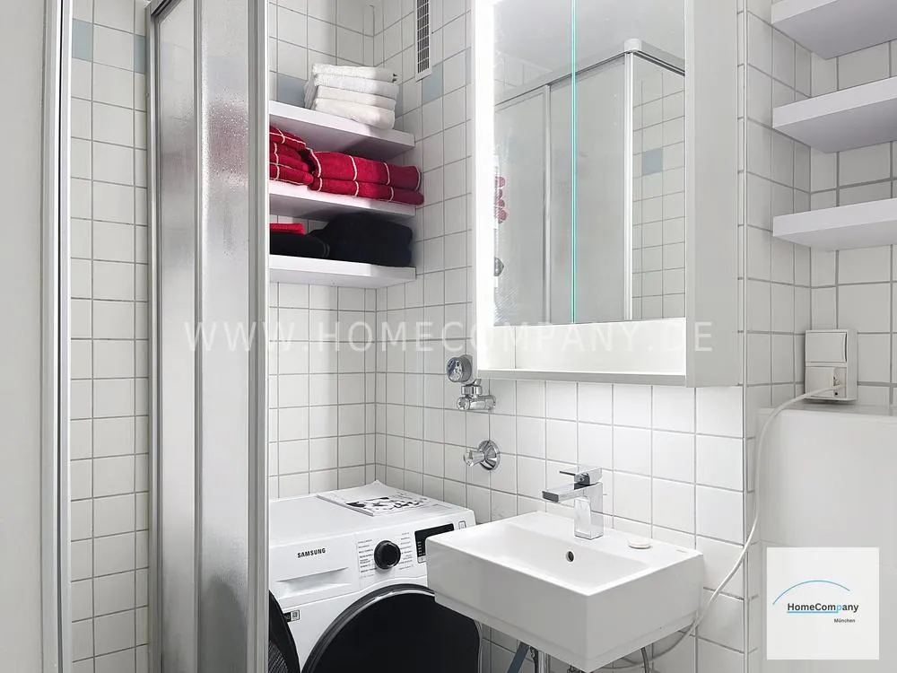 The separate, white kitchen has a window and is equipped with high quality products inkluisve waschingmaschine and everything for daily use. Timelessly tiled bathroom with shower and shelving system for beauty products, towels etc.