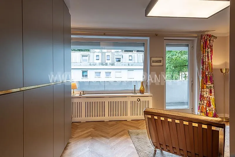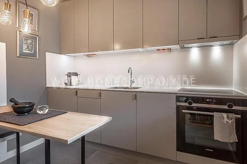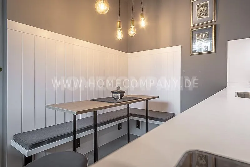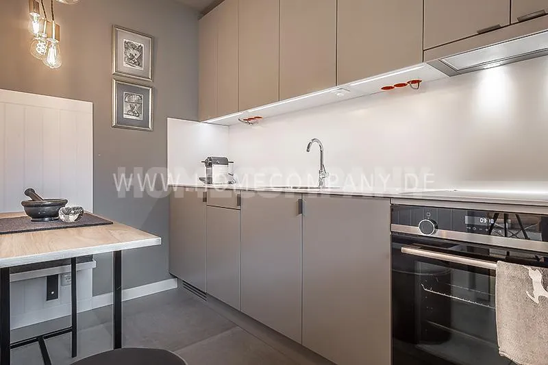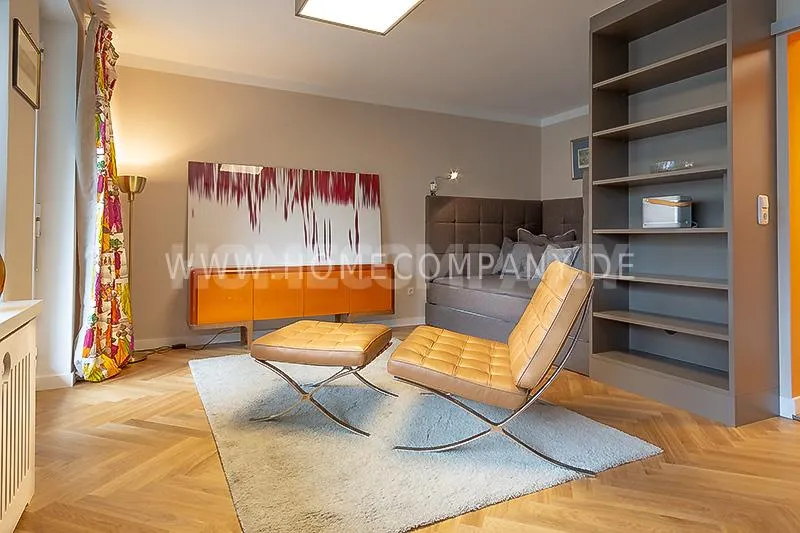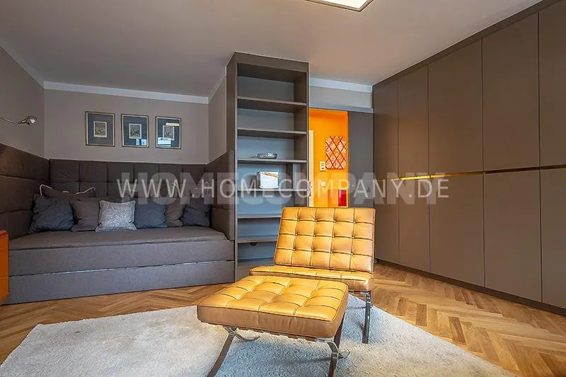 Beautifully and modernly furnished 1-room-apartment with balcony in Bogenhausen. 1st floor with lift. The living/bedroom is equipped with high-quality design pieces and offers sufficient storage space due to a timeless built-in wardrobe with sliding doors; from here access to the spacious balcony. The new, classy anthrazite coloured kitchen has a lot of amenities: all utensils for daily use (e.g. a dishwasher, coffee maker etc.), as well as a comfortable dining corner for up to 4 persons.