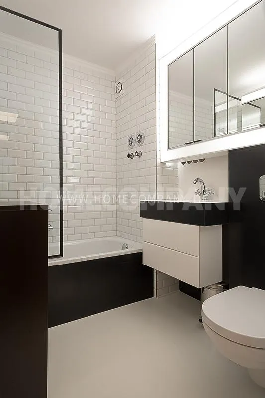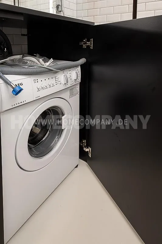 The timlessly black-white designed bathroom has a tub/shower-combination, sufficient storage space and an own washing-machine.