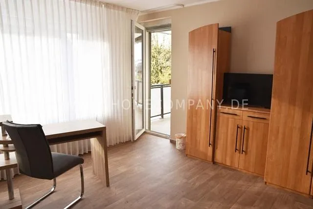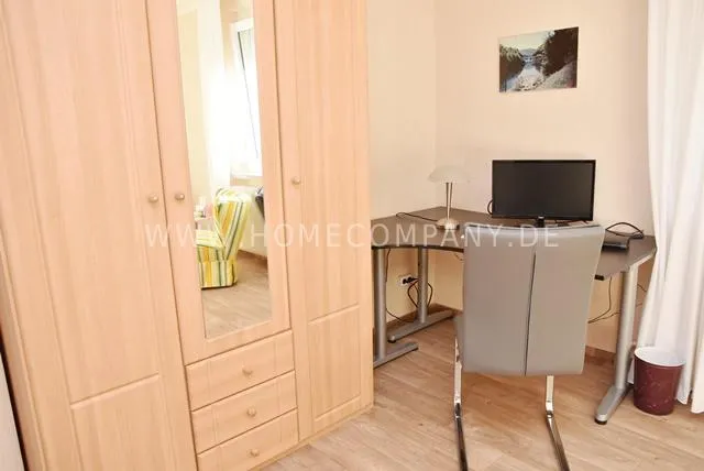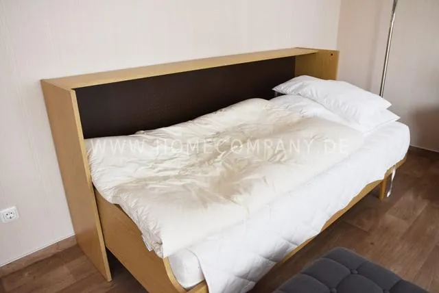 1st living / bedroom with sofa bed 160x200 cm, coffee table, desk with chair, wall unit with cable TV, Murphy bed 90x200 cm, laminate, access to
