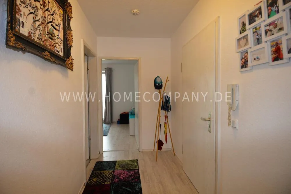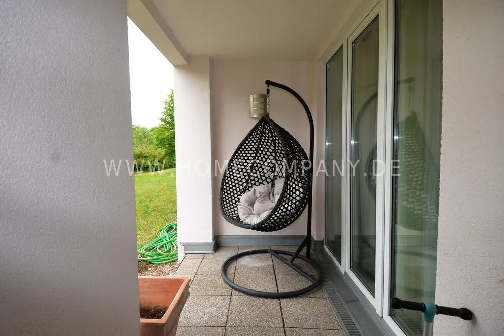 A highlight of the apartment is the terrace with a balcony area, where a comfortable rocking chair invites you to relax outdoors. The hallway provides additional storage space with a practical shoe cabinet.