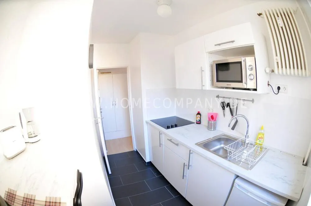 Extensively equipped kitchen with refrigerator, ceramic hob and microwave, coffee maker, toaster, crockery and cutlery.