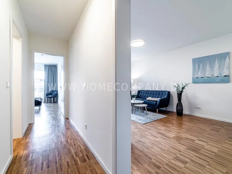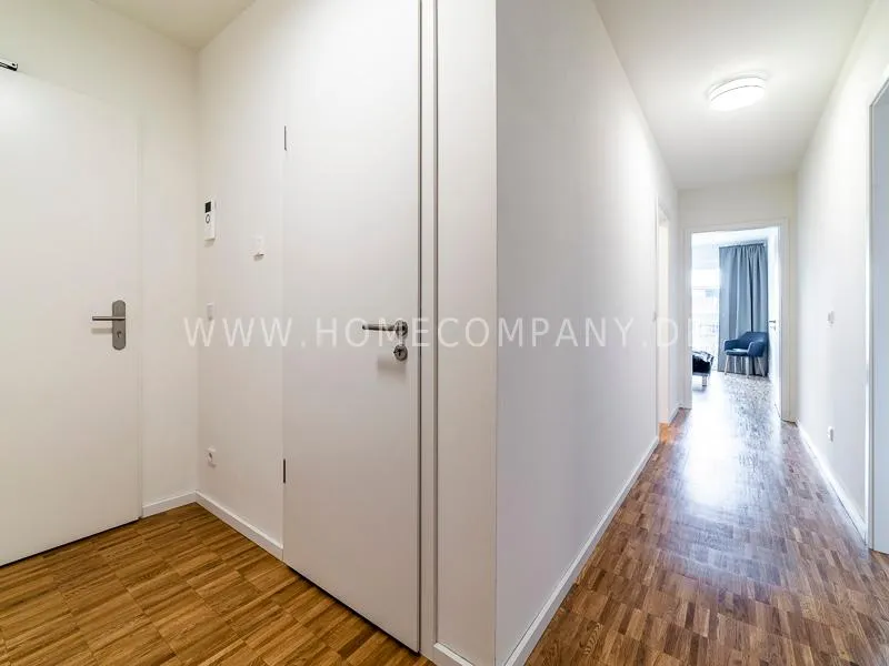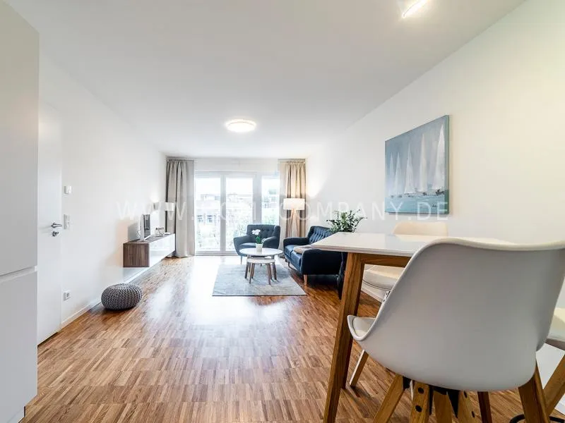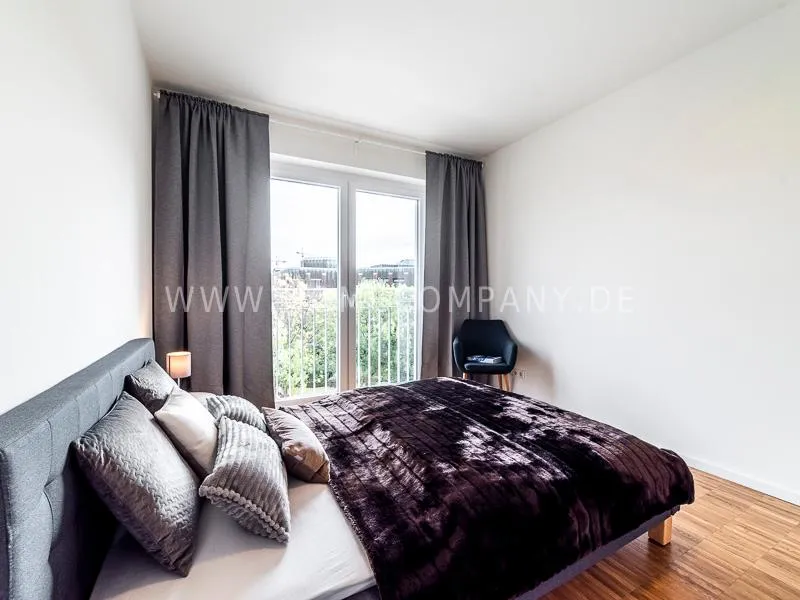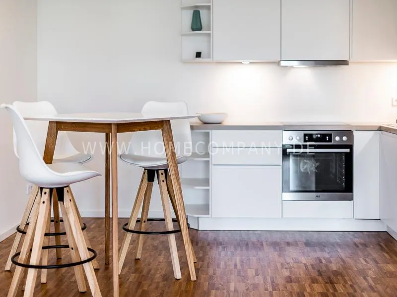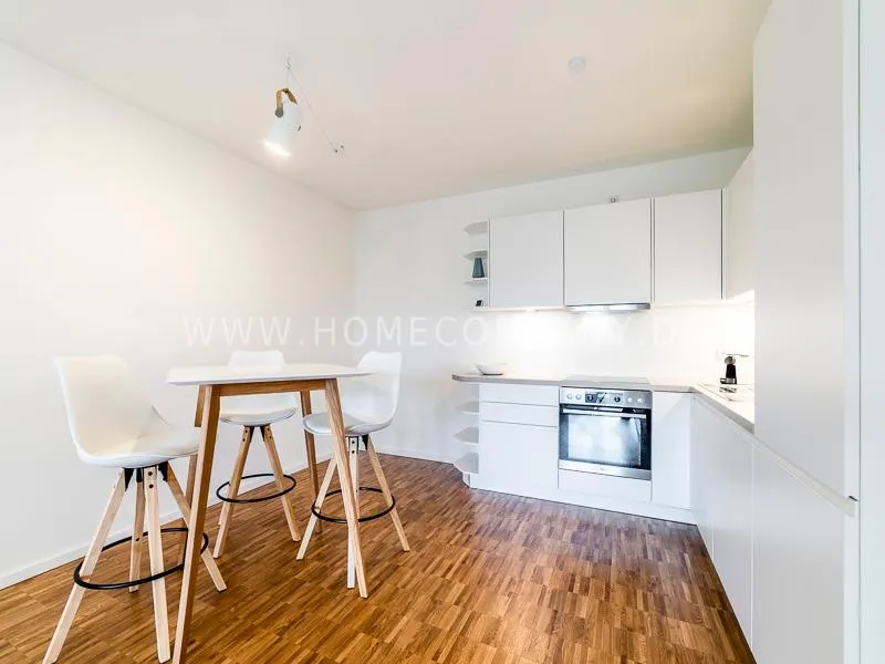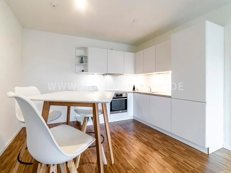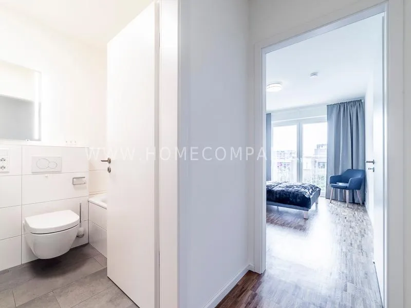 Bright and friendly furnished business flat with a sunny balcony overlooking the canal. The well thought-out floor plan typical of a new building, the floor-to-ceiling windows, underfloor heating and parquet flooring ensure pleasant living comfort. The apartment has a fully equipped "Nolte" fitted kitchen, which is directly adjacent to the dining area. There is a WiFi-enabled LED & Full HD Smart TV from LG in the comfortably furnished living room. In addition to a 1.40mx2m bed, the bedroom offers a spacious wardrobe and a great view of Hamburg's most beautiful tributary of the Elbe, called Bille, as well as the wonderful morning sun to wake up. The bathroom impresses with an oversized illuminated crystal mirror by Zierath, a glass shower cubicle by "Oberwasser" and a large bathtub. The washing machine is in the utility room.
