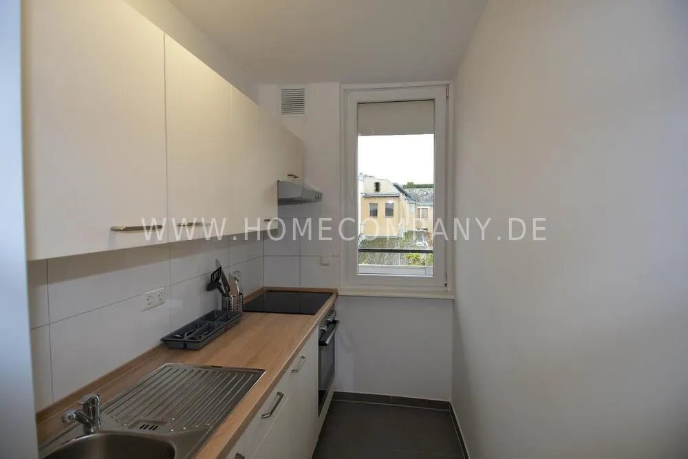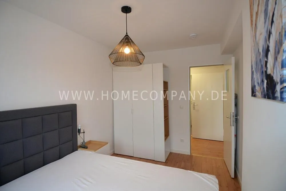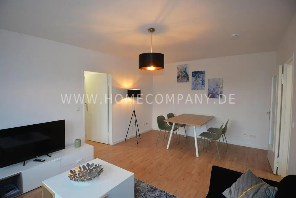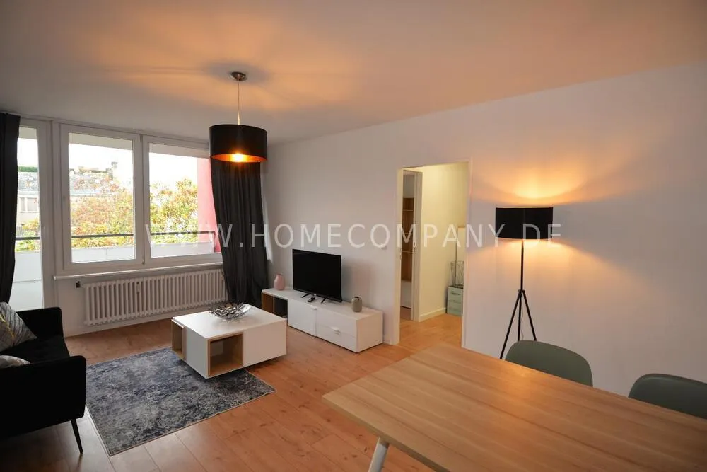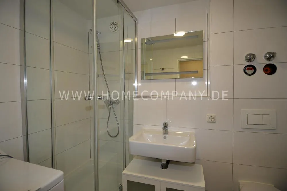 Living room with couch, table and dining area and access to the large balcony. Bedroom with box spring bed and closet. Modern tiled bathroom with shower and washing machine. The large hallway offers plenty of storage space. Large balcony with seating.