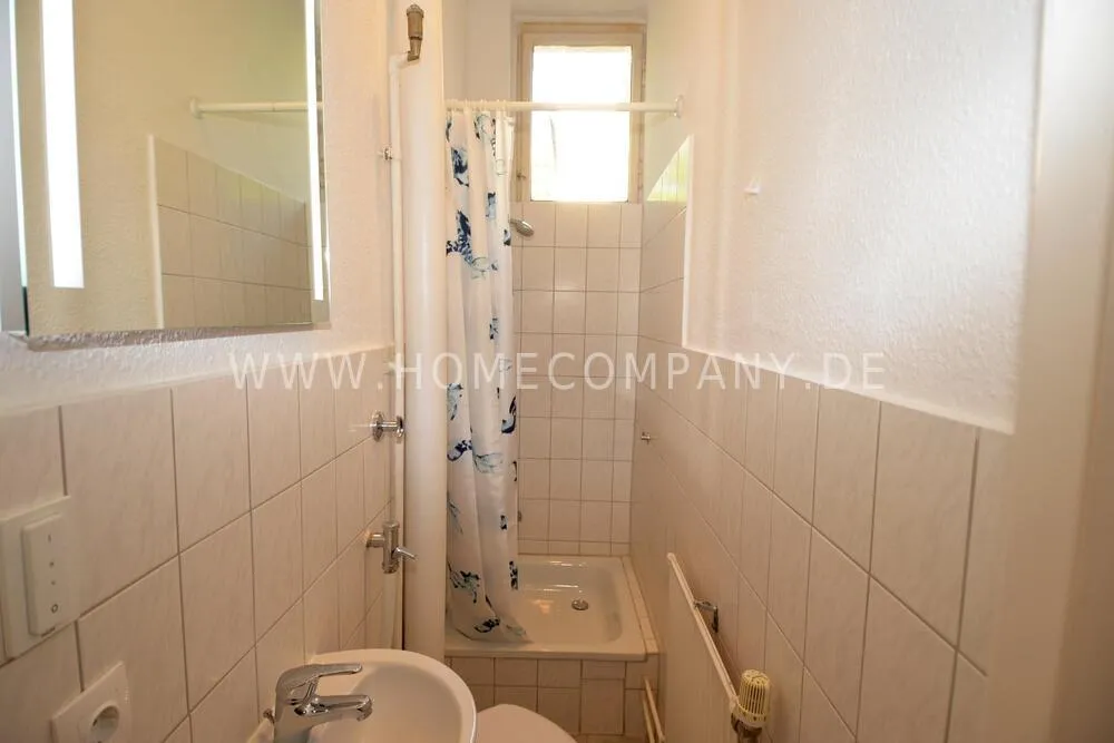 Fully furnished with bed, table and washing machine. Tiled bathroom with shower. The wardrobe is in the living room.