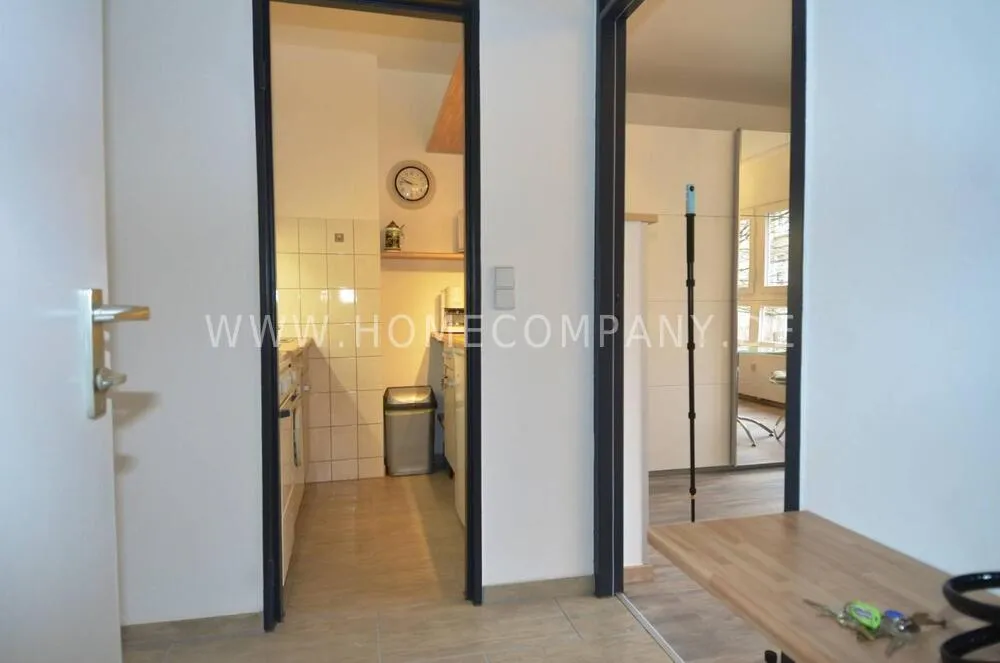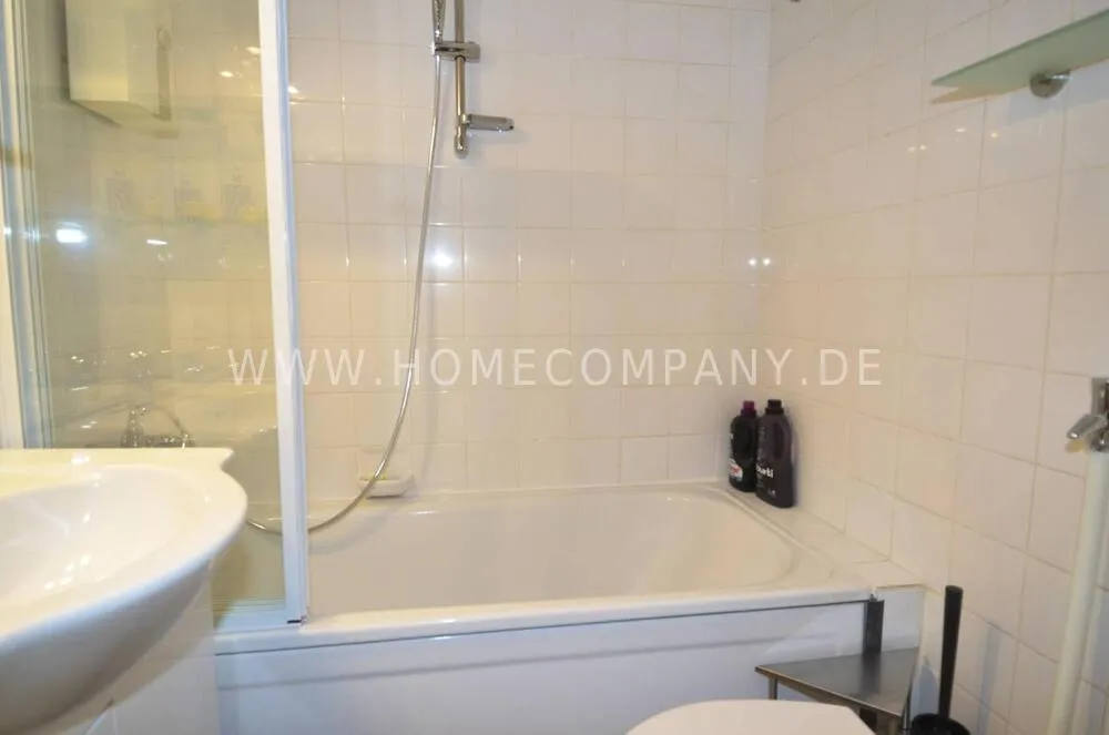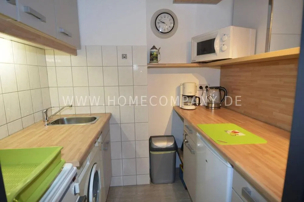This cosy, small and quiet studio flat is located in a sidestreet in the Steglitz center. It is completely equipped and offers a small fit-in pantry with a washing machine, refridgerator, oven and cook top. The studio room is furnished with a good fold-out sofa. The modern bathroom has a bathtub. The flat is well-lighted and benefits from a lift.