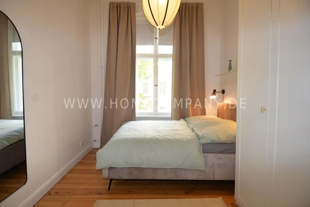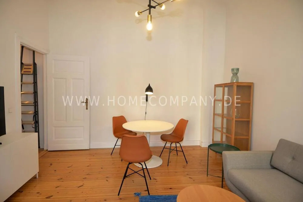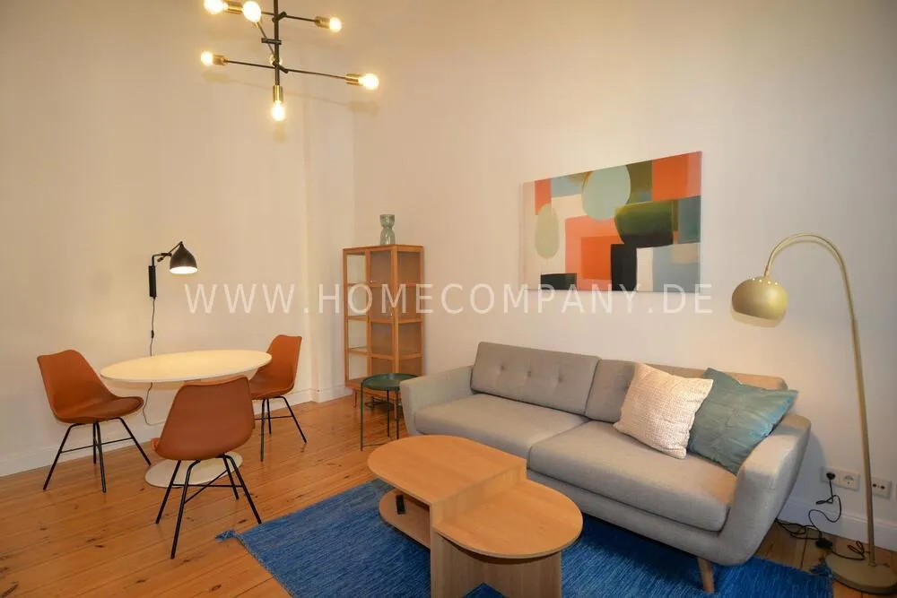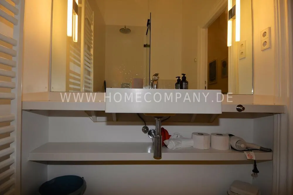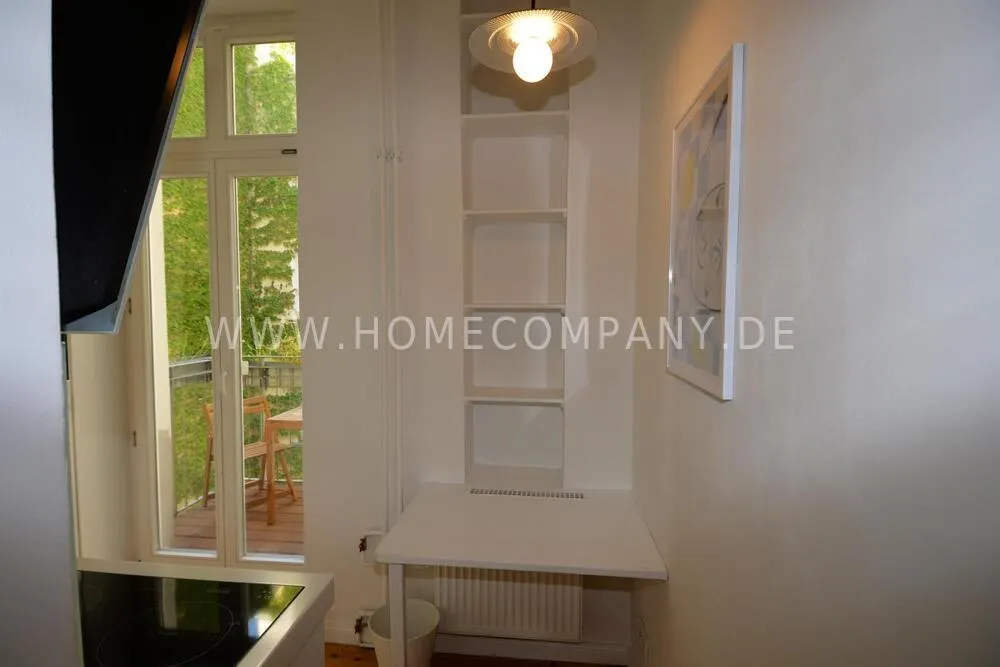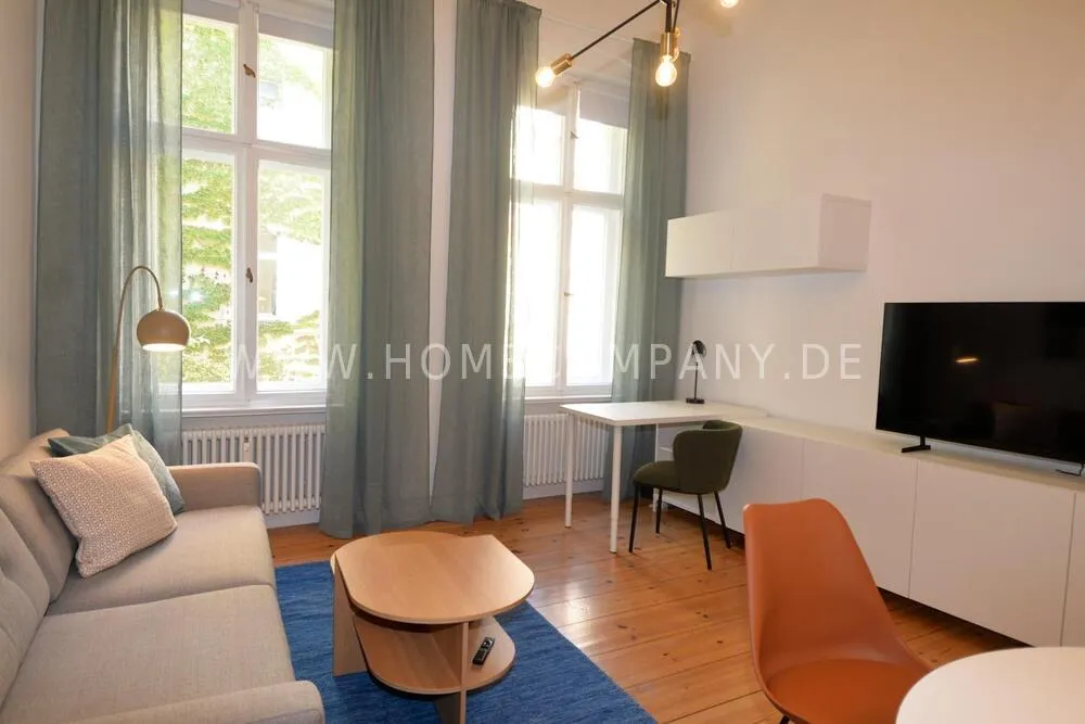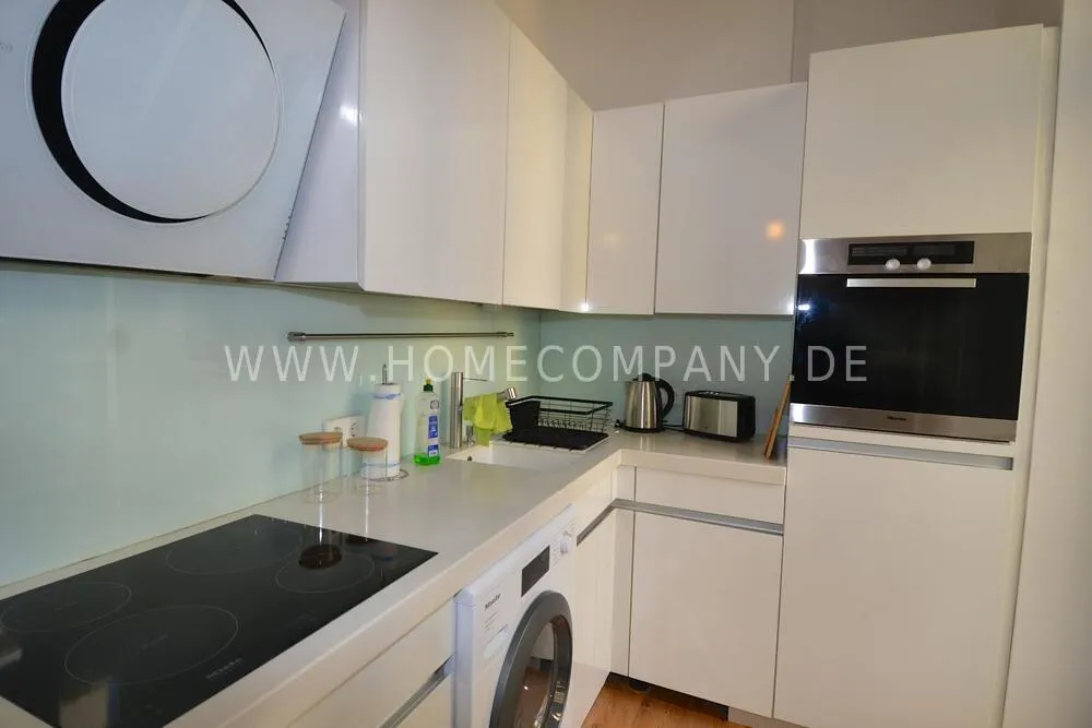 This bright, modernly furnished two-room apartment in the popular Berlin district of Charlottenburg is centrally located near Wilmersdorfer Straße and is available for first occupancy. A well-thought-out floor plan, high-quality furnishings, and stylish décor create a home where you can truly feel comfortable. The living room features a cozy sofa corner, a dining table, and a TV, making it the perfect place to relax or entertain. In the bedroom, you will find a comfortable double bed and a spacious wardrobe. The fully equipped kitchen offers everything you need for daily life and provides direct access to a sunny balcony - ideal for enjoying your morning coffee or unwinding in the evening. The modern bathroom includes a shower with a glass window, filling the space with natural light and creating a pleasant atmosphere. A high-quality Miele washer-dryer, fast internet, and the central location with excellent transport connections as well as a wide range of shops, cafés, and restaurants nearby complete this attractive offering.