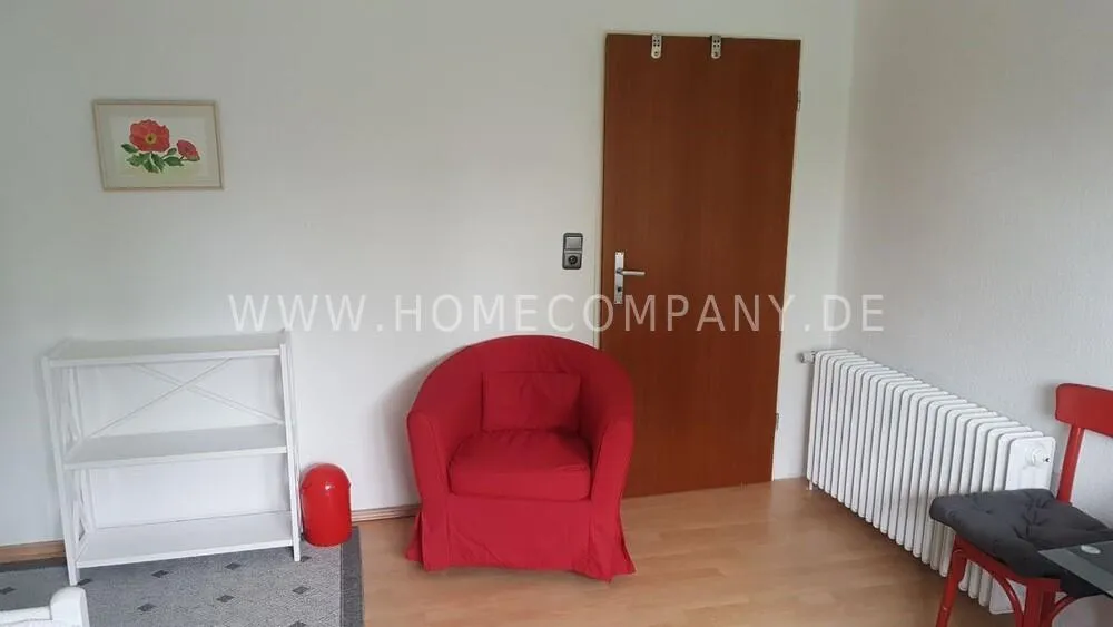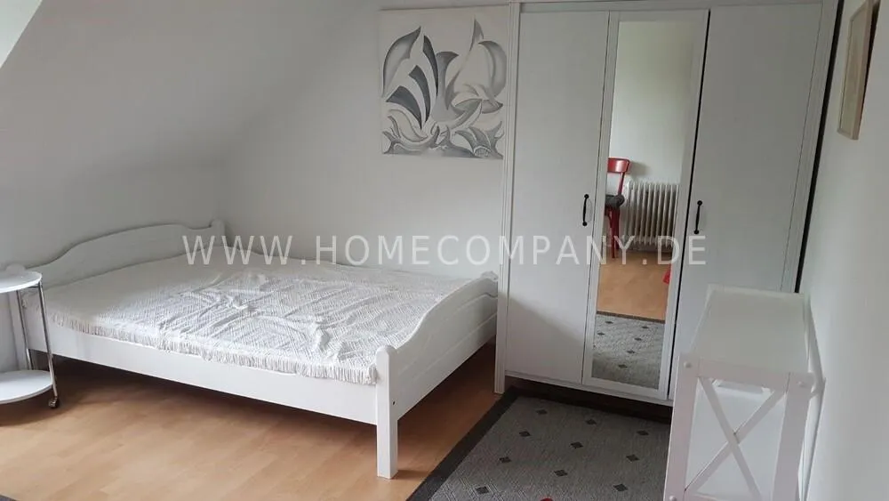 The room faces south and is furnished with a bed, wardrobe, desk, desk chair, armchairs and Wi-Fi. Bus stop in front of the house.