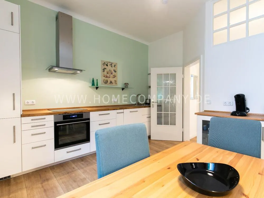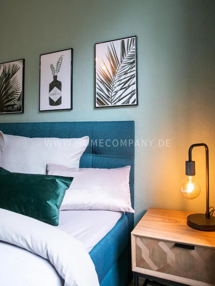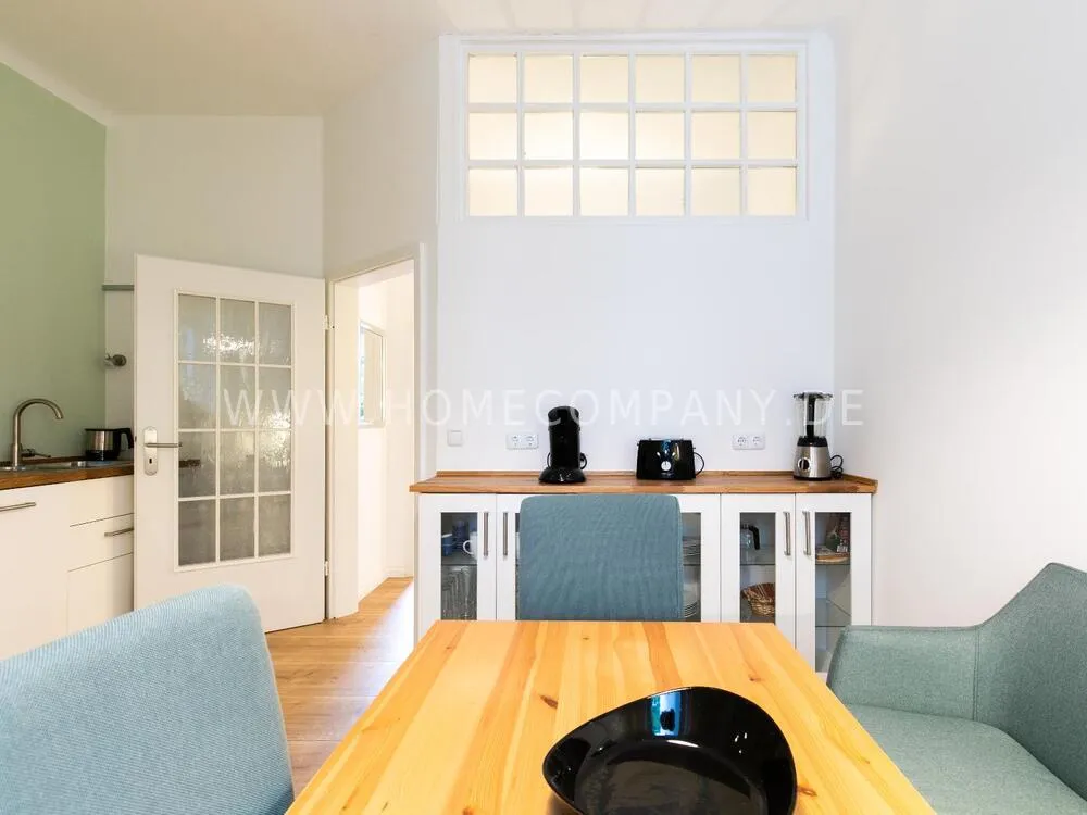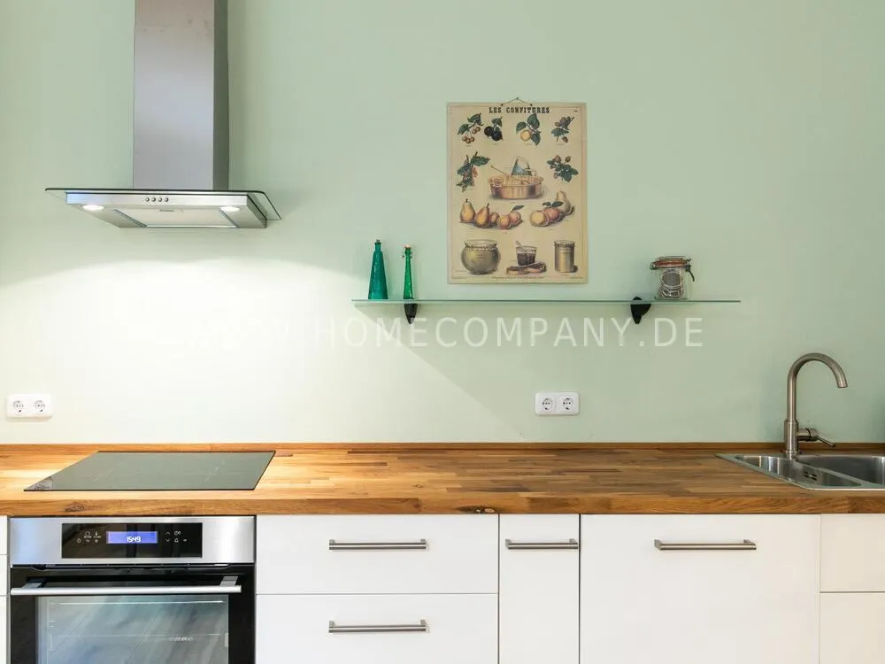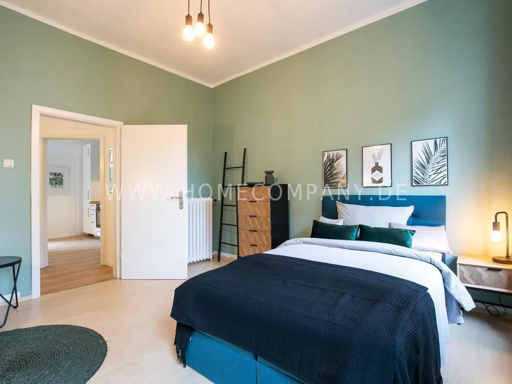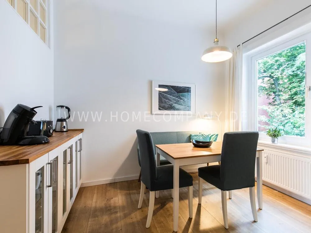 In this 48 sqm apartment with extra high ceilings and a bright, very spacious new bathroom with a generous walk-in shower, an oasis awaits you in a perfect combination between the elegance of the vintage style and the renewal of the industrial style. The large, bright eat-in kitchen is equipped with everything and invites you to linger. The walls are painted in Graham & Brown's Ferris Wheel - a muted shade of green with a rich fresh touch. The stylish interior convinces with furniture made of comfortable ash wood and black accents. The large, comfortable armchair in a luxurious gray velvet fabric is perfect for relaxing after a long day at work. An extravagant 1.20 x 2 m wide box spring bed in an unusual design and in cozy sea green ensures a high level of sleeping comfort with its high-quality Bonell spring core mattresses. It also offers additional storage space with bed drawers that can be opened on both sides. With the flat screen TV, some channels can be received via DVBT. Smart TV is also possible. The apartment is located in a quiet side street on the edge of the Schanzenviertel.