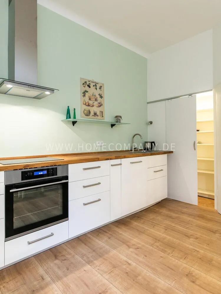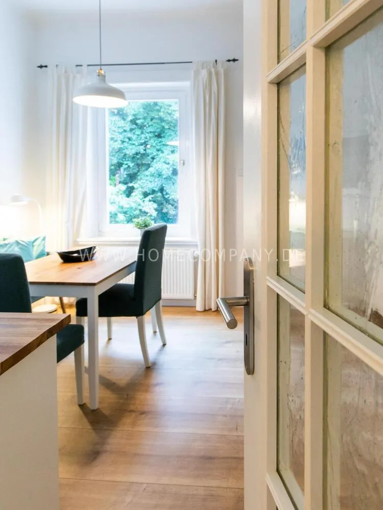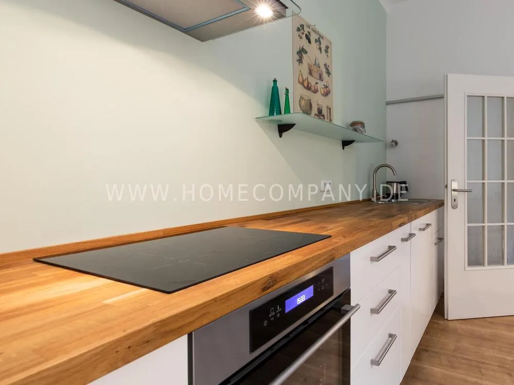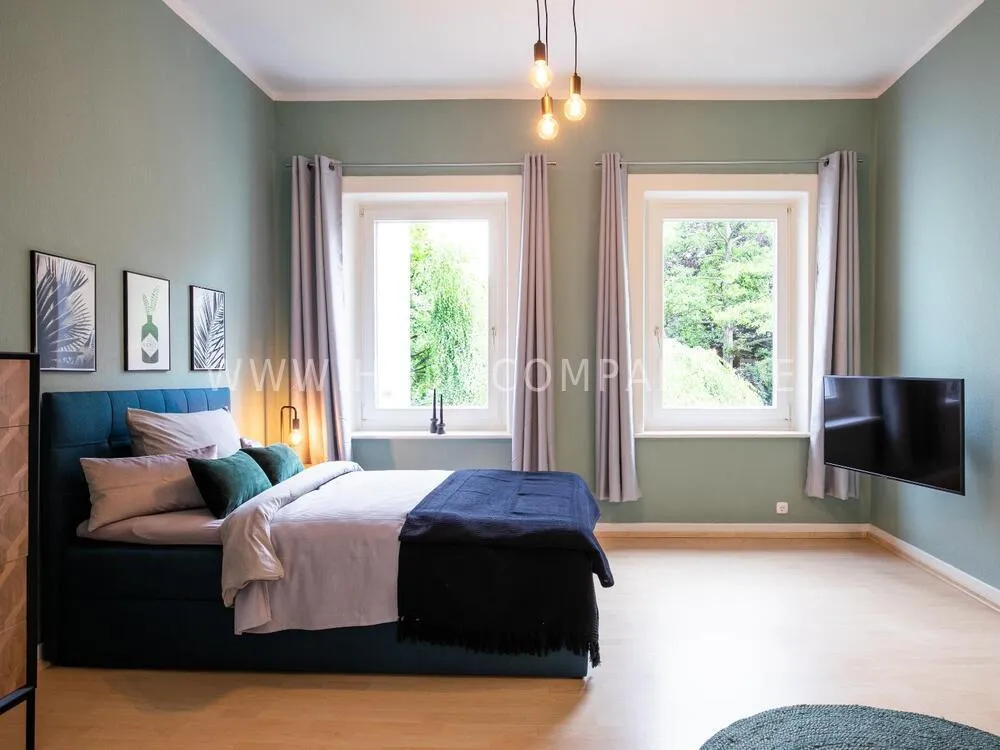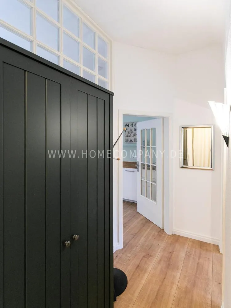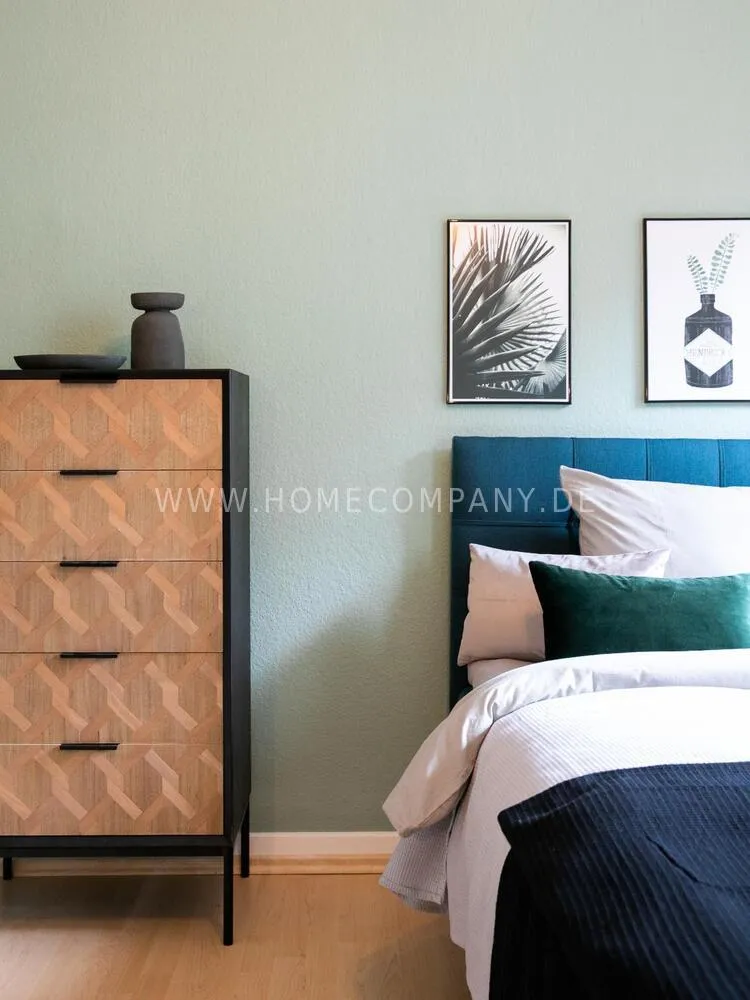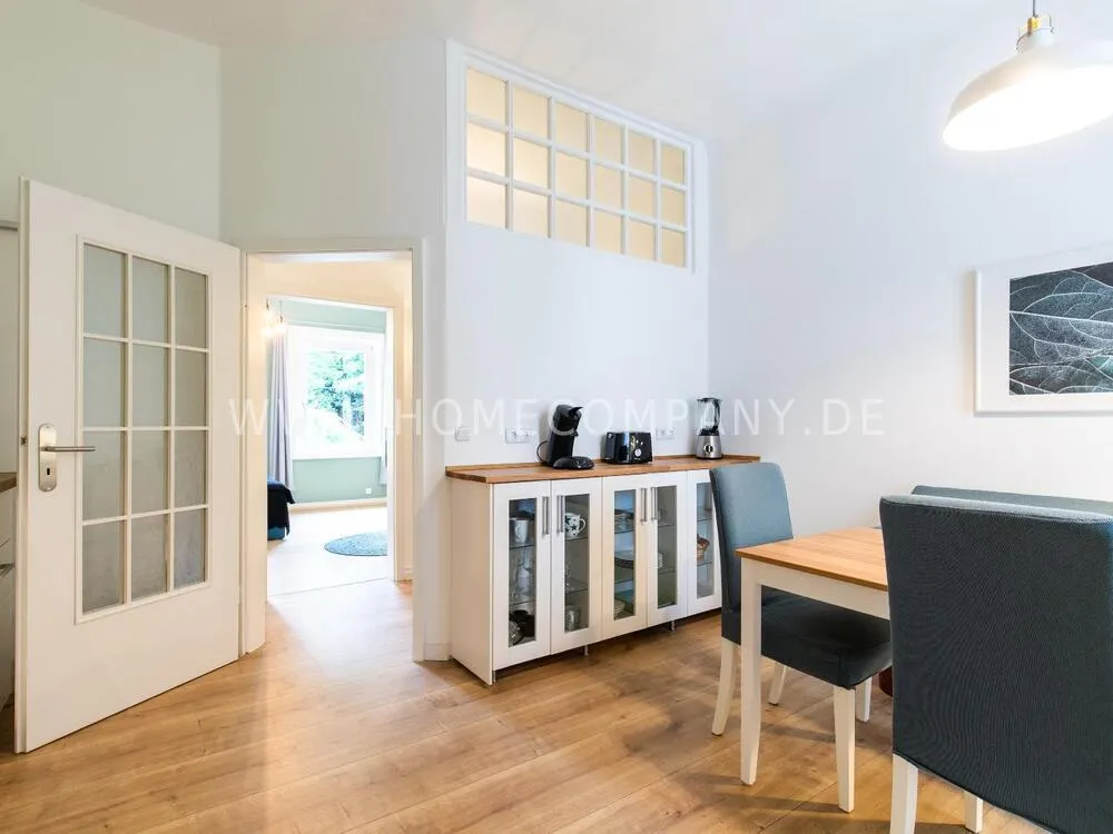 In this 48 sqm apartment with extra high ceilings and a bright, very spacious new bathroom with a generous walk-in shower, an oasis awaits you in a perfect combination between the elegance of the vintage style and the renewal of the industrial style. The large, bright eat-in kitchen is equipped with everything and invites you to linger. The walls are painted in Graham & Brown's Ferris Wheel - a muted shade of green with a rich fresh touch. The stylish interior convinces with furniture made of comfortable ash wood and black accents. The large, comfortable armchair in a luxurious gray velvet fabric is perfect for relaxing after a long day at work. An extravagant 1.20 x 2 m wide box spring bed in an unusual design and in cozy sea green ensures a high level of sleeping comfort with its high-quality Bonell spring core mattresses. It also offers additional storage space with bed drawers that can be opened on both sides. With the flat screen TV, some channels can be received via DVBT. Smart TV is also possible. The apartment is located in a quiet side street on the edge of the Schanzenviertel.