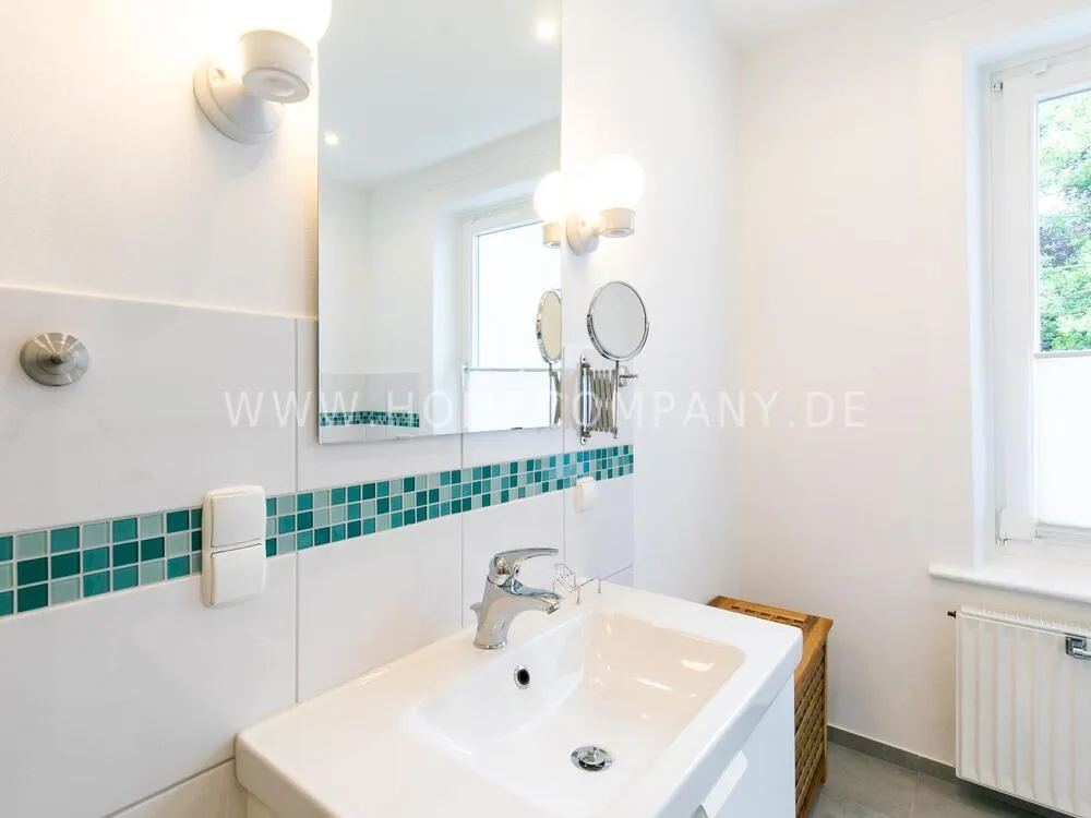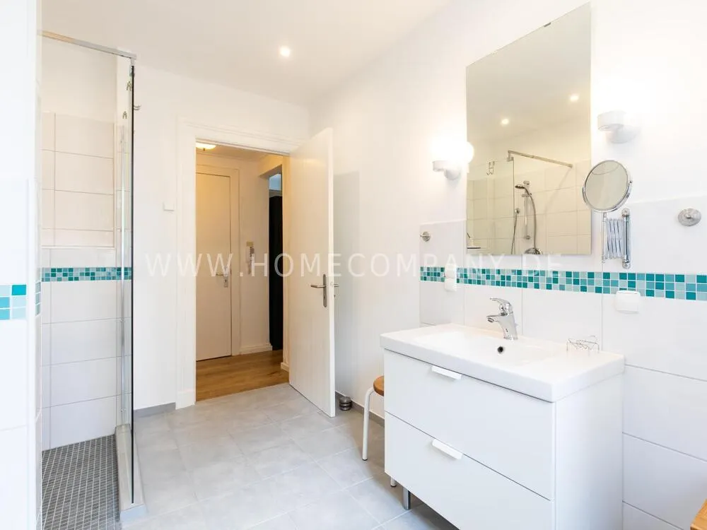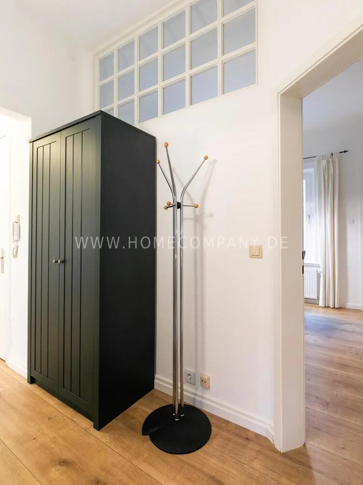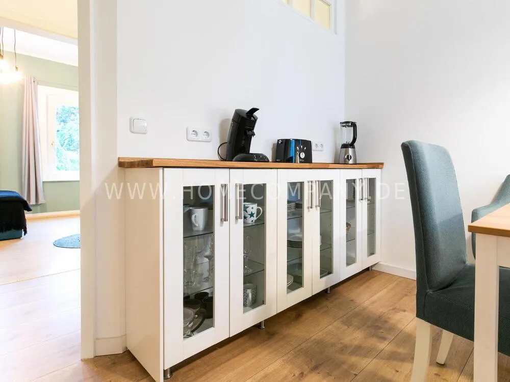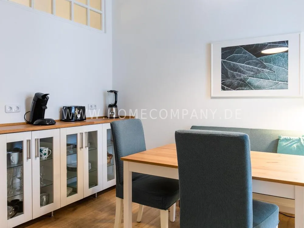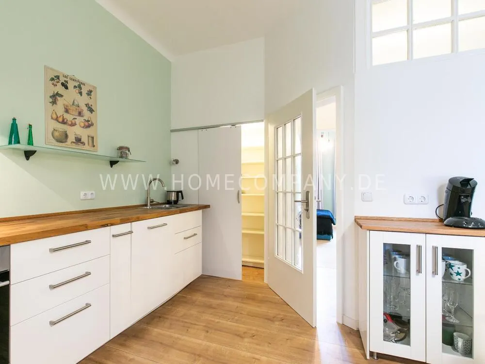 In this 48 sqm apartment with extra high ceilings and a bright, very spacious new bathroom with a generous walk-in shower, an oasis awaits you in a perfect combination between the elegance of the vintage style and the renewal of the industrial style. The large, bright eat-in kitchen is equipped with everything and invites you to linger. The walls are painted in Graham & Brown's Ferris Wheel - a muted shade of green with a rich fresh touch. The stylish interior convinces with furniture made of comfortable ash wood and black accents. The large, comfortable armchair in a luxurious gray velvet fabric is perfect for relaxing after a long day at work. An extravagant 1.20 x 2 m wide box spring bed in an unusual design and in cozy sea green ensures a high level of sleeping comfort with its high-quality Bonell spring core mattresses. It also offers additional storage space with bed drawers that can be opened on both sides. With the flat screen TV, some channels can be received via DVBT. Smart TV is also possible. The apartment is located in a quiet side street on the edge of the Schanzenviertel.
