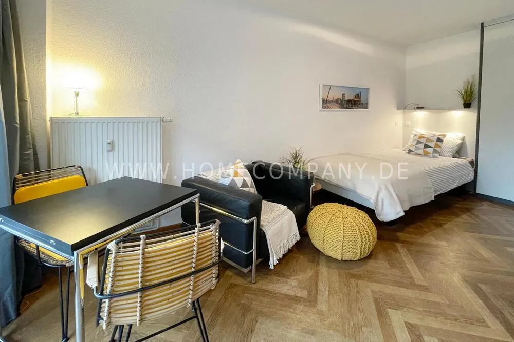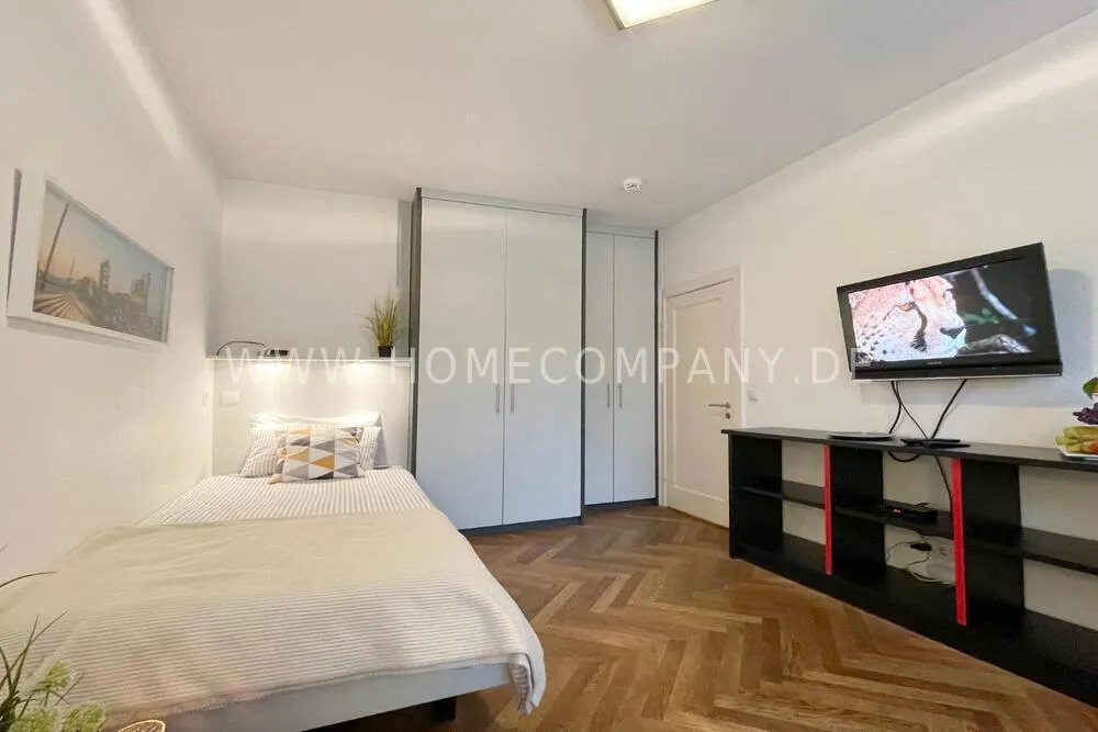 The real wood parquet floor provides a comfortable living atmosphere and stands in deliberate contrast to the modern furnishing. The bed has a size of 100 x 220 cm. There is a small balcony.