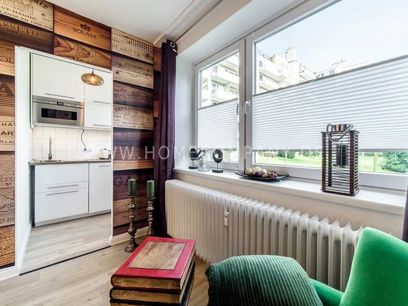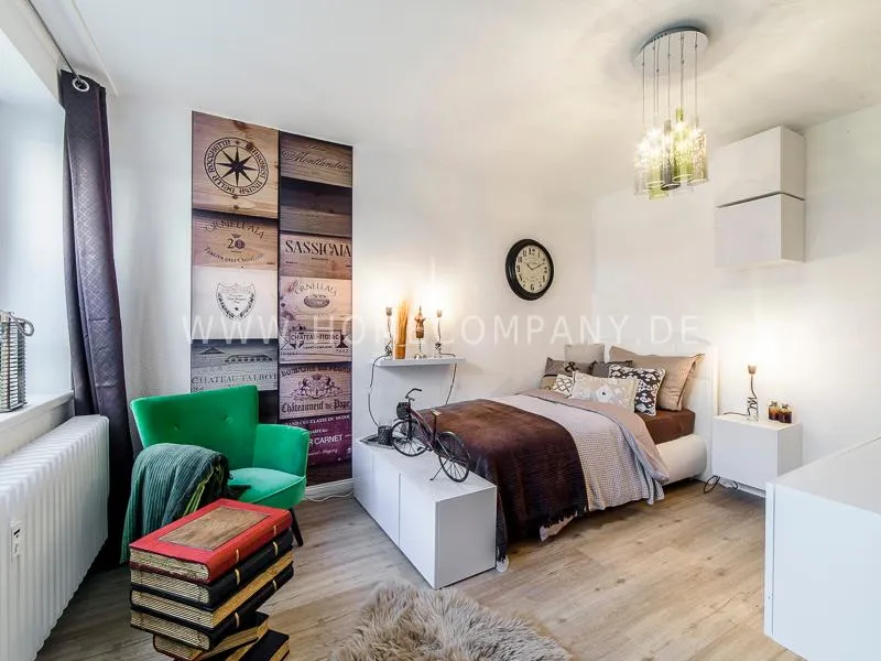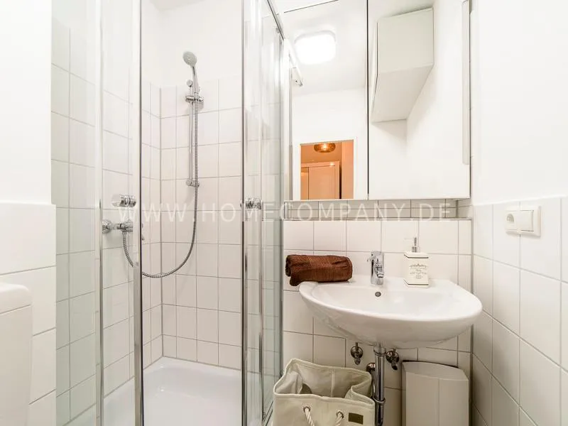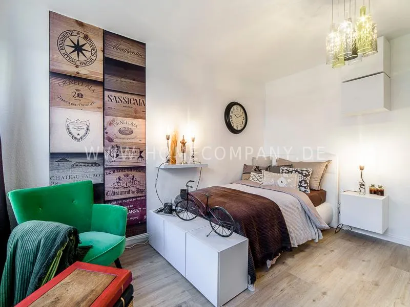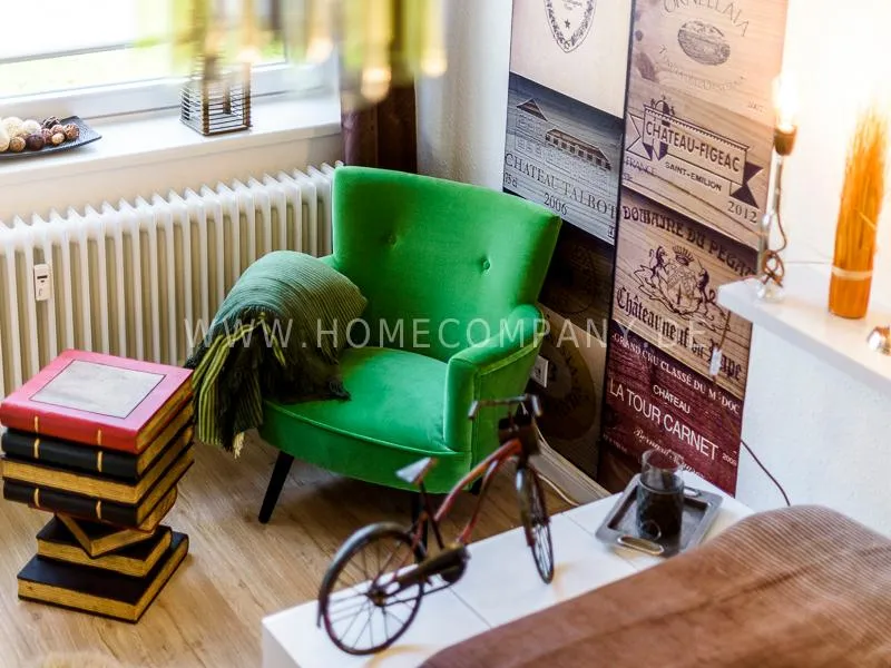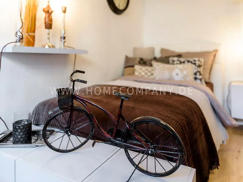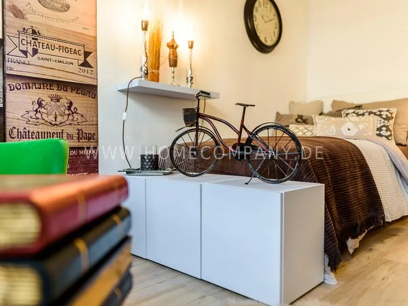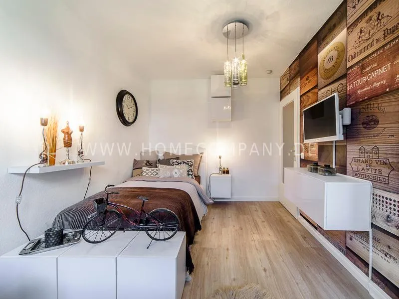 This business apartment offers an excellent value for money. Business travelers will find an apartment that is not only stylish and modern, but also well thought out and lovingly furnished. The unique wall design, individually and carefully selected design lamps and accessories create a modern and pleasant living atmosphere. The bathroom with shower and new shower glass wall is kept in white. The new, also in white fitted kitchen offers everything necessary even in the smallest space. In addition to a fridge and sink, there is a two-ring ceramic hob and a microwave with baking function. The living-sleeping area is furnished with a cozy 1x2 m box spring bed, which offers high sleeping and lying comfort. There is also a design armchair with a unique side table. Suspended boards and wall-mounted TV are also integrated.