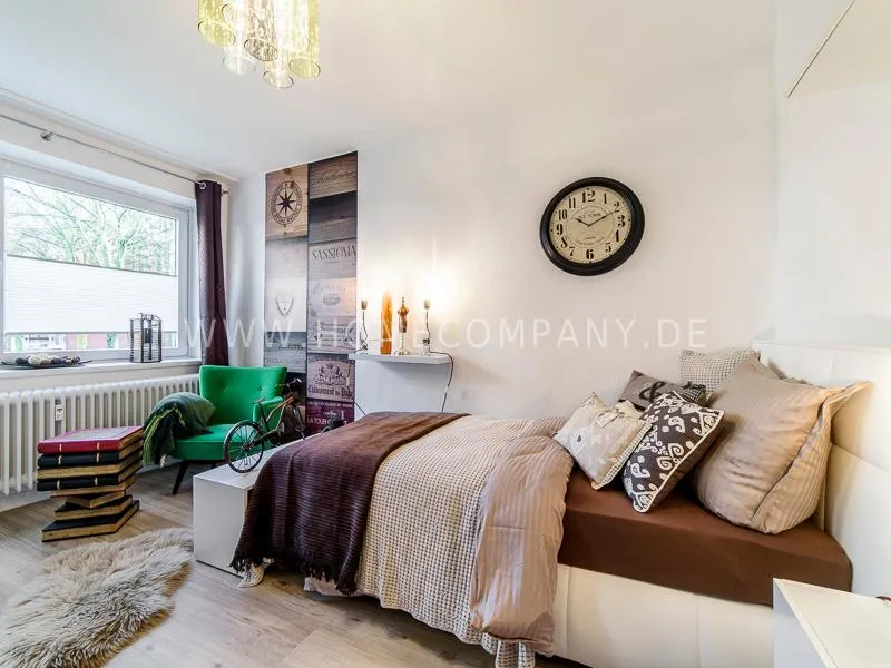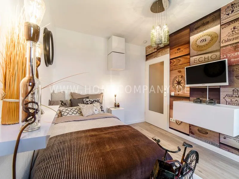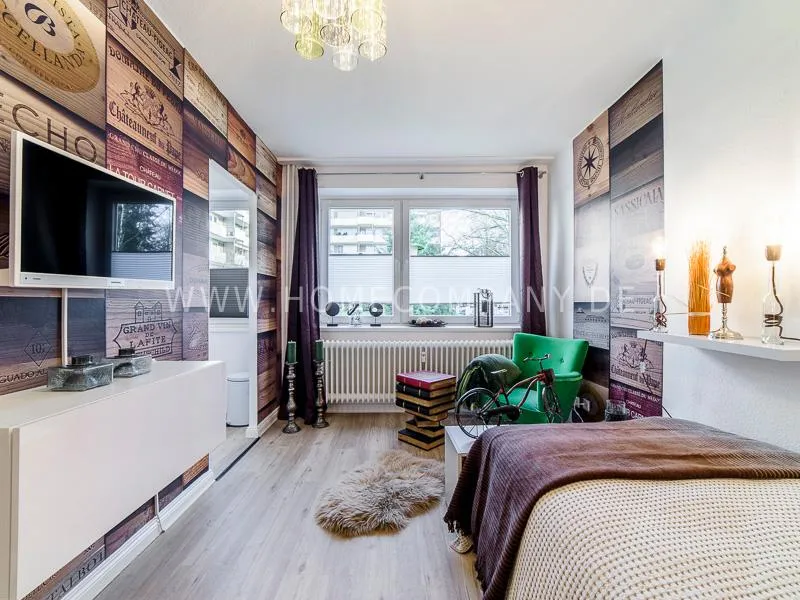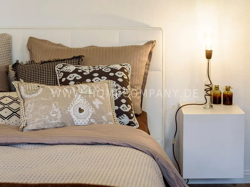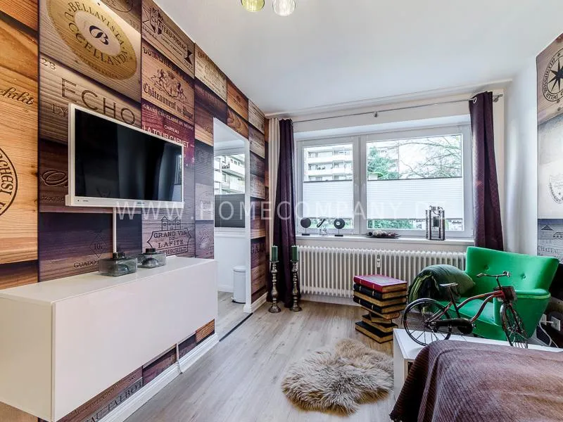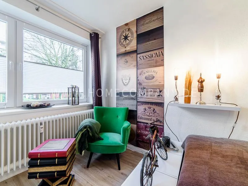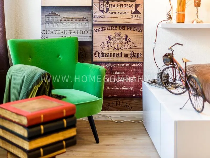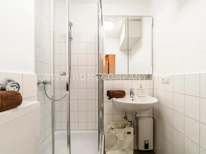 This business apartment offers an excellent value for money. Business travelers will find an apartment that is not only stylish and modern, but also well thought out and lovingly furnished. The unique wall design, individually and carefully selected design lamps and accessories create a modern and pleasant living atmosphere. The bathroom with shower and new shower glass wall is kept in white. The new, also in white fitted kitchen offers everything necessary even in the smallest space. In addition to a fridge and sink, there is a two-ring ceramic hob and a microwave with baking function. The living-sleeping area is furnished with a cozy 1x2 m box spring bed, which offers high sleeping and lying comfort. There is also a design armchair with a unique side table. Suspended boards and wall-mounted TV are also integrated.