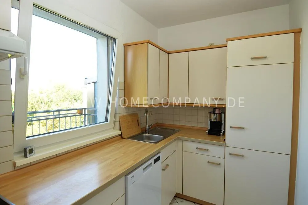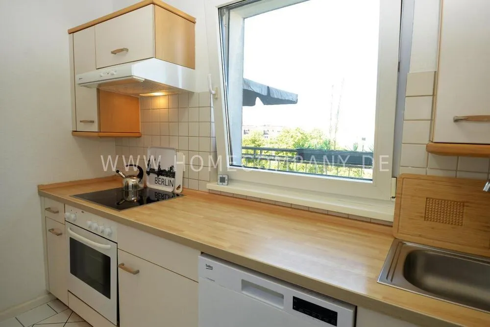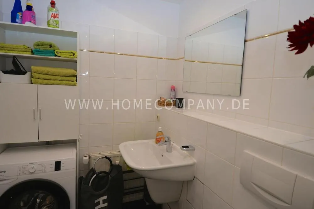 The separate, bright kitchen is fully equipped with a refrigerator, freezer, ceramic cooktop, oven, dishwasher, and other appliances.. The bathroom features a bathtub, sink, toilet, hairdryer, and a programmable washing machine.