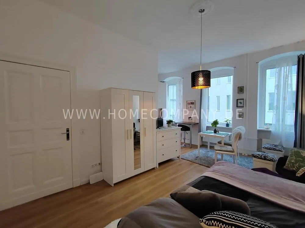 The beautiful old building apartment with high ceilings and large windows that let in lots of light is located in the quiet inner courtyard on a street that has been voted the most beautiful street in Germany.