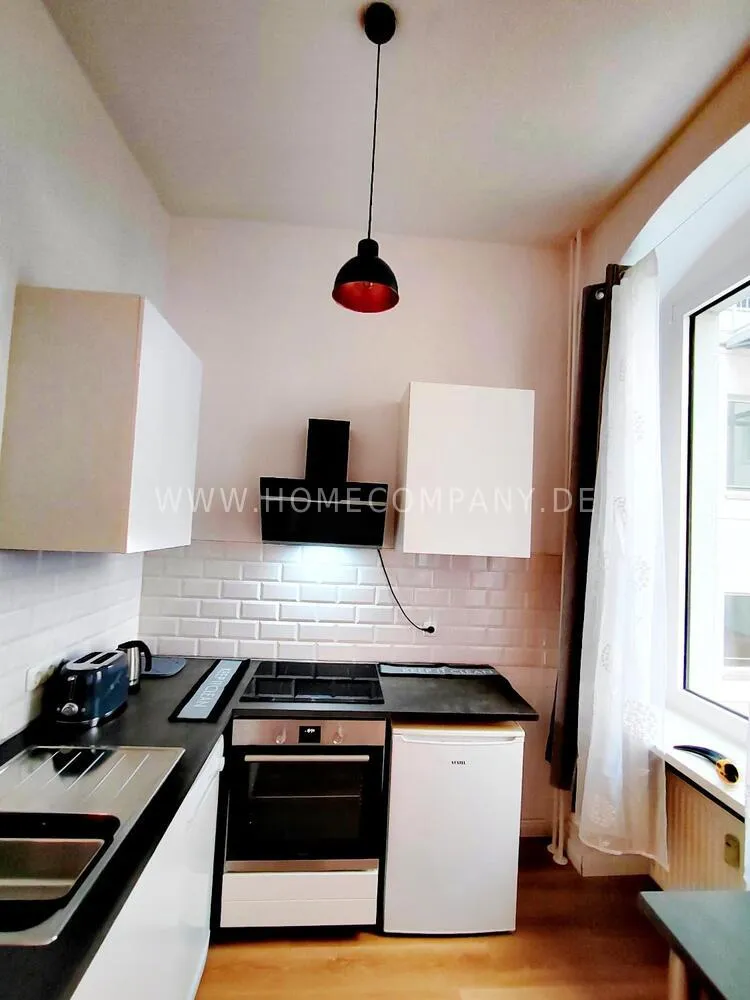 You enter the apartment through a hallway, in the built-in closet there is plenty of space for suitcases etc. In the beautiful room there is a 1.40 m bed, a desk and a spacious wardrobe and if you go around the corner you have a small kitchen . Apartment shower room, washing machine and internet.
