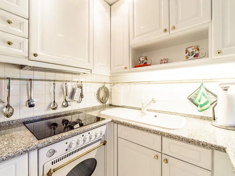 A recliner with a footstool is also available for relaxation. A dining table with 4 chairs is available. The kitchen is open to the living room and is well equipped. The apartment has a balcony. Dryer and washing machine are in the laundry room. An underground parking space (duplex) and internet connection are included in the rental price.
