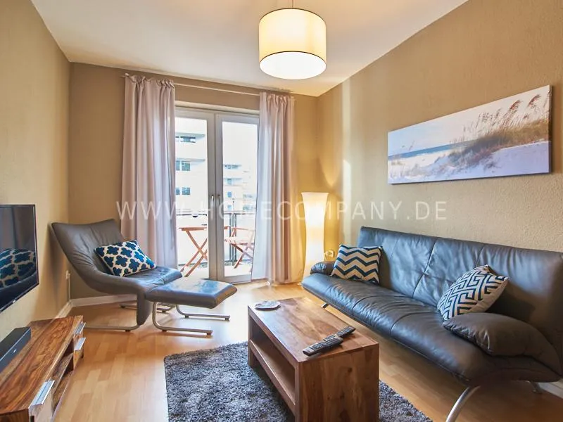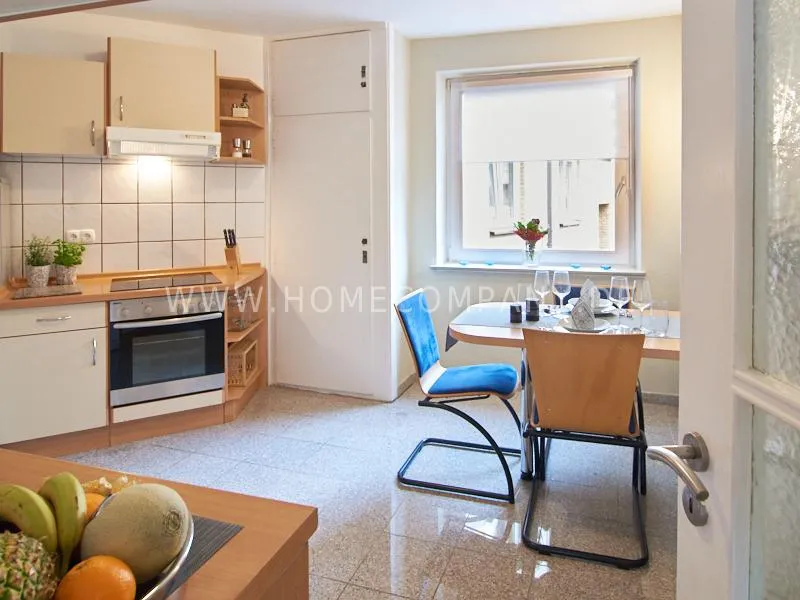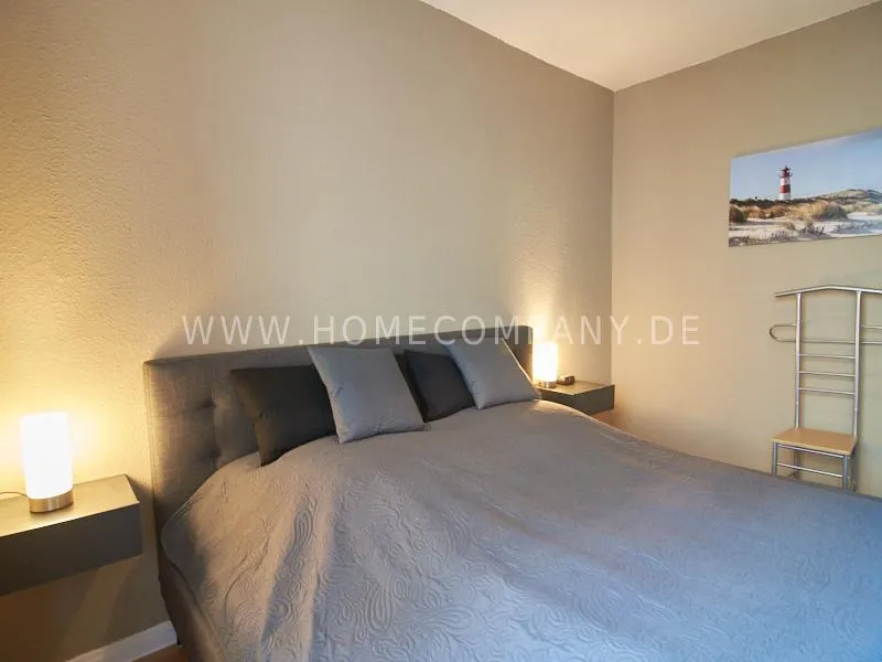 The furnishings and walls are in shades of gray and brown, which contrast with decorative elements in shades of blue. The bedroom is furnished with a 1.80 m wide bed. A 47 inch HDTV with Bose soundbar is available in the living room. There is a dryer in the apartment. The well-equipped kitchen offers a dining area for 3 people. Household appliances find a place in a small page.