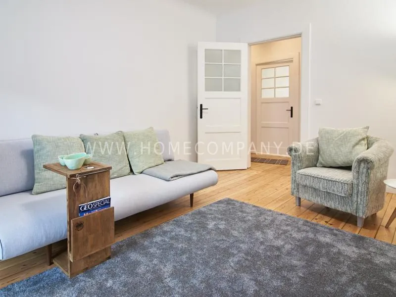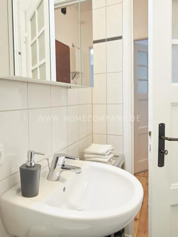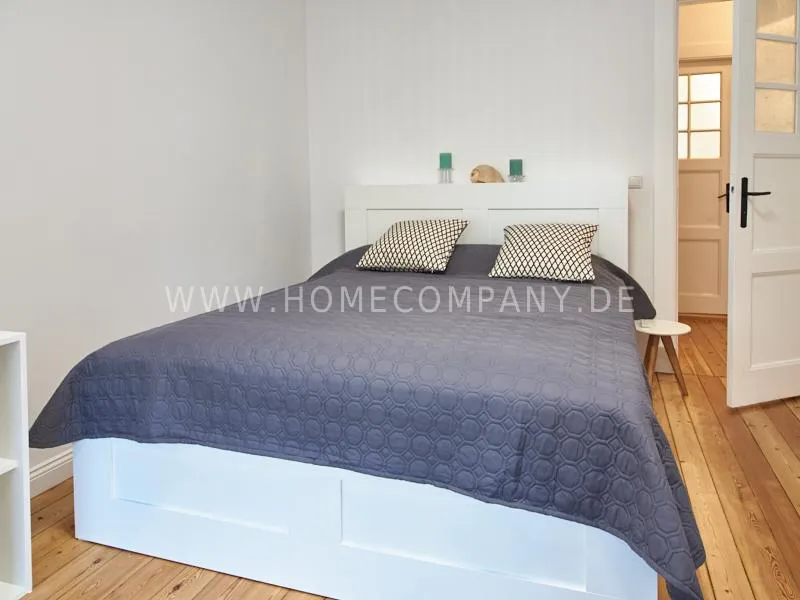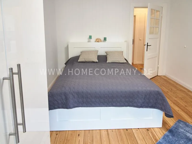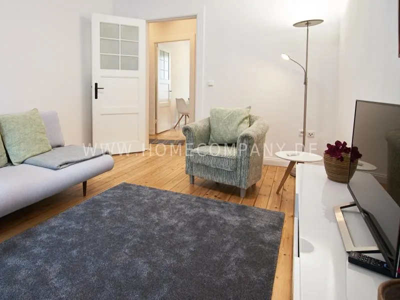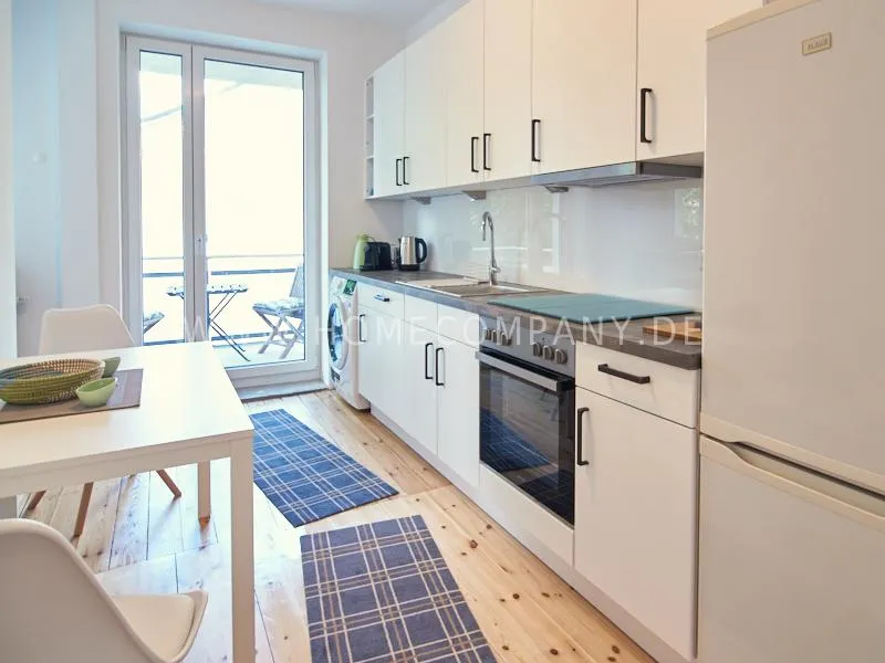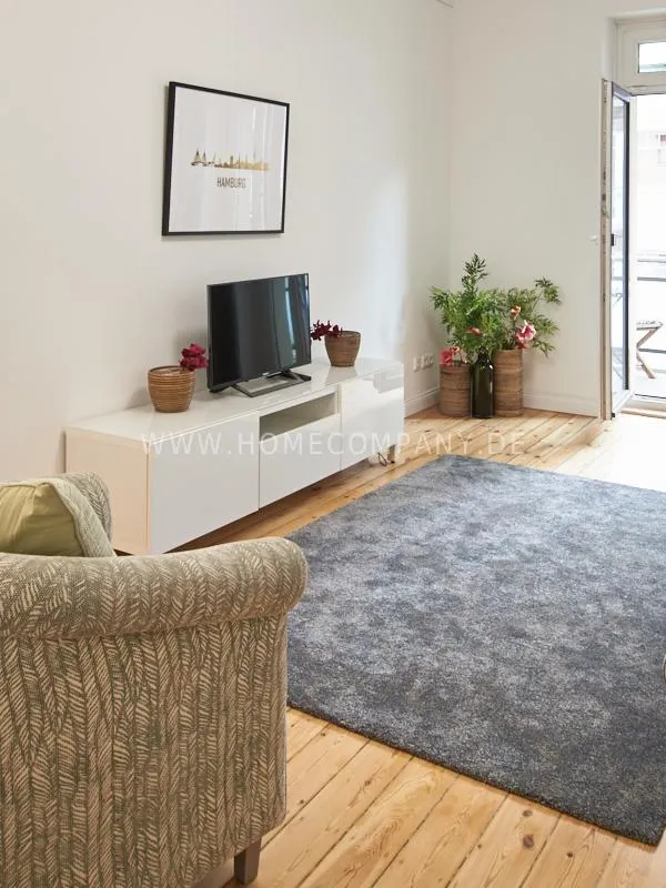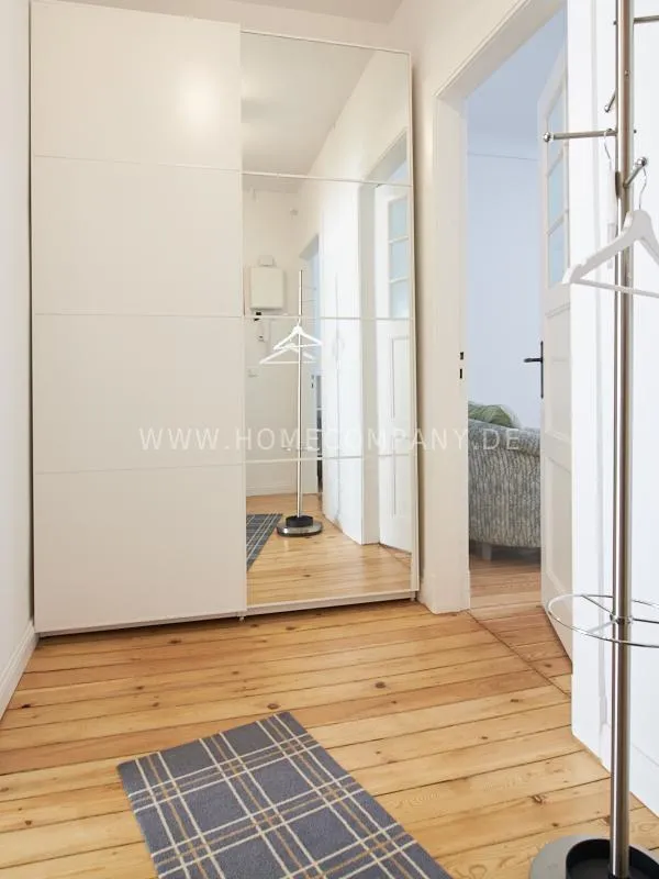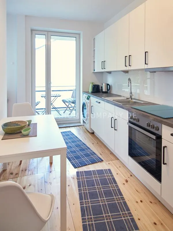 The bright and spacious two-room apartment is very clear and decorated in subtitle colours that harmonize beautifully with the well-maintained floorboards. The apartment was completely modernized in 2018 and looks almost like a new building. Two balconies offer a special recreational value, either relax overlooking the green garden courtyard or a little closer to city life with a view of the quiet street. The balconies are accessible from the kitchen or from the living room. The bedroom has a double bed and ample closet space available. For occasional visits a pull-out sofa can be used as a guest bed in the living room.