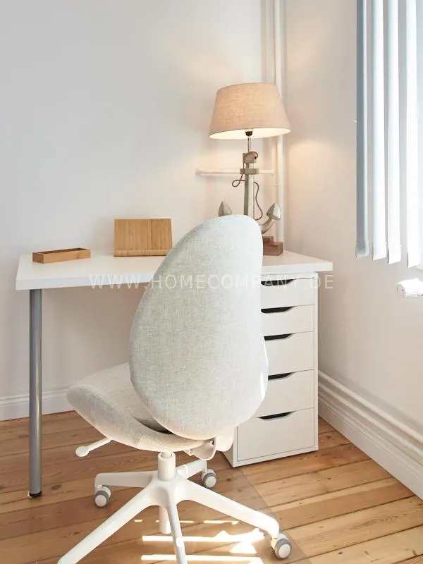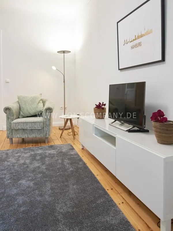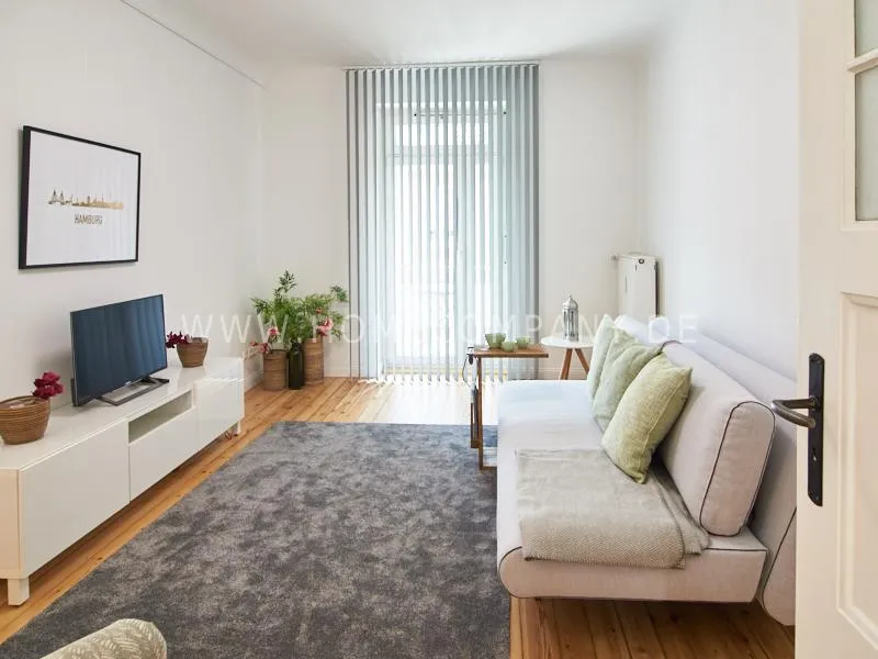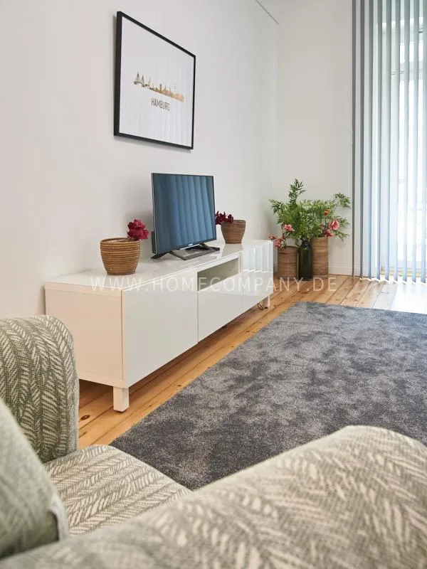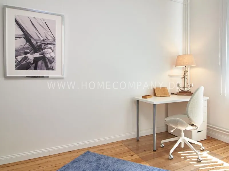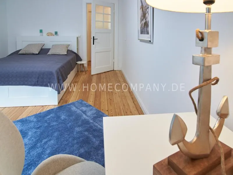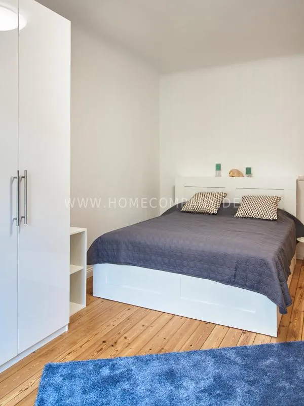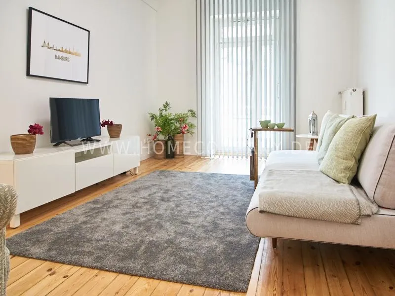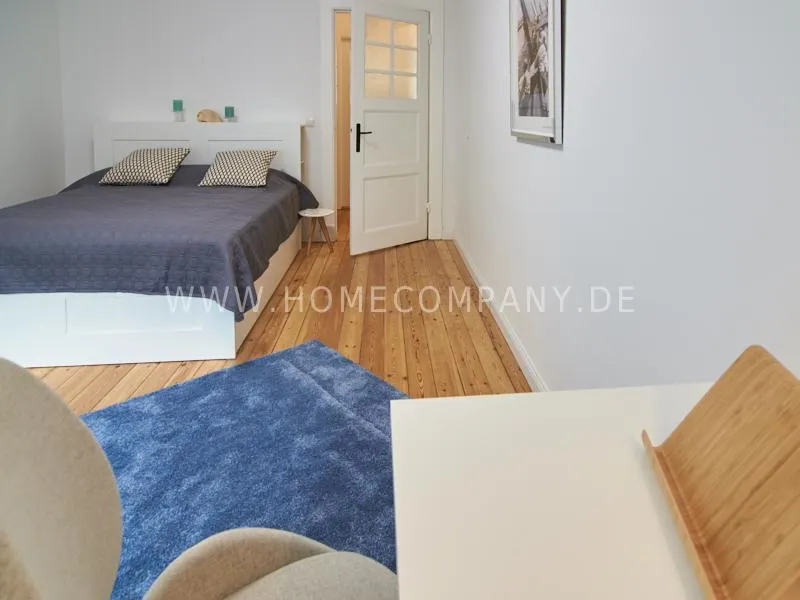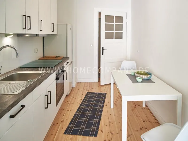 The bright and spacious two-room apartment is very clear and decorated in subtitle colours that harmonize beautifully with the well-maintained floorboards. The apartment was completely modernized in 2018 and looks almost like a new building. Two balconies offer a special recreational value, either relax overlooking the green garden courtyard or a little closer to city life with a view of the quiet street. The balconies are accessible from the kitchen or from the living room. The bedroom has a double bed and ample closet space available. For occasional visits a pull-out sofa can be used as a guest bed in the living room.