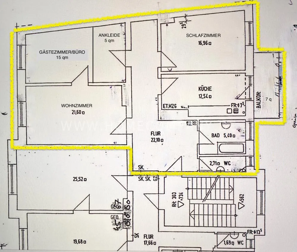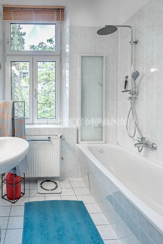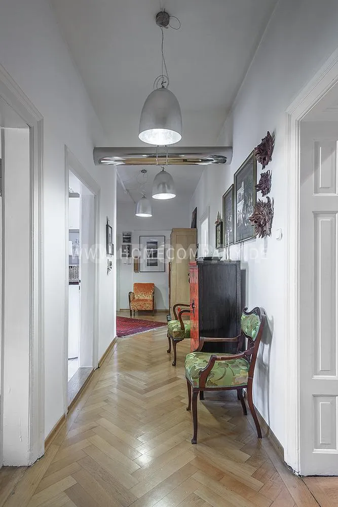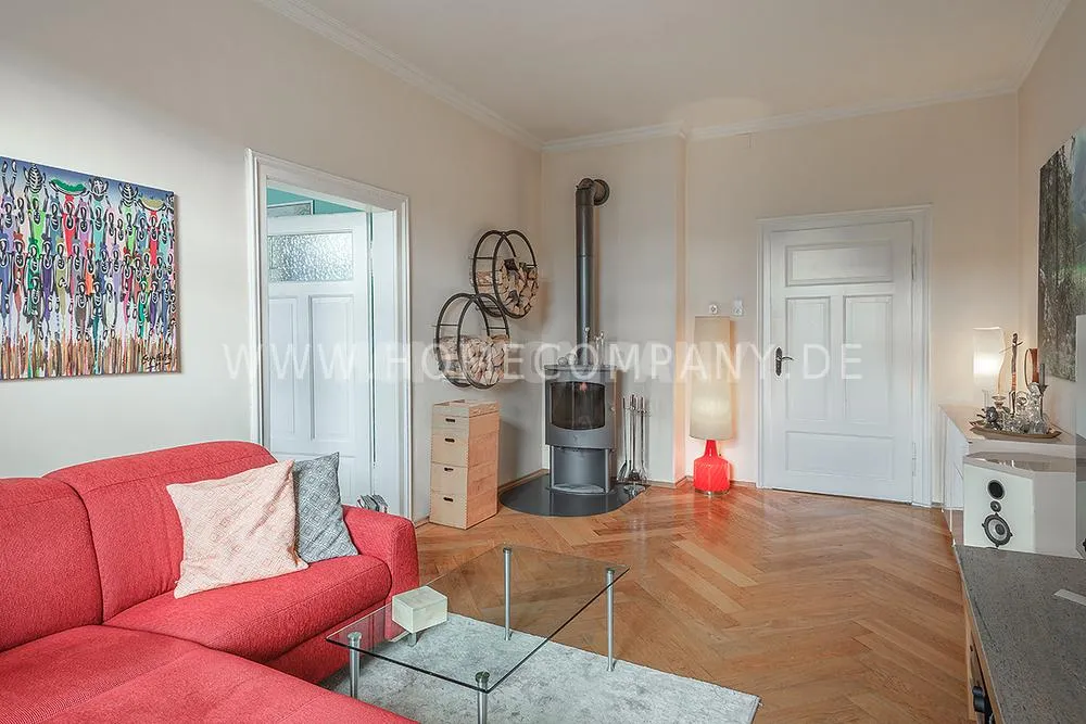 Charming old building apartment with 3,5 rooms with balcony in best location between Johannis- and Max-Weber-Platz. 2nd floor without elevator. The lovingly and very personally furnished apartment with a mix of antiques and modern pieces has old oak parquet flooring, 3.30 m high rooms and the original doors with a generous passage height of 2.15 m. Through the spacious entrance area with wardrobe and extra shoe cabinet you enter the living room. This is furnished with large sidboards, a comfortable 3-seat sofa, wood-burning fireplace and an LG OLED 65inch SmartTV are connected to a high-end sound system, M-Net TV is available. Through the living room you enter the guest room/office with a single bed, a desk and shelving cabinets. The eat-in kitchen is very well equipped with dishwasher, gas hob with 5 burners and electric oven. A filter coffee and an espresso capsule machine with milk frother and all cooking and baking utensils as well as a large refrigerator/freezer combination are available. A cozy dining area for 2-4 people is integrated into the kitchen. A double door leads from here to the 3.90 x 1.80 m balcony with seating. The master bedroom with a 2 x 2.20 m double bed has blackout curtains, a linen closet, a dresser and faces the quiet backyard. Just opposite the bedroom is the walk-in dressing room with very generous open shelving, about 6m of clothes rails and lots of drawers. The bathroom has a bathtub and a large window. The toilet is an extra room and also has a window.