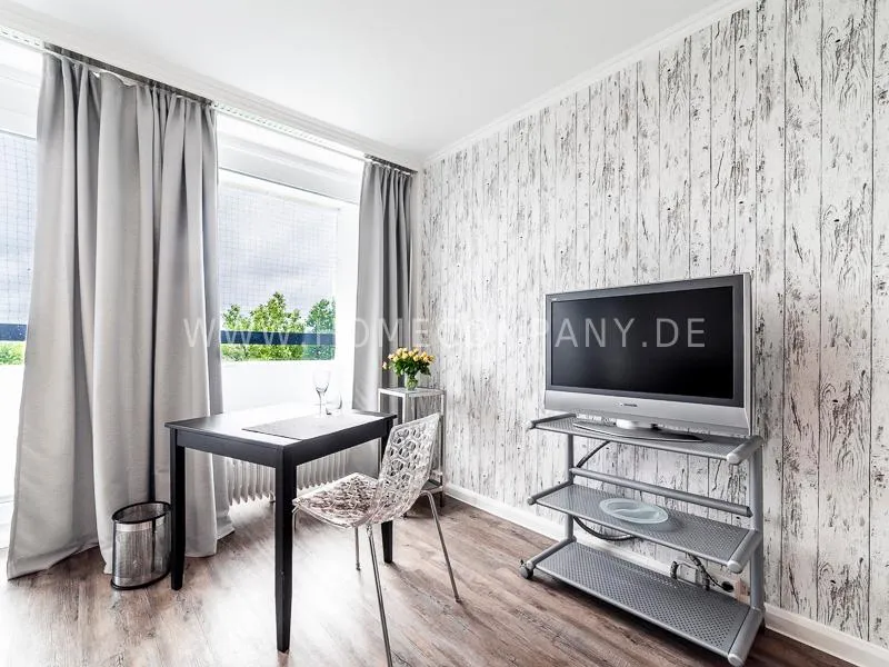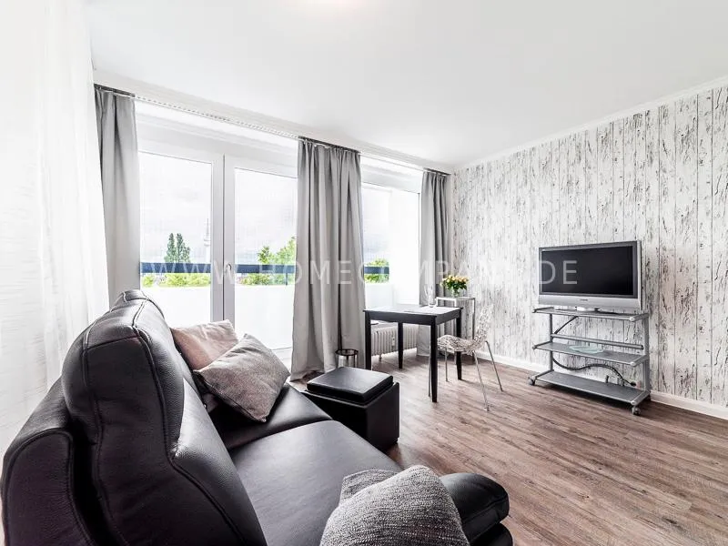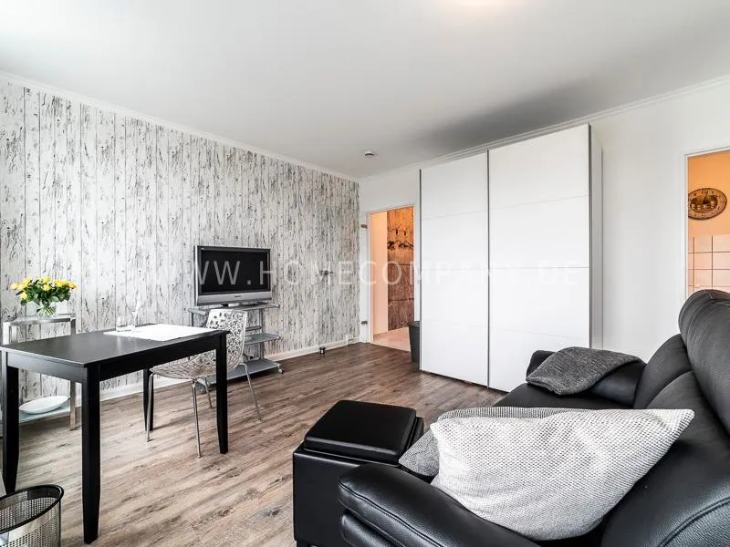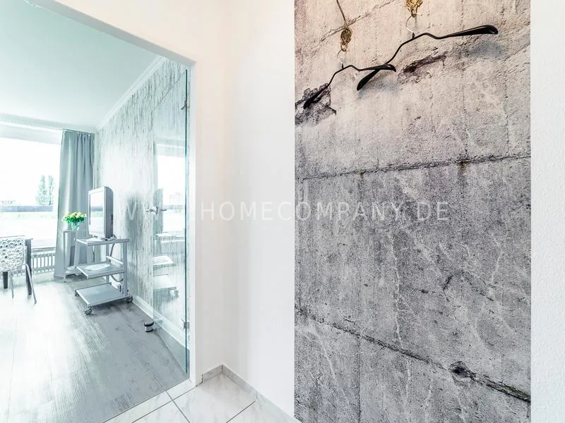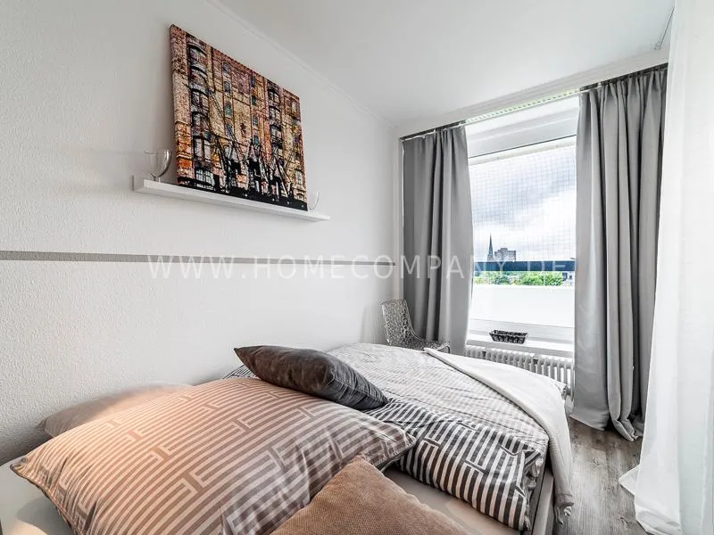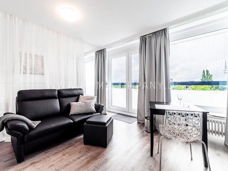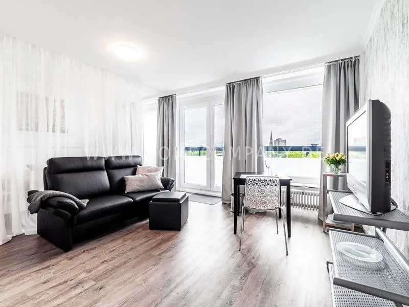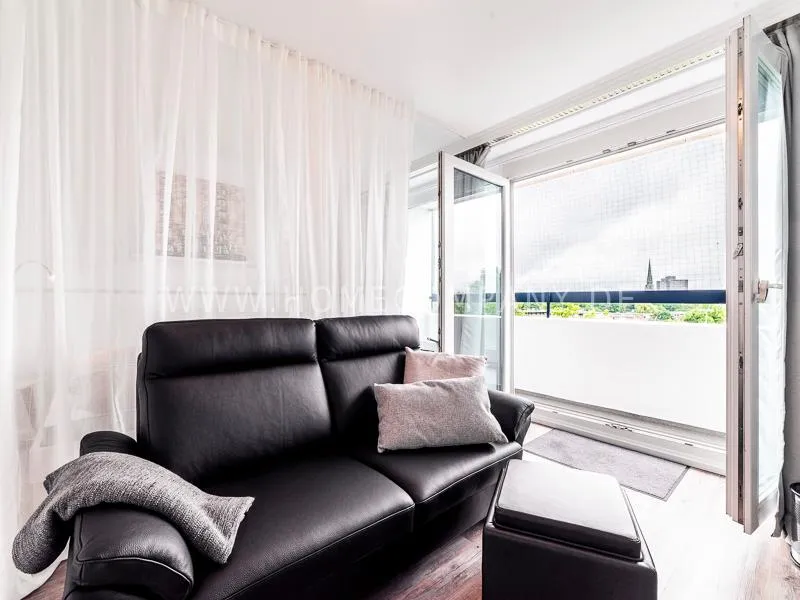 Modern apartment with upscale amenities for business people. The flat is optimally designed to the needs, the equipment leaves nothing to be desired. Modern urban style, wall design in concrete and wood look in combination with a straight dark leather sofa and bright pieces of furniture The beautiful view over Hamburg is oriented towards the south.