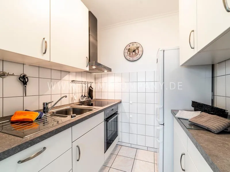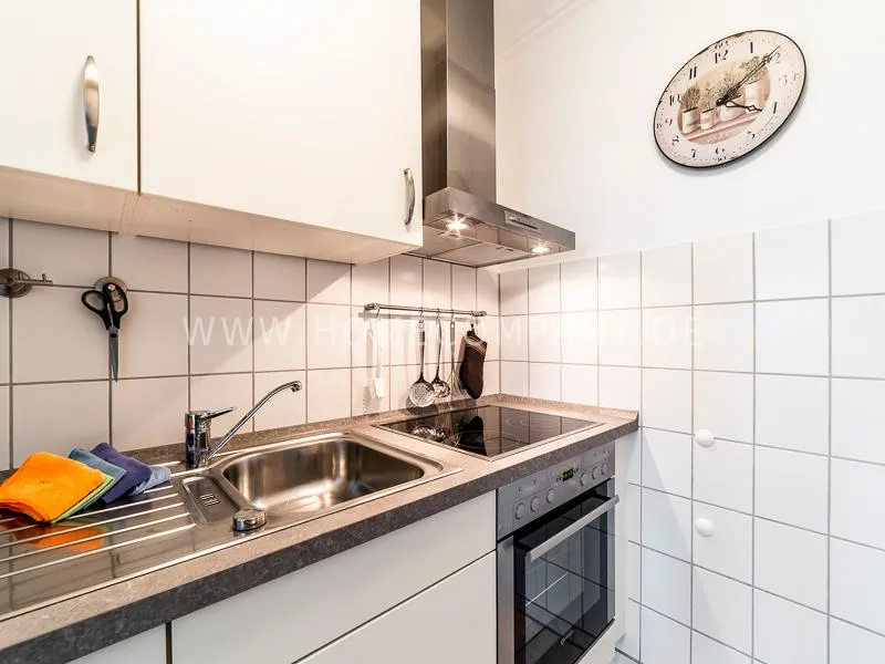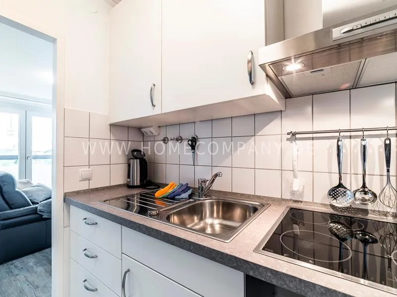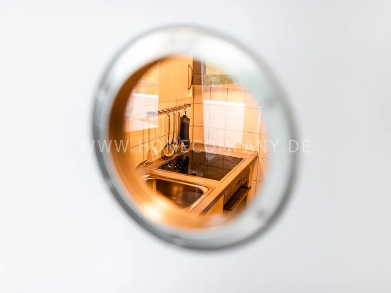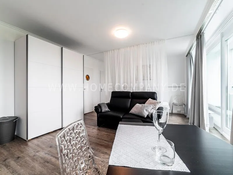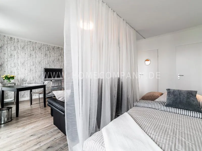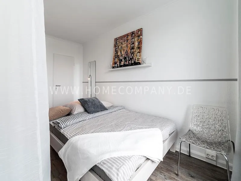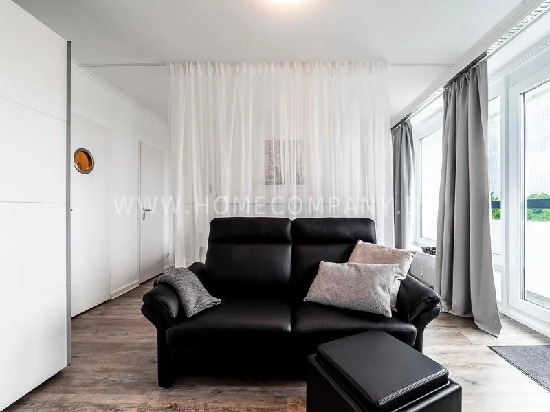 Modern apartment with upscale amenities for business people. The flat is optimally designed to the needs, the equipment leaves nothing to be desired. Modern urban style, wall design in concrete and wood look in combination with a straight dark leather sofa and bright pieces of furniture The beautiful view over Hamburg is oriented towards the south.