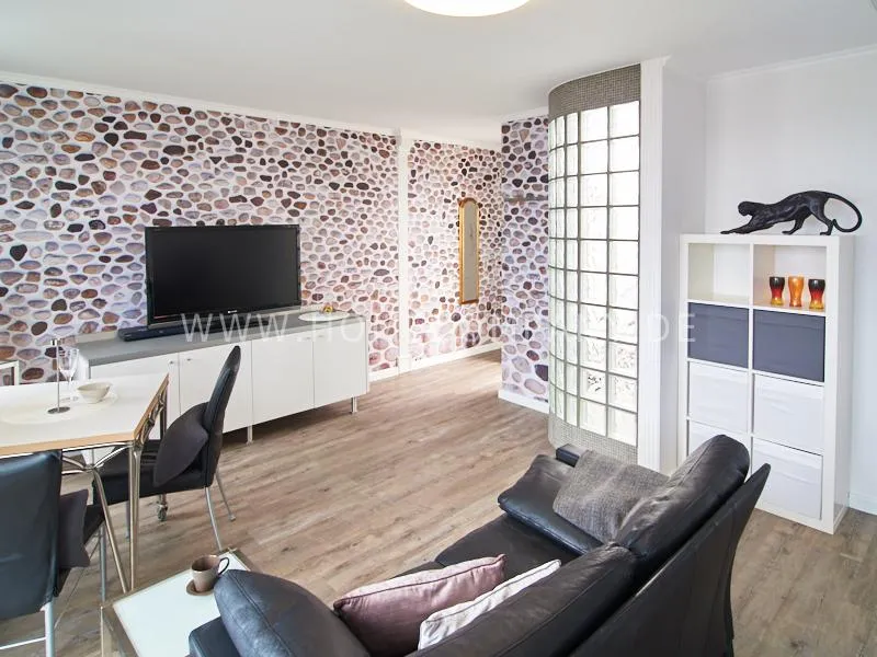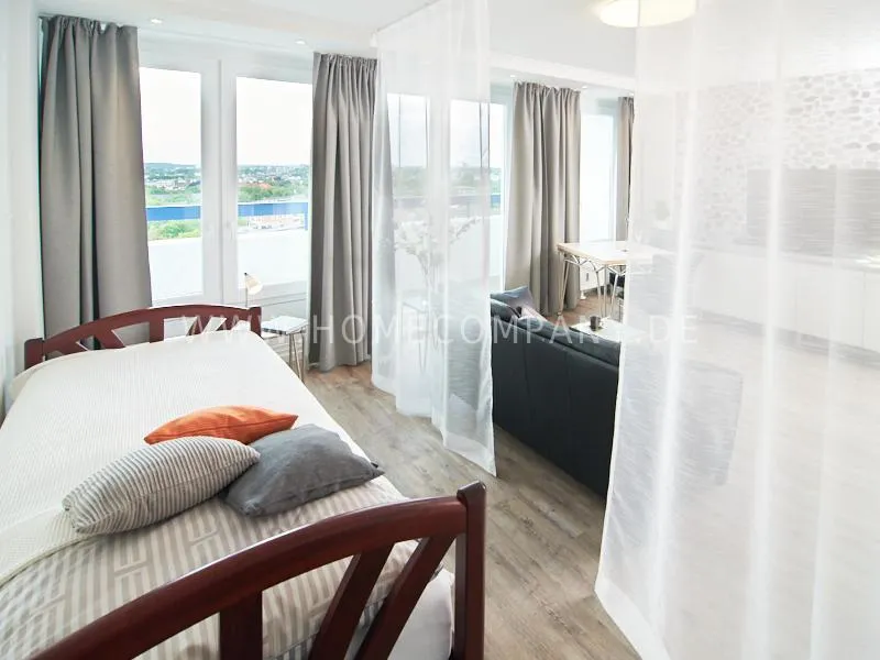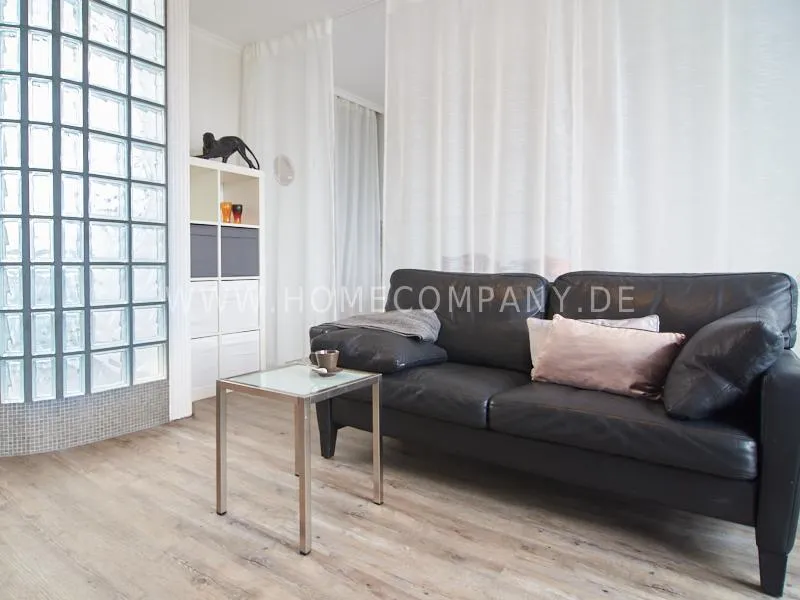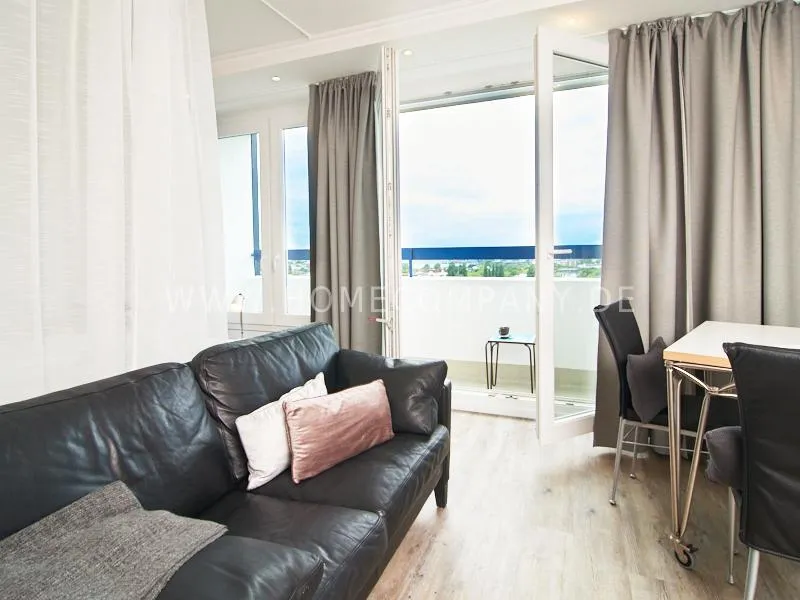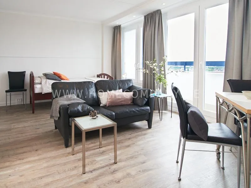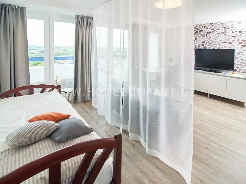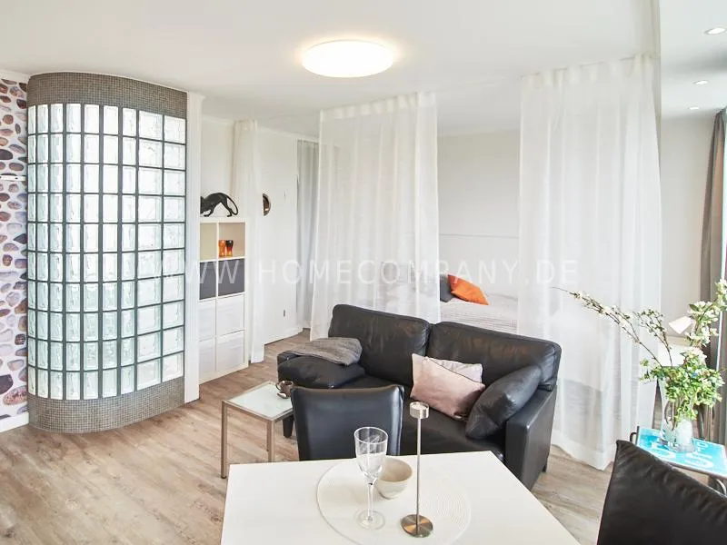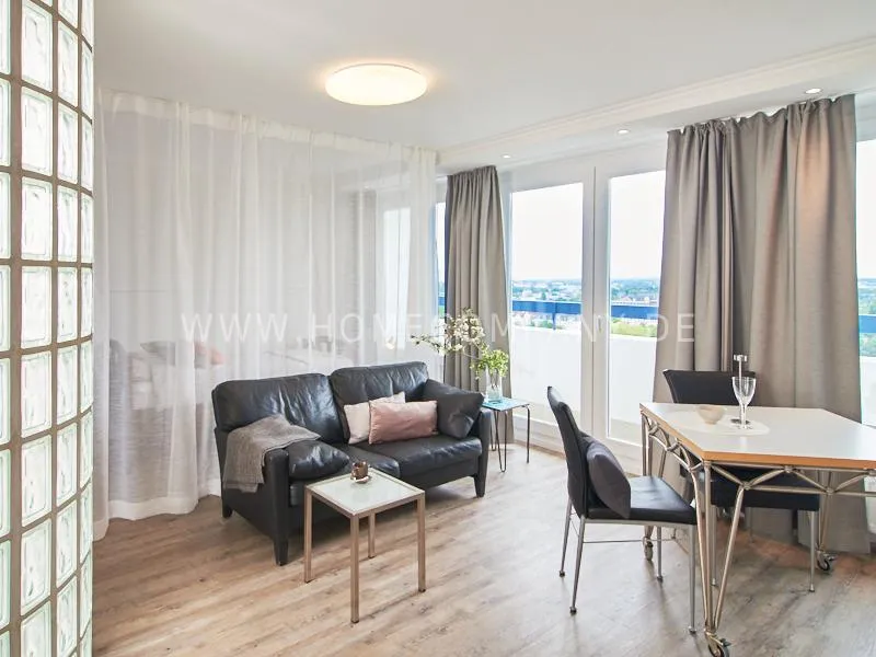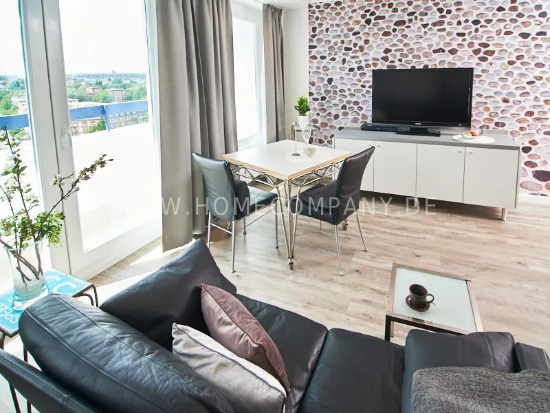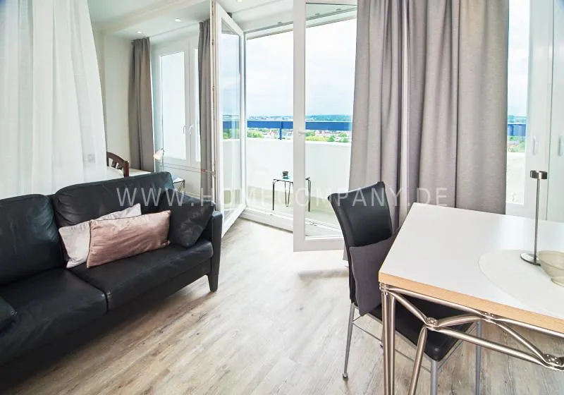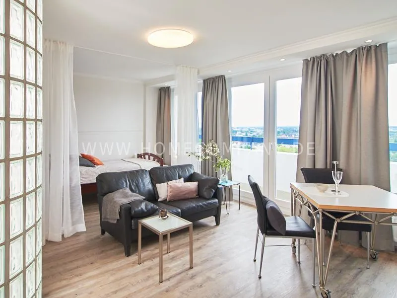 Modern apartment with upscale amenities for business people. The flat is optimally designed to the needs, the equipment leaves nothing to be desired. Modern urban style, wall design in concrete look in combination with a straight dark leather sofa and bright pieces of furniture The spectacular view over Hamburg opens up completely new perspectives on the cityscape. A special highlight is the semicircular wall made of glass blocks between the living room and shower room. The apartment is equipped with a 1.40 m wide bed.