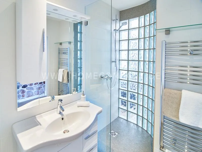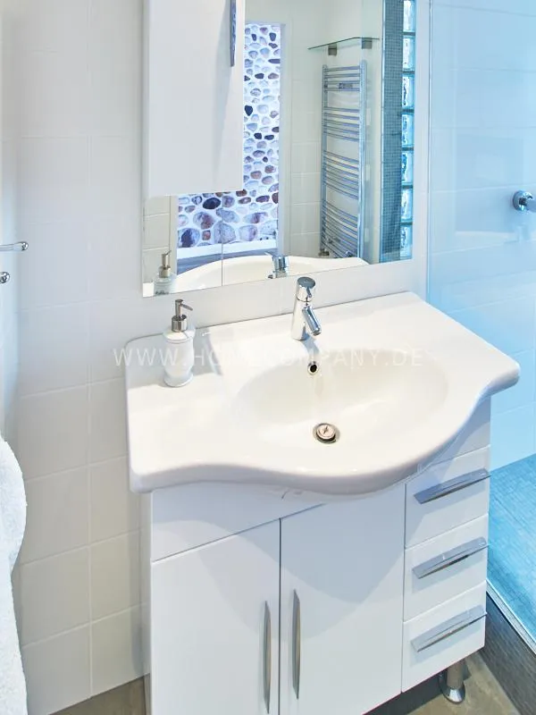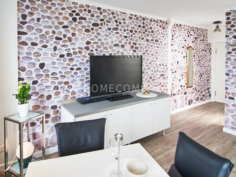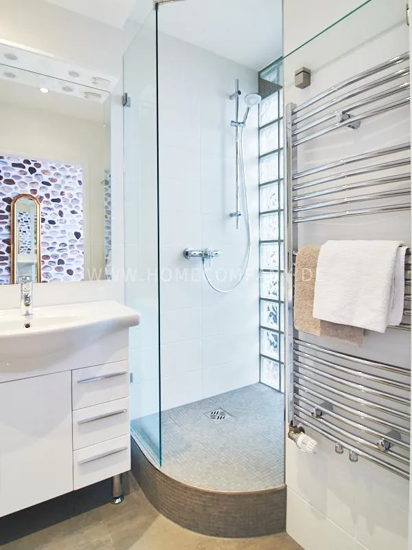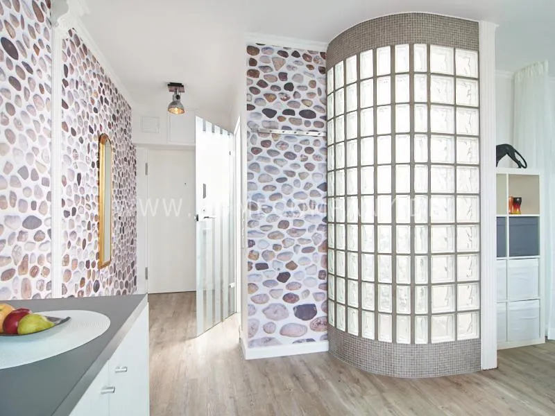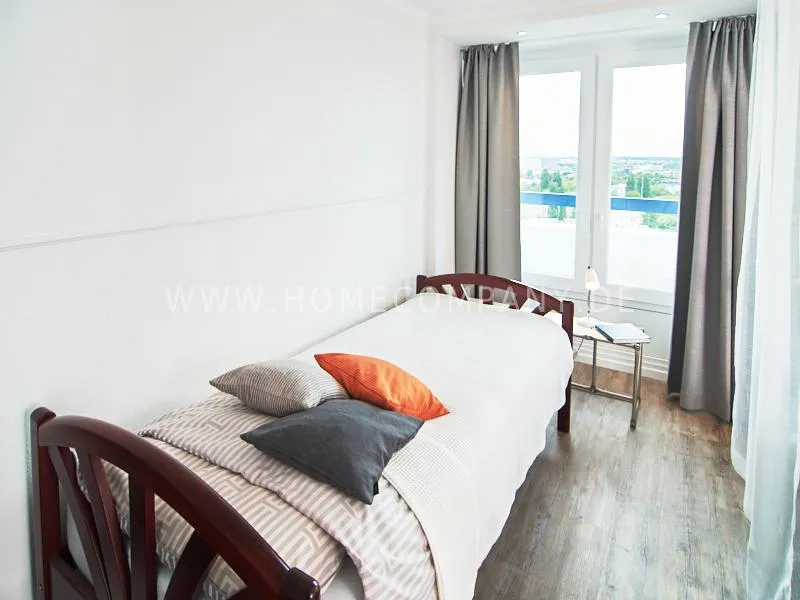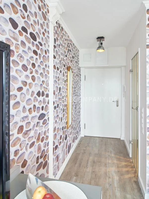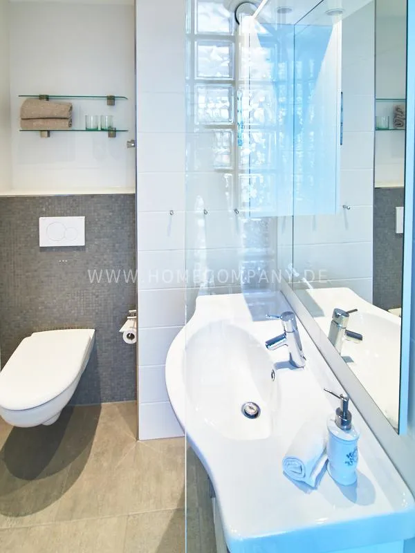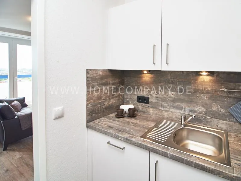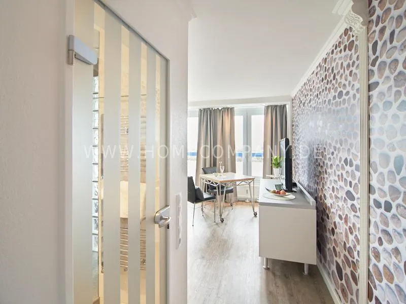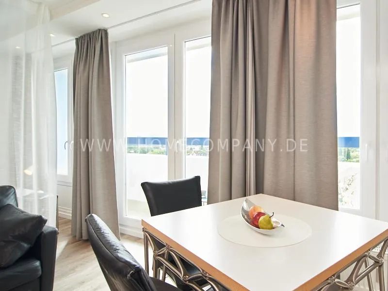 Modern apartment with upscale amenities for business people. The flat is optimally designed to the needs, the equipment leaves nothing to be desired. Modern urban style, wall design in concrete look in combination with a straight dark leather sofa and bright pieces of furniture The spectacular view over Hamburg opens up completely new perspectives on the cityscape. A special highlight is the semicircular wall made of glass blocks between the living room and shower room. The apartment is equipped with a 1.40 m wide bed.