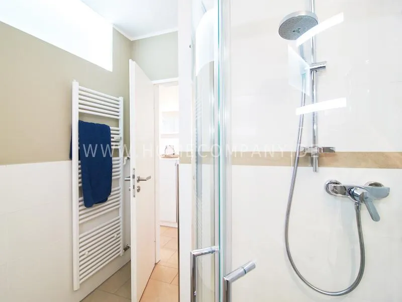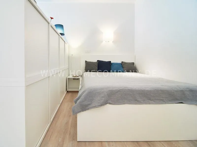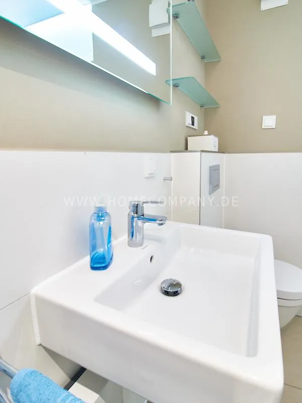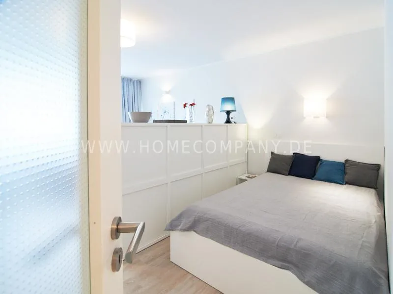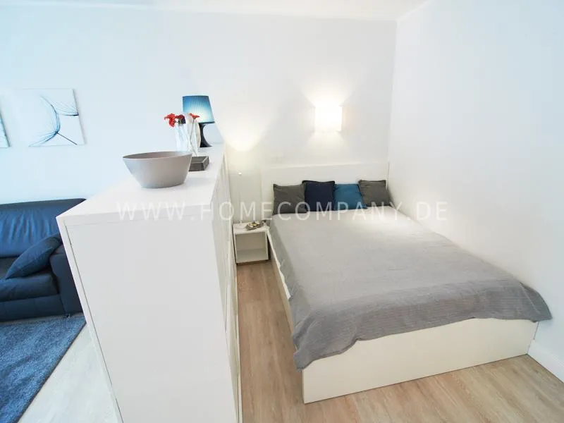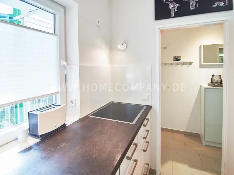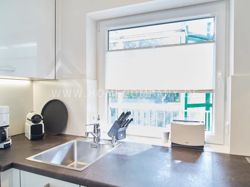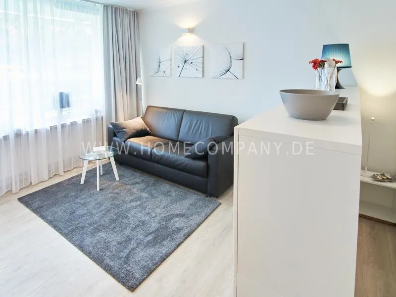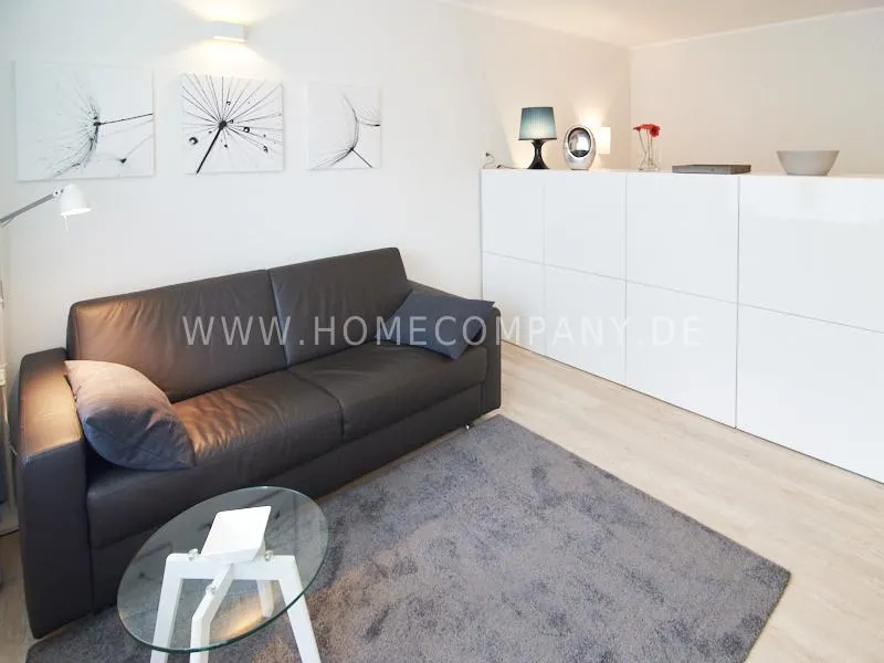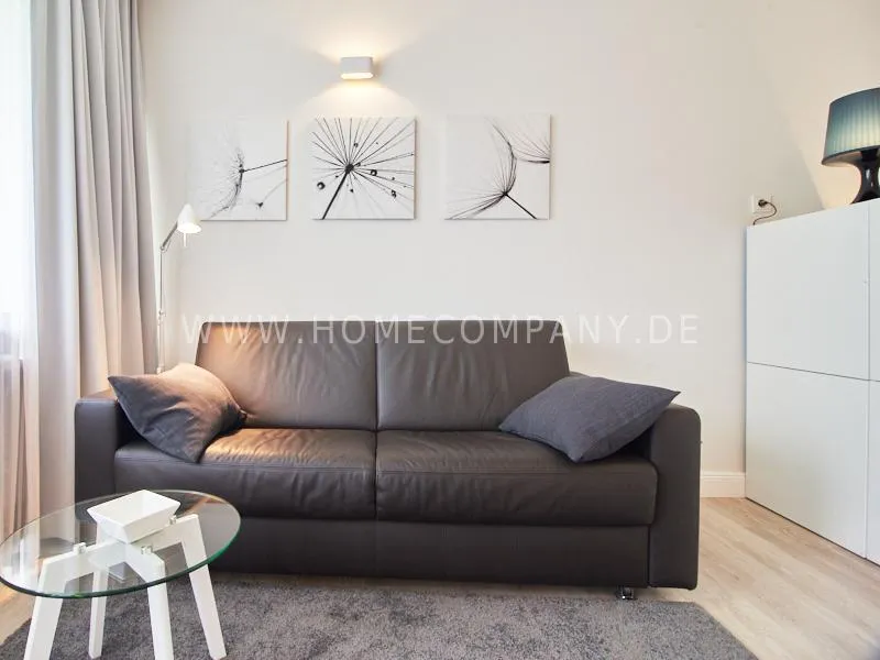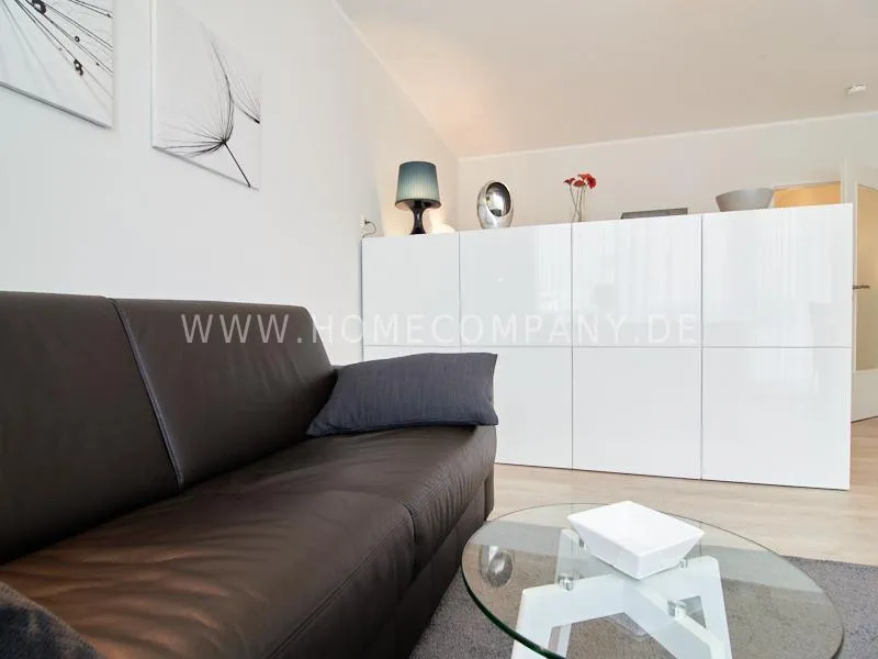 Nice furnished apartment in a quiet side street in Eimsbüttel. The living rooms are provided with an attractive and easy to clean design floor. The bright and airy living room is separated by a room divider in a living area and a sleeping area, equipped with a 1.40 wide bed. The room divider provides plenty of storage space. The living area is very tastefully furnished and modern. A high-quality leather sofa bed (separate mattresses) is here available as a spare bed. From the living area you have access to the spacious balcony. The high quality fitted kitchen has a dishwasher and induction cooker next to a detailed programmable oven. In the wall between the bathroom and kitchen, a light box is integrated in the upper section. In the beautiful bathroom is a semi-circular shower with glass enclosure. The hall has an ample space for the wardrobe.