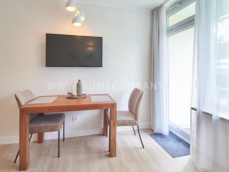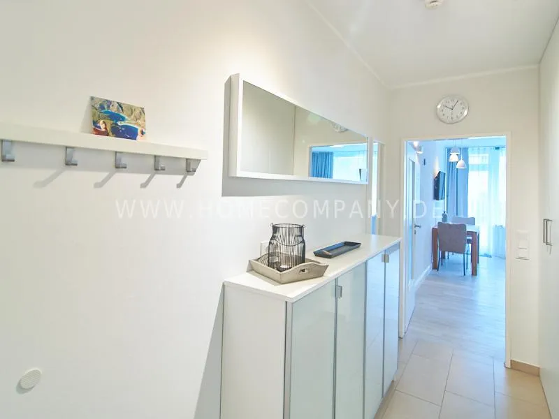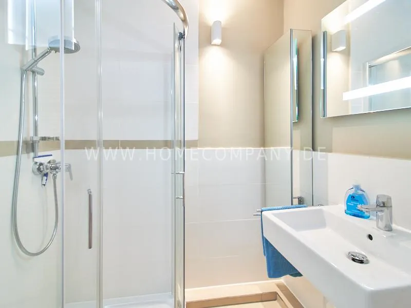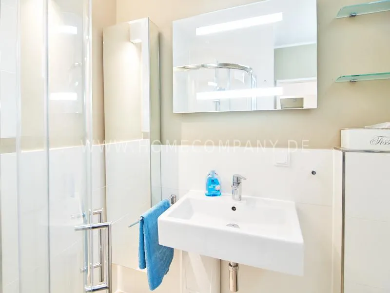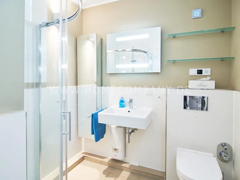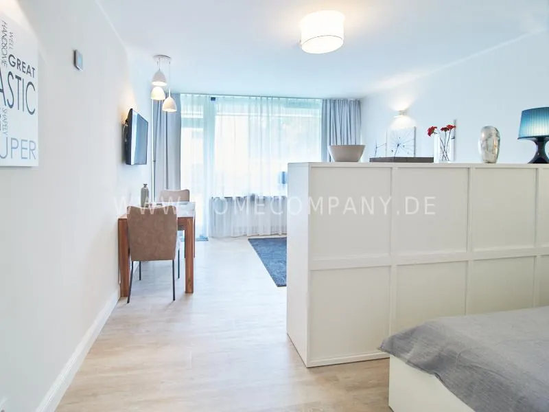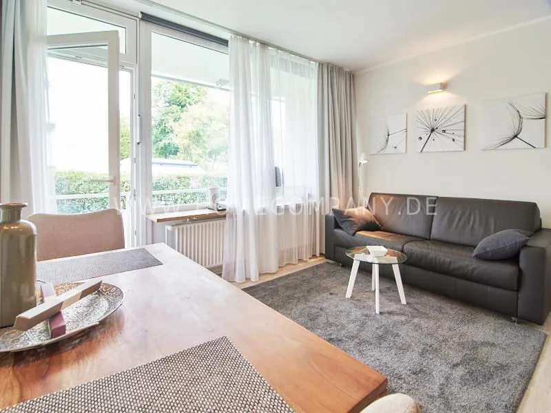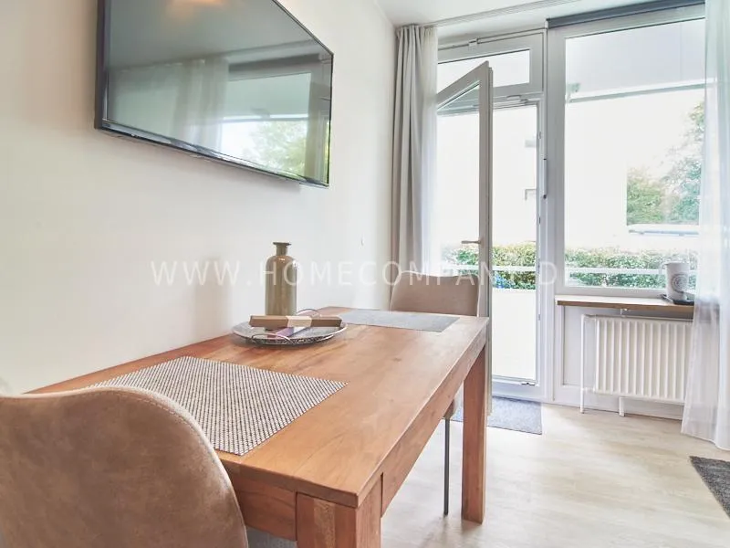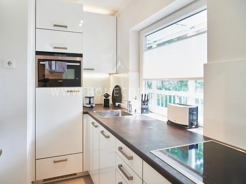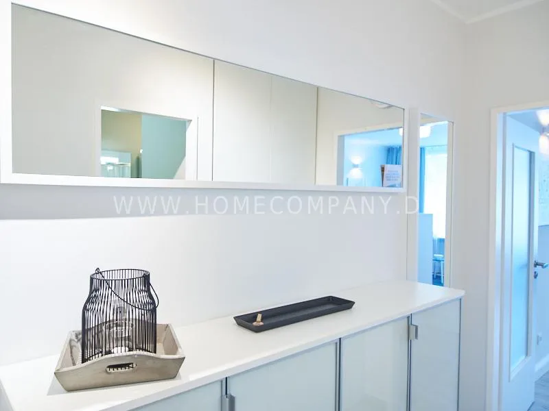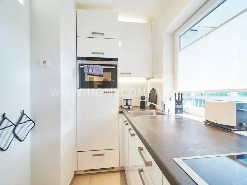 Nice furnished apartment in a quiet side street in Eimsbüttel. The living rooms are provided with an attractive and easy to clean design floor. The bright and airy living room is separated by a room divider in a living area and a sleeping area, equipped with a 1.40 wide bed. The room divider provides plenty of storage space. The living area is very tastefully furnished and modern. A high-quality leather sofa bed (separate mattresses) is here available as a spare bed. From the living area you have access to the spacious balcony. The high quality fitted kitchen has a dishwasher and induction cooker next to a detailed programmable oven. In the wall between the bathroom and kitchen, a light box is integrated in the upper section. In the beautiful bathroom is a semi-circular shower with glass enclosure. The hall has an ample space for the wardrobe.