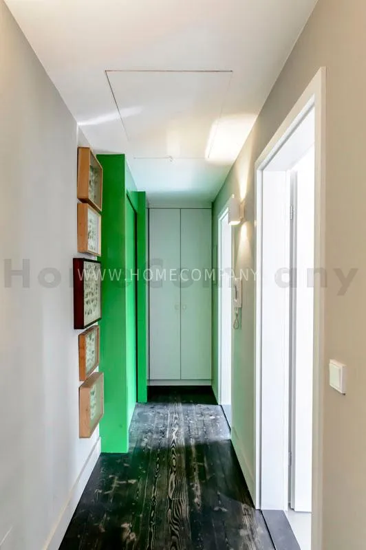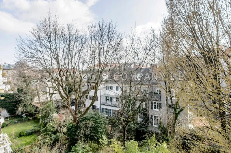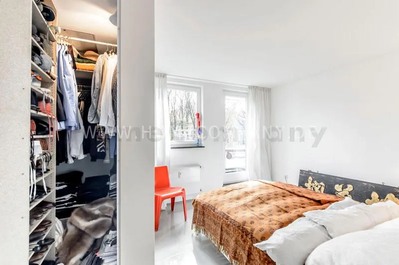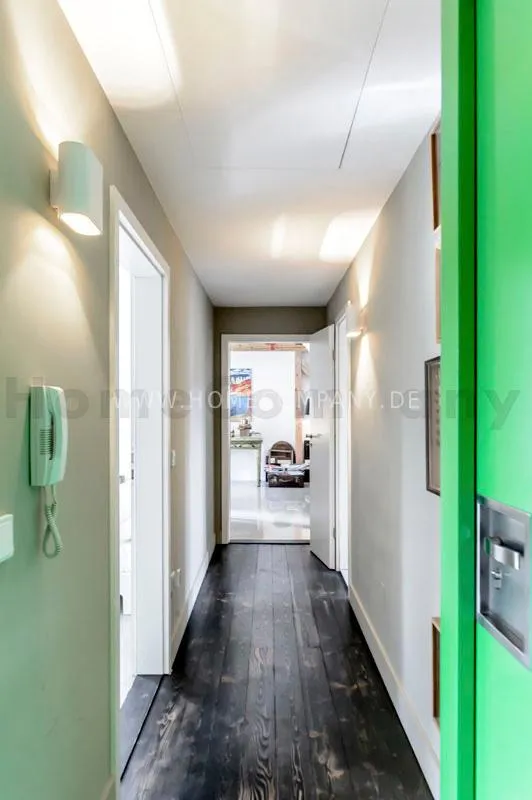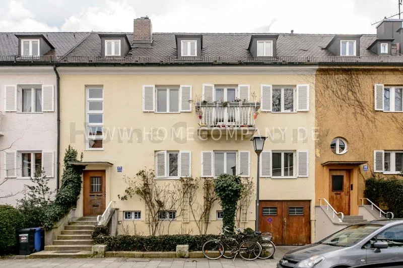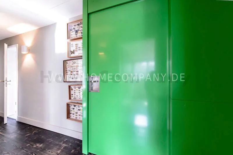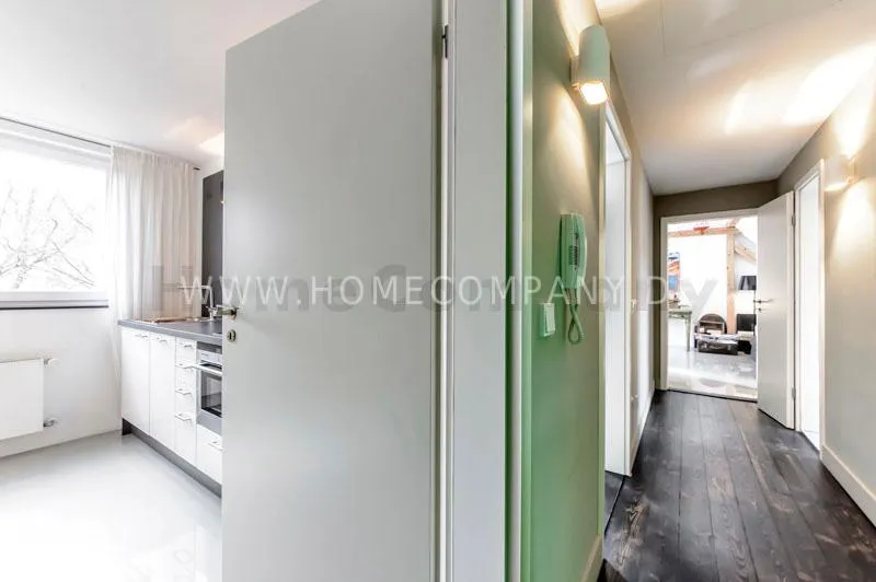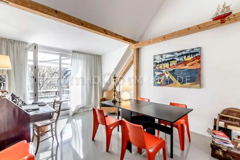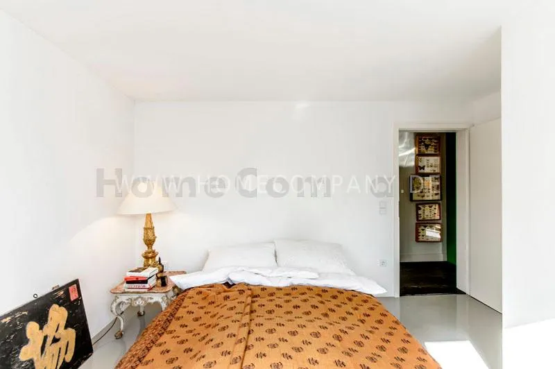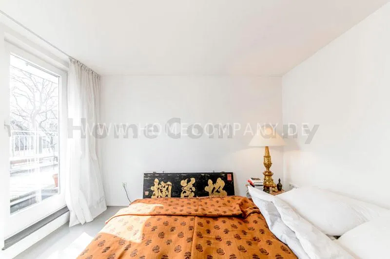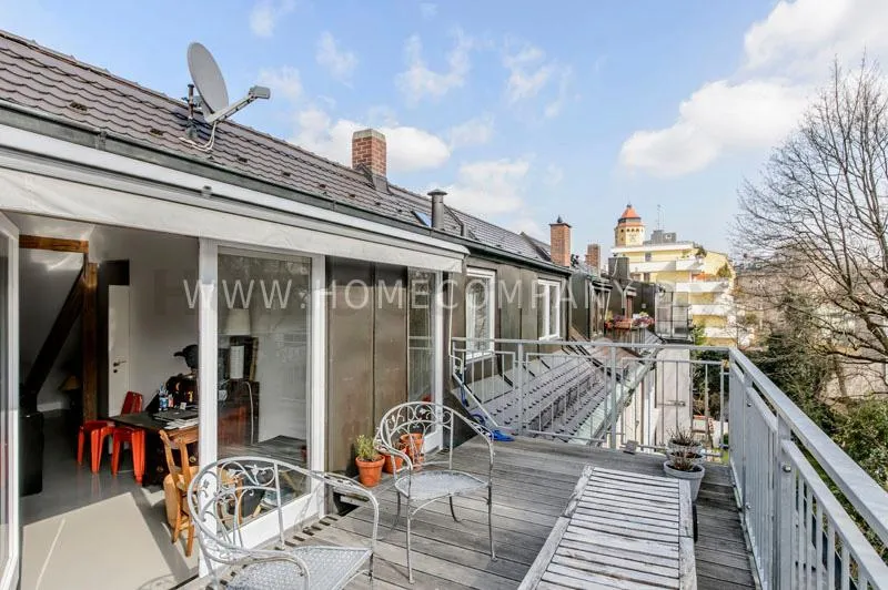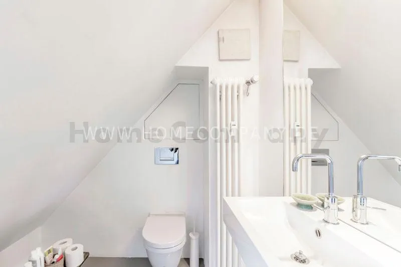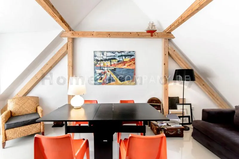 Located in a renovated townhouse from 1936 on the 2nd floor. The large roof terrace offers panoramic views over green gardens of the neighbourhood. The flat has high quality furnishing and has been renovated in top quality. Light-filled, well-proportioned rooms determine the living environment. The living room with exposed beams, open roof peak, sofa, dining table and beautiful secretary, leads onto to the sunny terrace that is equipped with garden furniture. The bedroom has a double bed (1.40 x 2 m) and a large wardrobe. The modern bathroom with daylight comes with large glass shower. The very well-equipped separate eat-in kitchen with small dining area has a window to the garden. Flooring: exclusive resin screed.