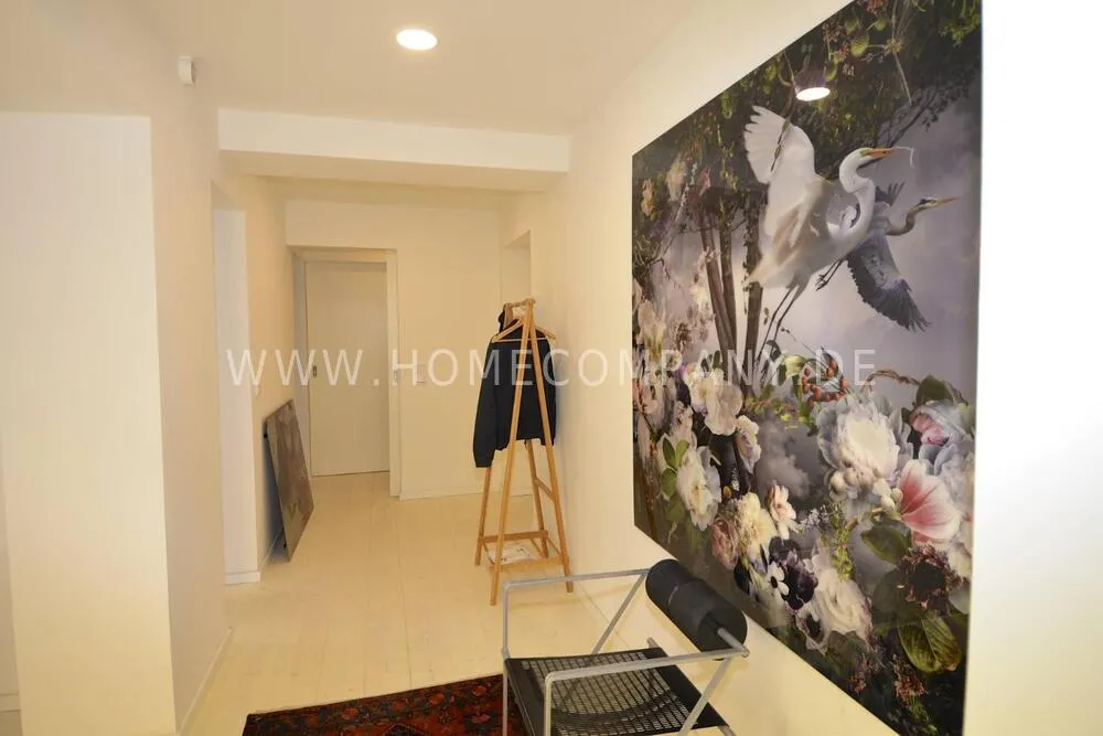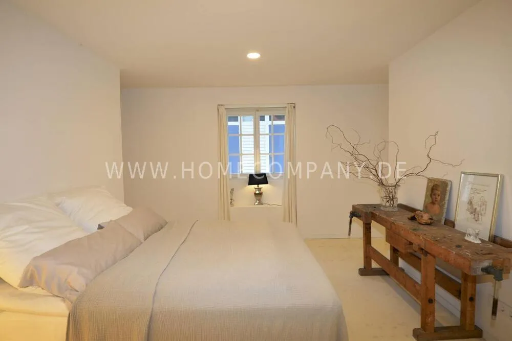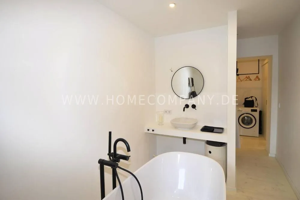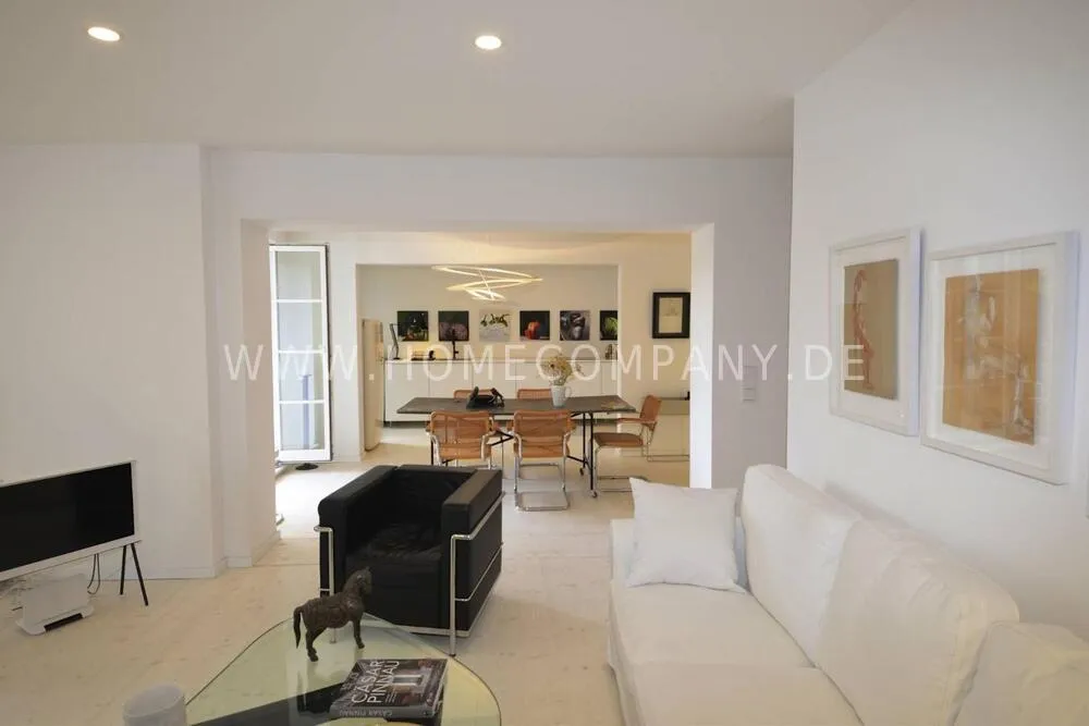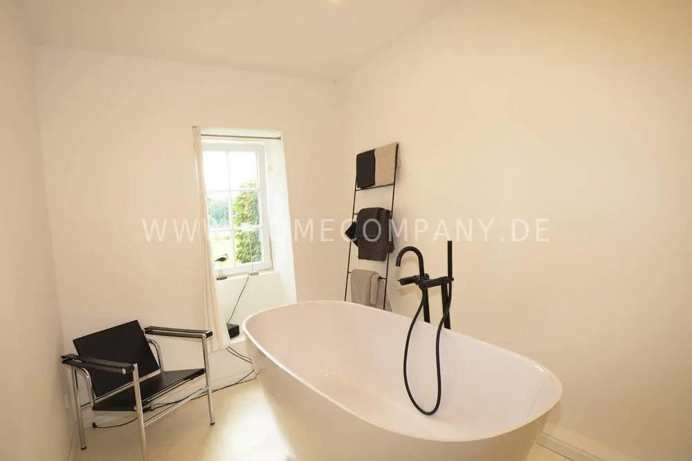 High-quality furnishing with designer furniture, high-quality, white leached floorboards. Exclusive bathroom with free-standing bathtub, fine sanitary furniture and fittings.