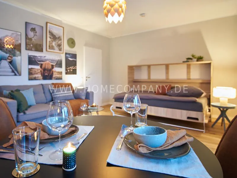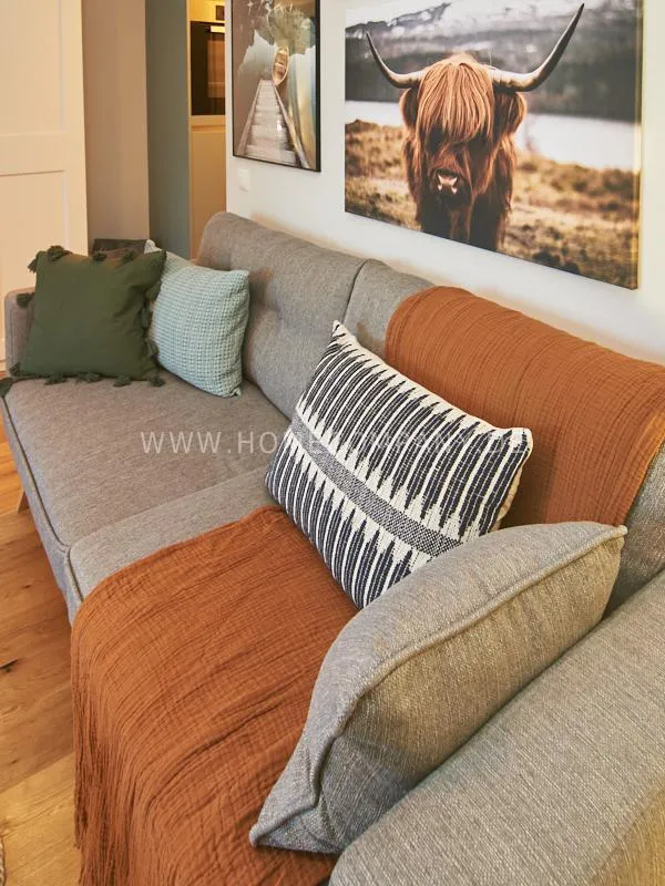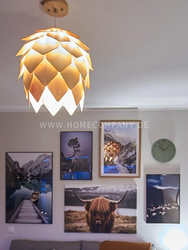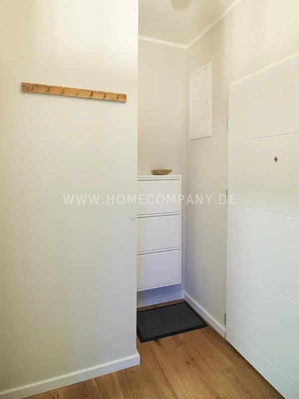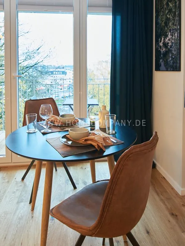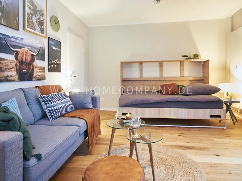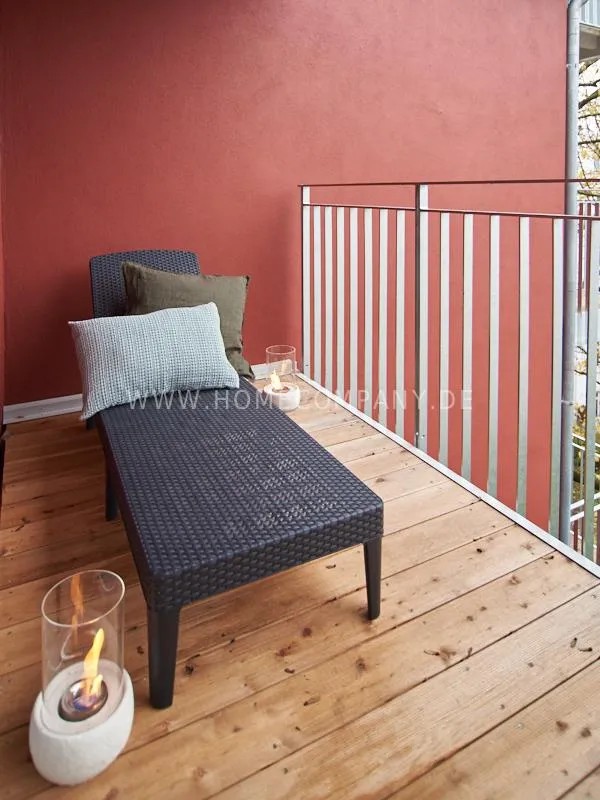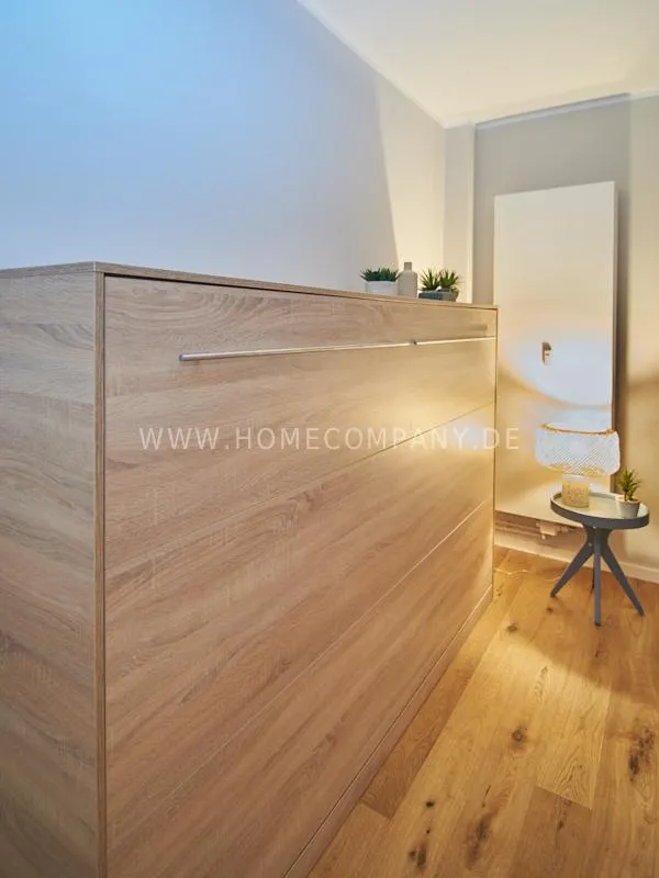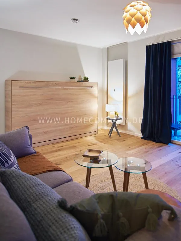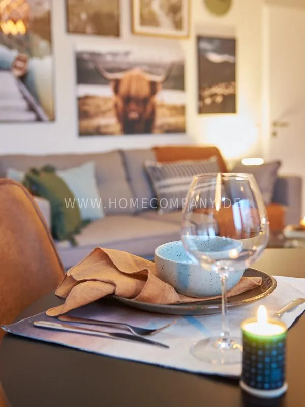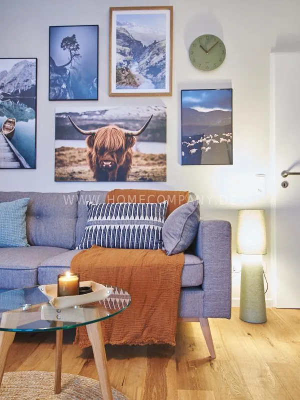 City apartment in a building renovated in 2019. The beautiful view of the quiet, green courtyard makes the special charm of the apartment. This is taken up and emphasized by the design of the interior. Targeted selection of furniture opens up the high recreational value of the balcony. The long-term aspect of maintenance is met by easy-care materials. The Murphy foldaway bed is 120x200cm in size. Thus, after a long, exhausting working day, after work hours in the open, the flickering glow of the ethanol table fire provides the necessary balance and the career-enhancing relaxation can be enjoyed. Natural materials such as wood, linen and leather define the concept of "soft nature". A picture gallery thematizes calm, original nature motives: Highland cattle, rugged mountain motives, fresh, cool pine forest. A pine lampshade, in the form of a pine cone, takes up the world of images in three dimensions. Earth, green and blue tones provide a relaxed sense of living and find a counterpart in the accessories.