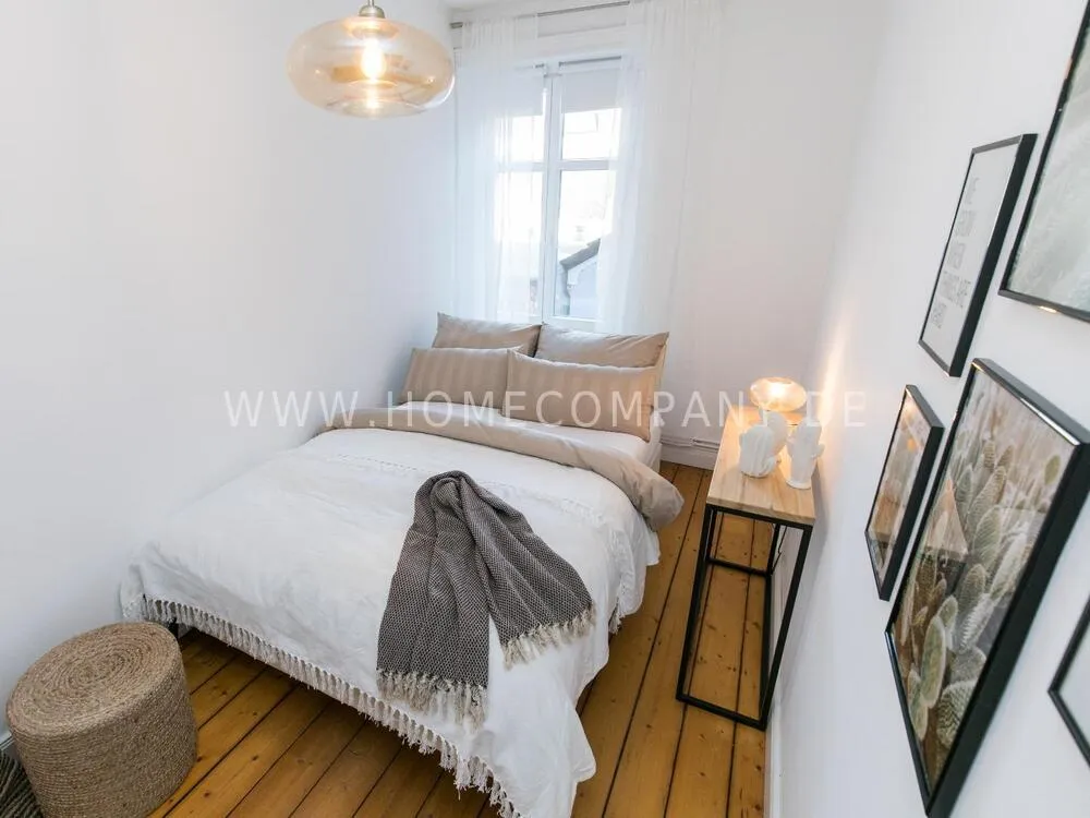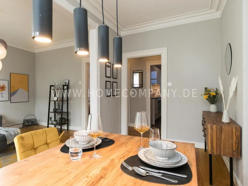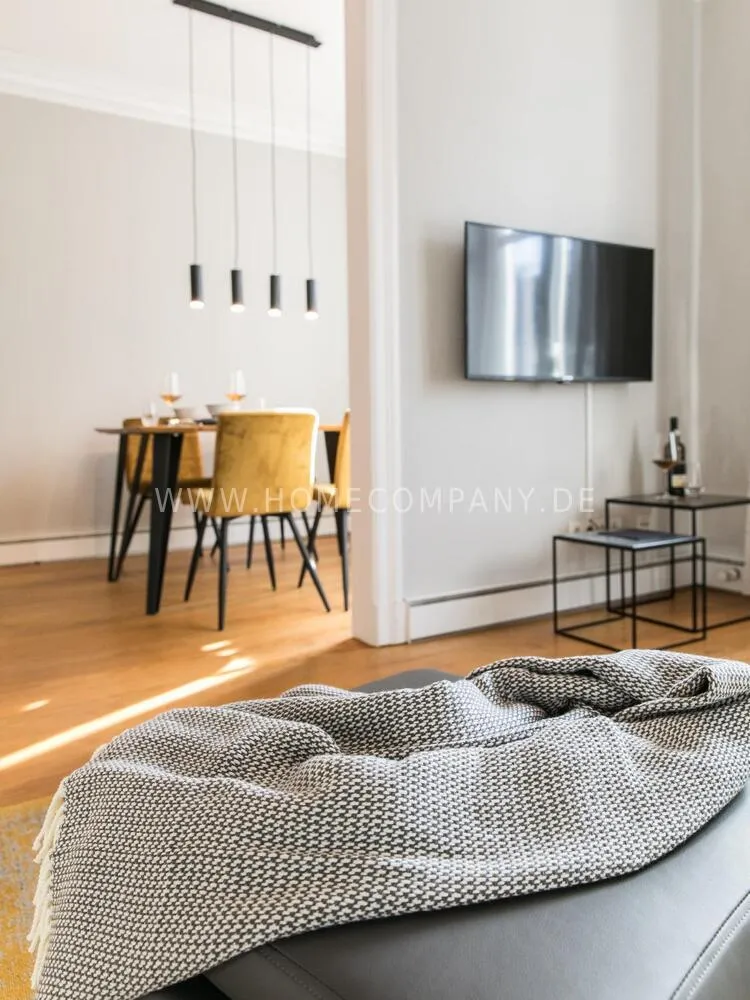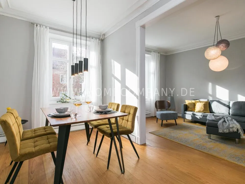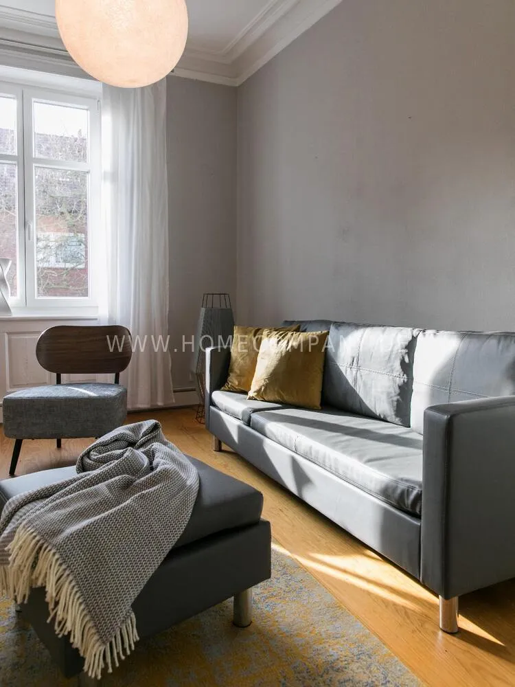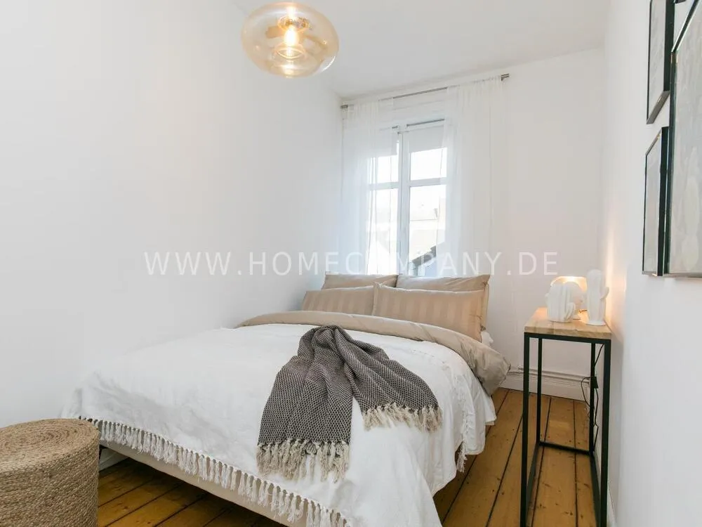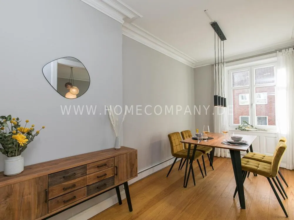 The apartment, newly furnished in 2021, on the quiet edge of the popular Schanzenviertel, impresses with its homely and cozy atmosphere. The skirting board heating ensures pleasant room air and even heat distribution. The Pitchpine-floorboards, the subtle stucco in the living and dining area and the beautiful window cladding also contribute to the feel-good atmosphere.